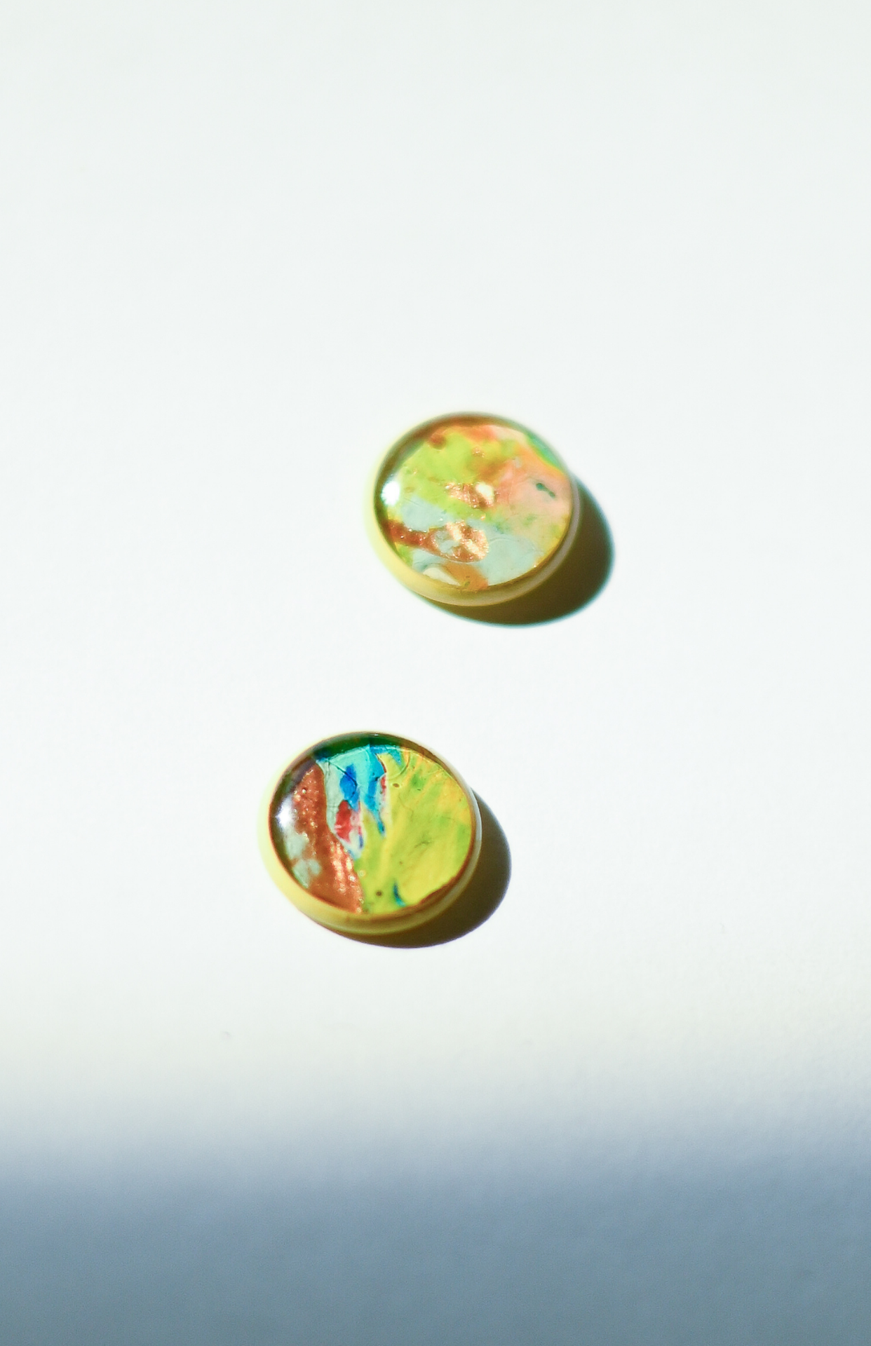 Náušnice s ručně malovanou abstrakcí zatavenou navěky v pryskyřici. Každá z páru je individuál, ale navzájem se doplňují.