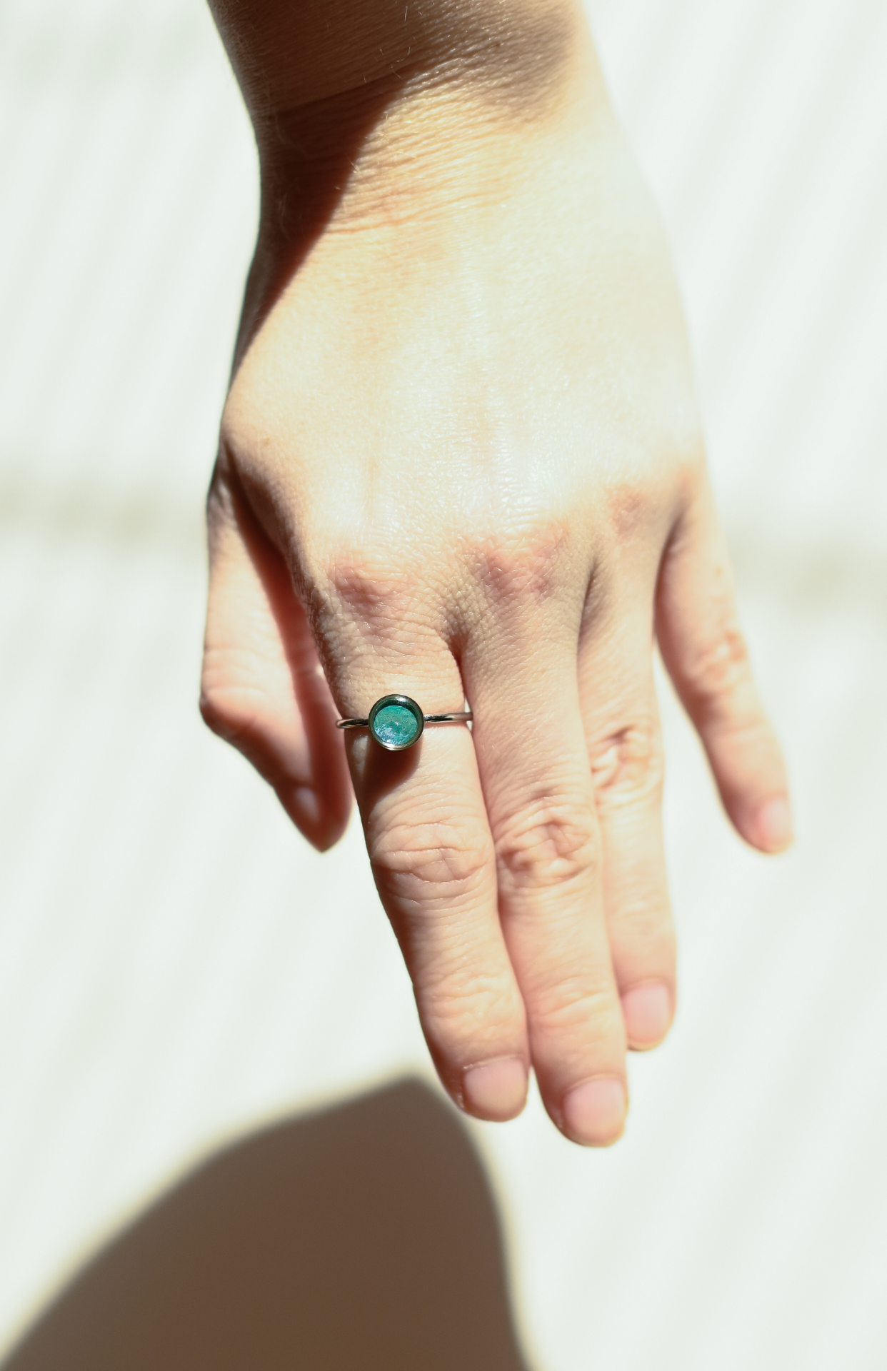 Prsten s ručně malovanou abstrakcí zatavenou navěky v pryskyřici. Velikost je nastavitelná.