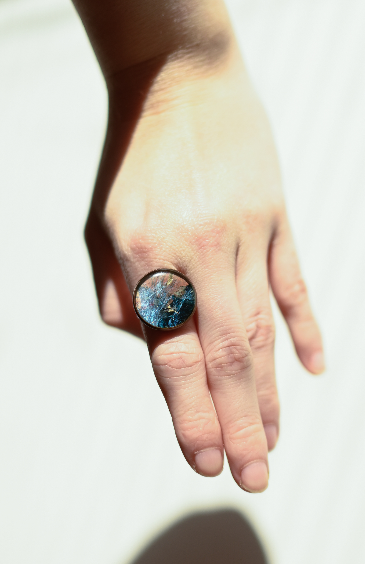 Prsten s ručně malovanou abstrakcí zatavenou navěky v pryskyřici. Velikost je nastavitelná.