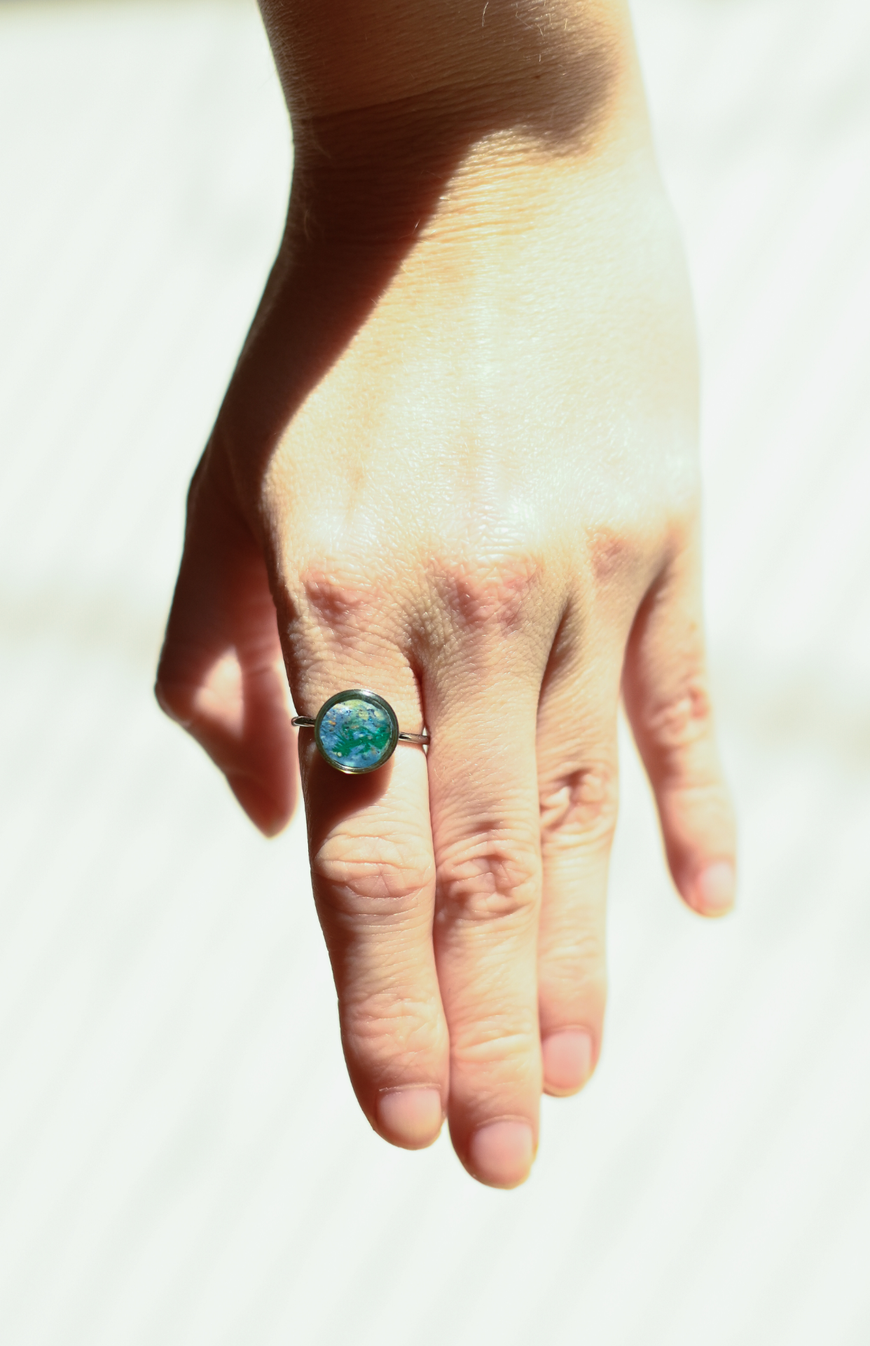 Prsten s ručně malovanou abstrakcí zatavenou navěky v pryskyřici. Velikost je nastavitelná.