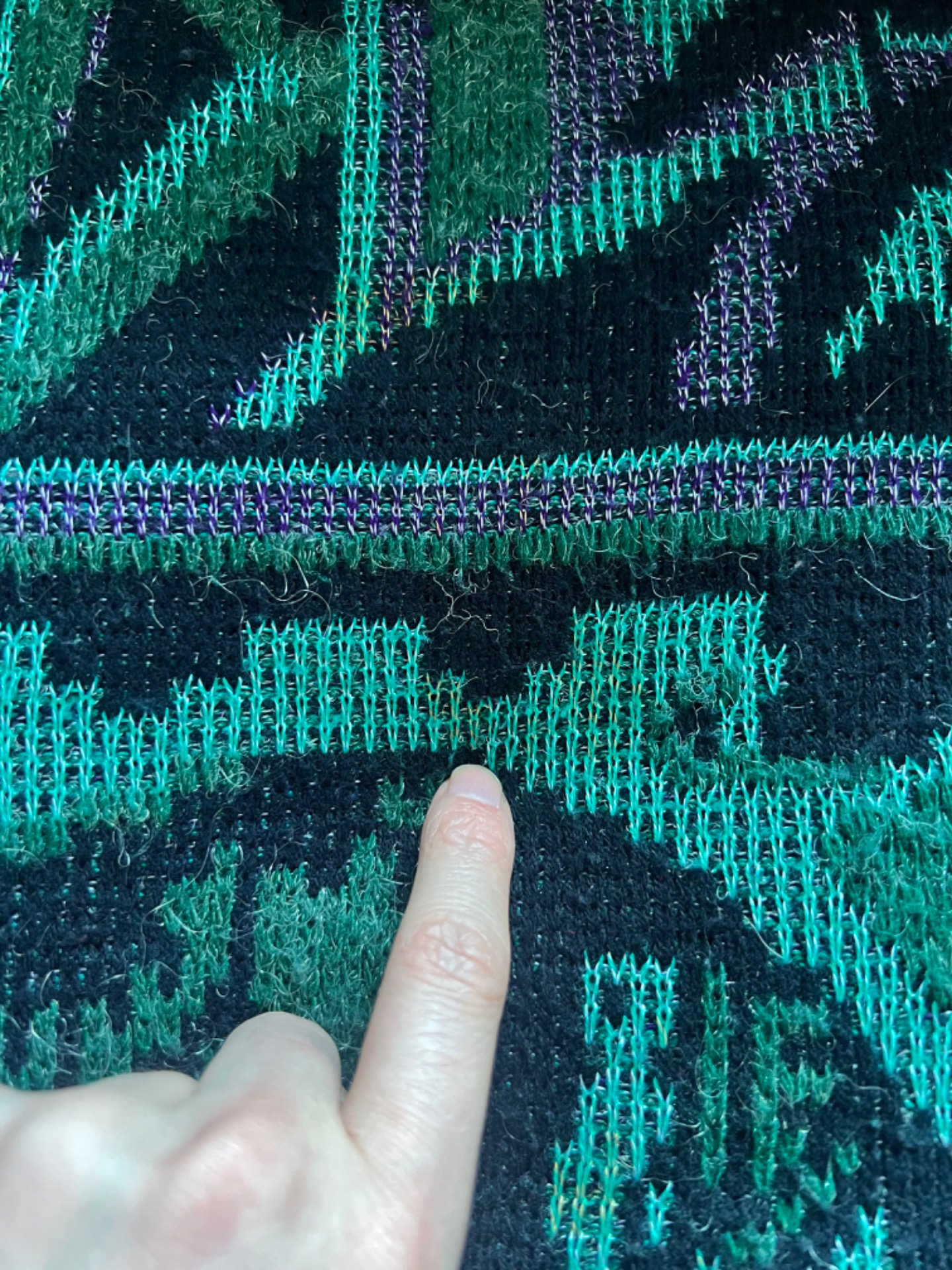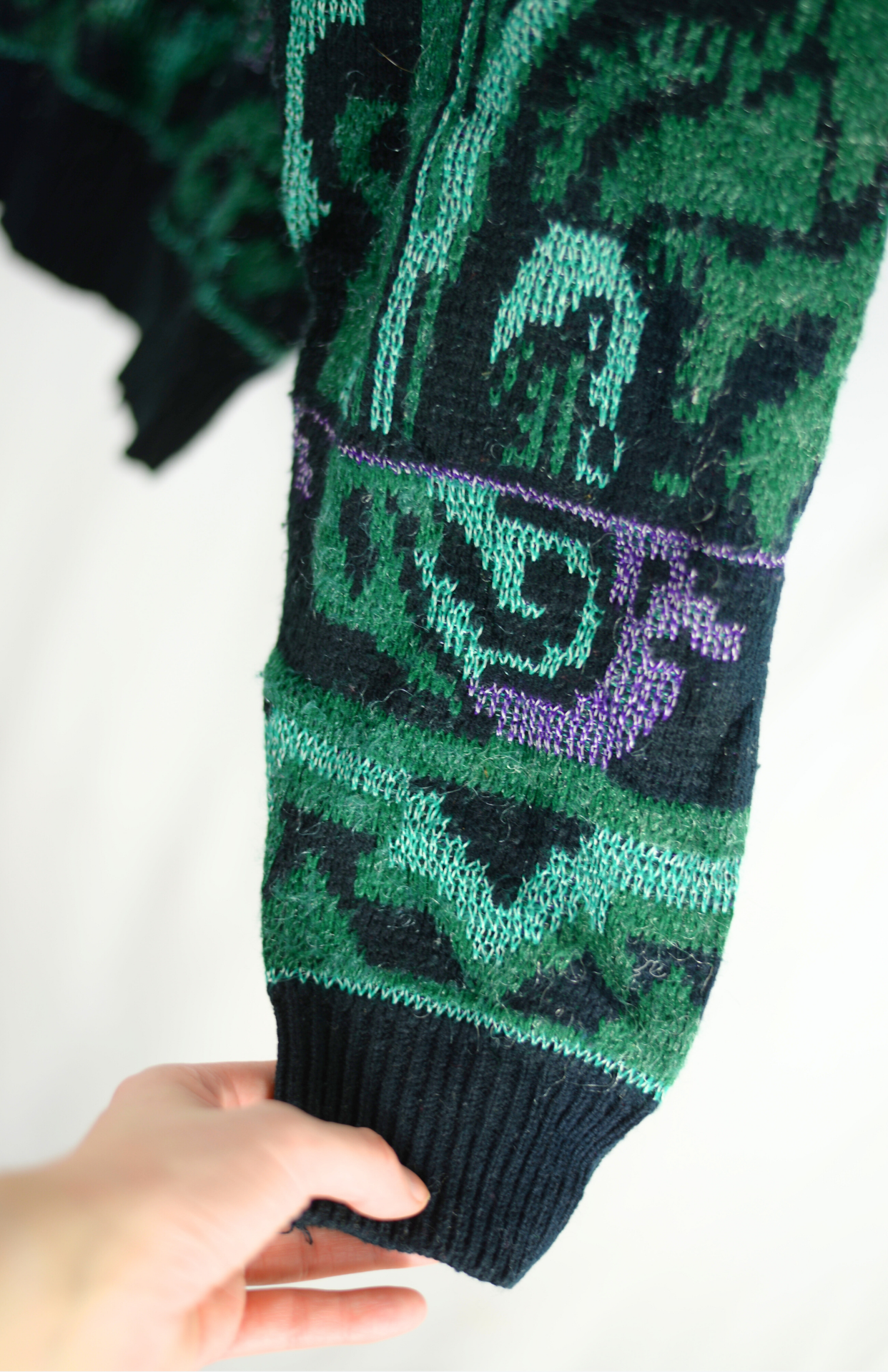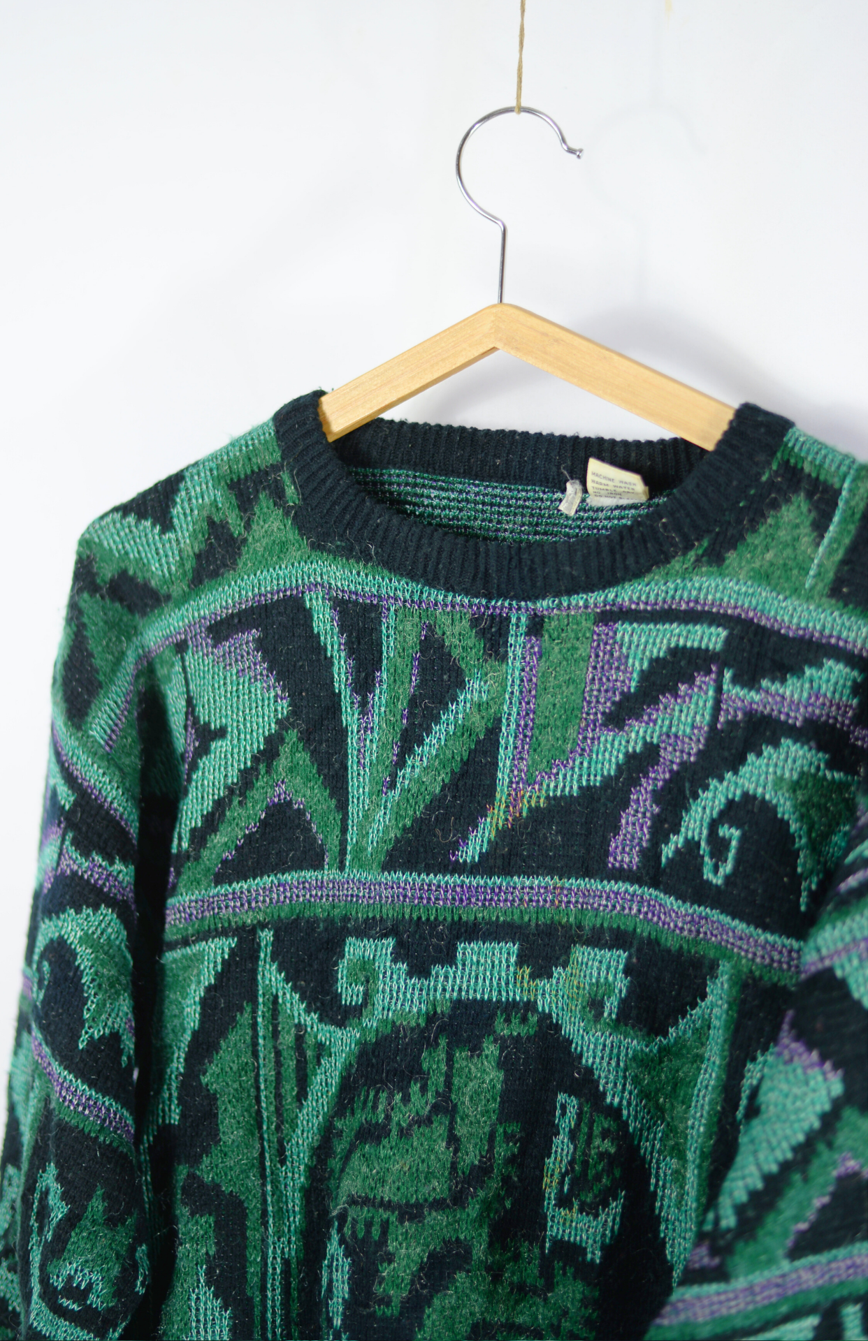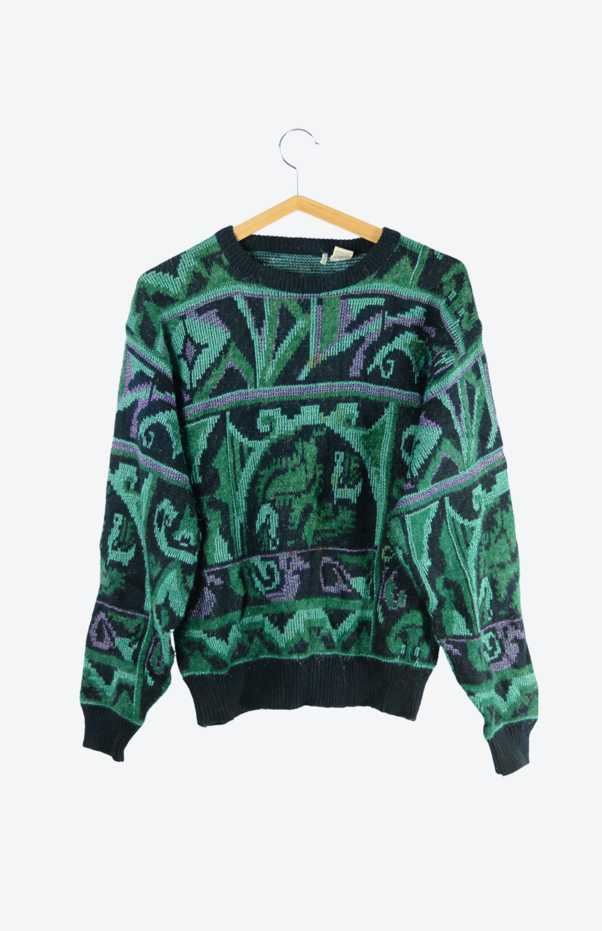 Vintage svetr s funky abstraktním vzorem. Má lehce nabíraný rukáv a středně silný úplet. Originální a pěkně zpracovaný.