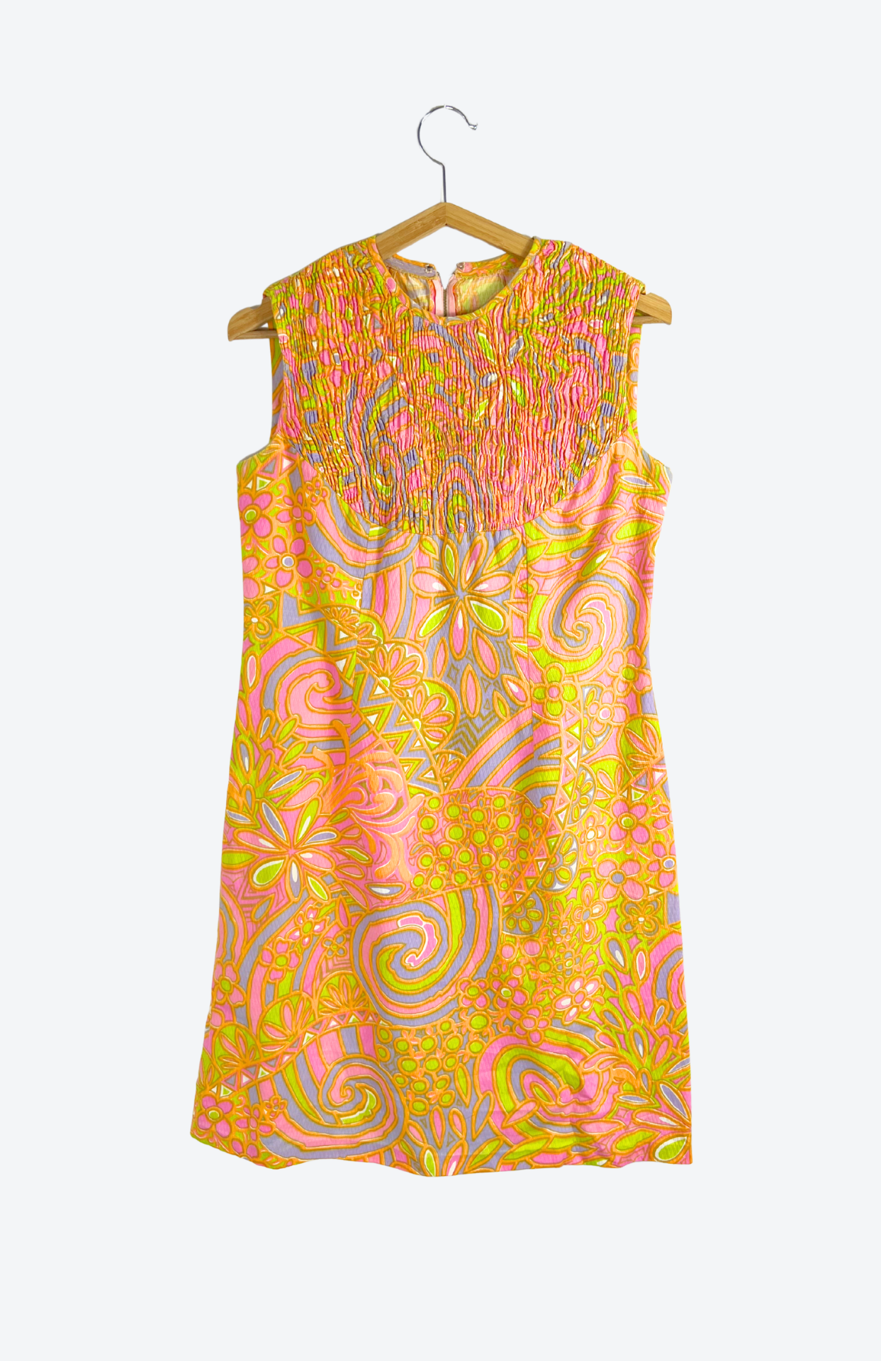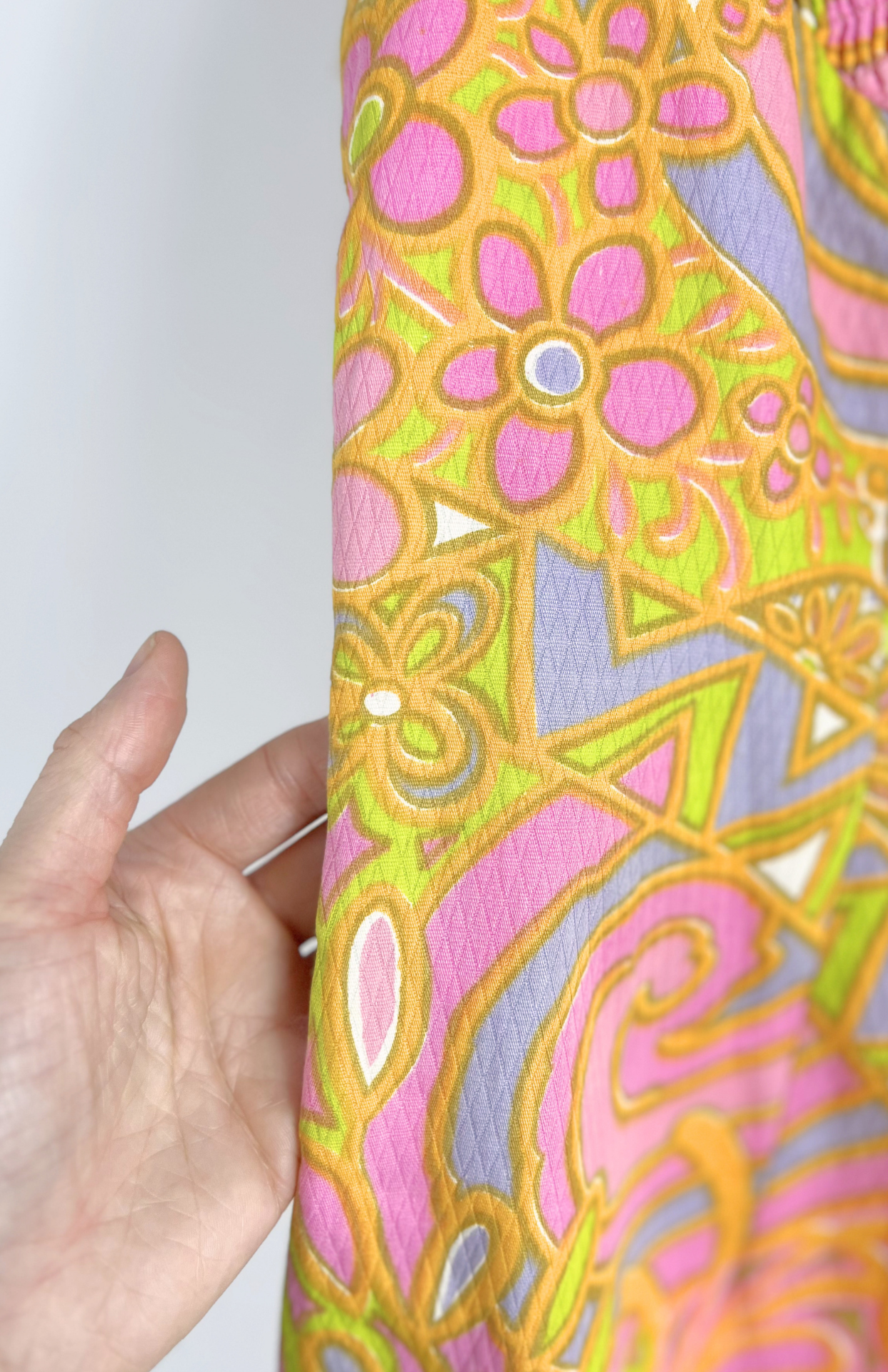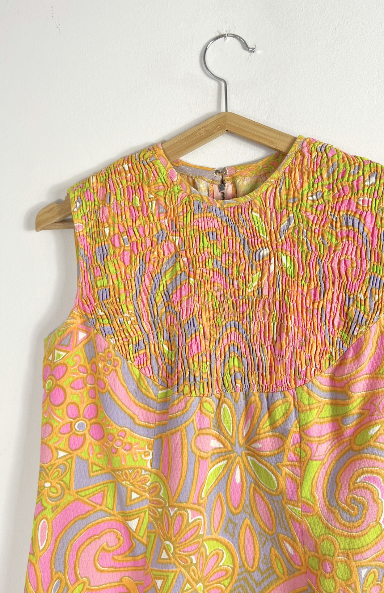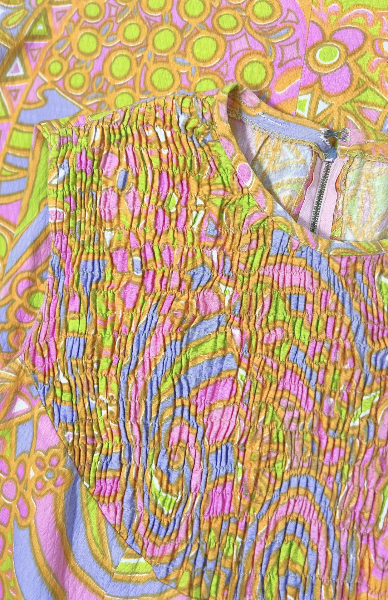 Barevné vzorované 70´s retro šaty. Pěkné pastelové barvy, geo vzor a zajímavá struktura v horní části. Vzadu se zapínáním na zip.