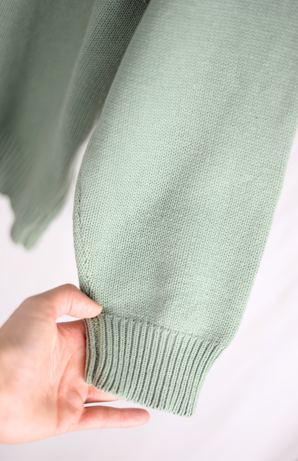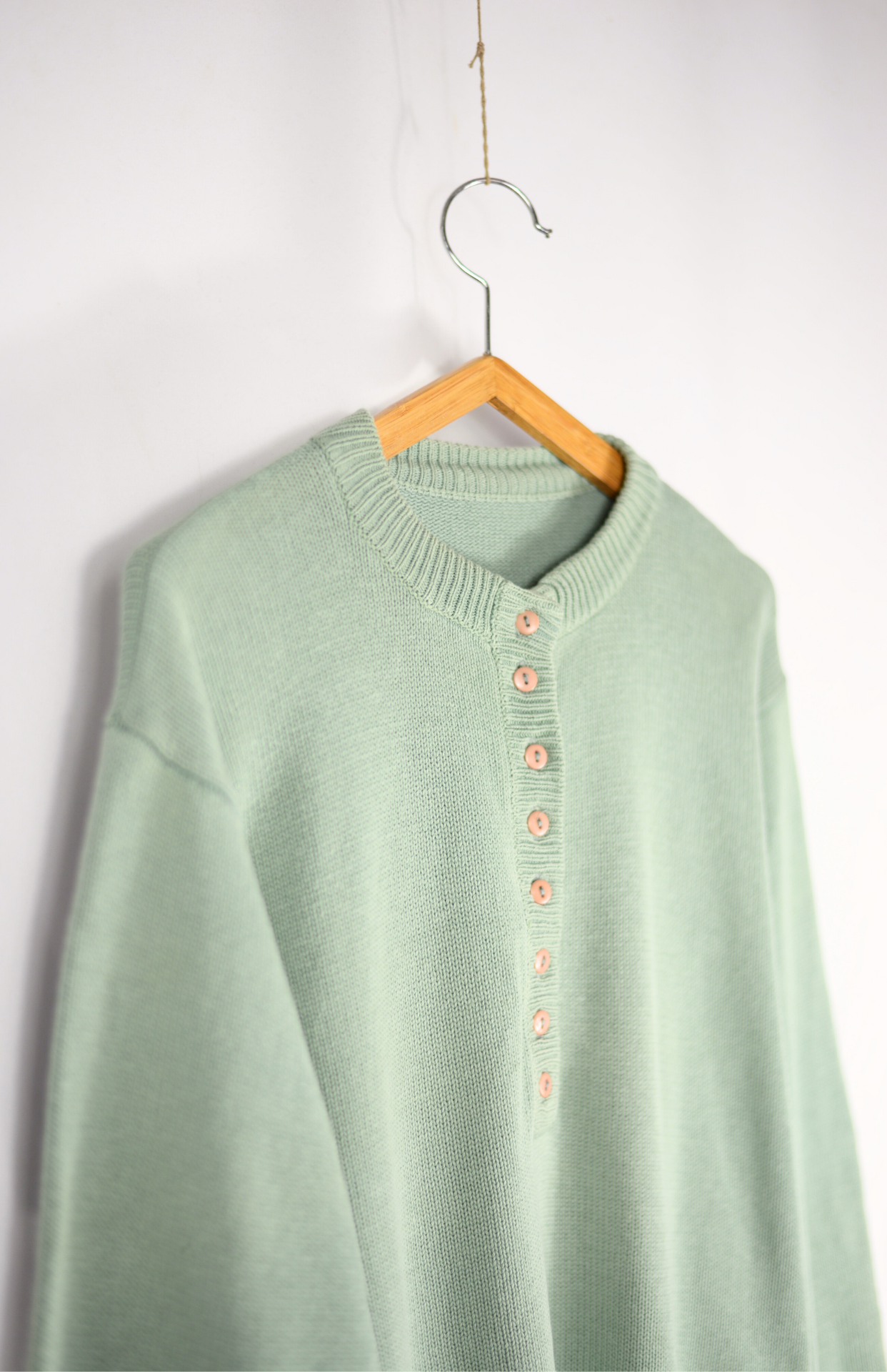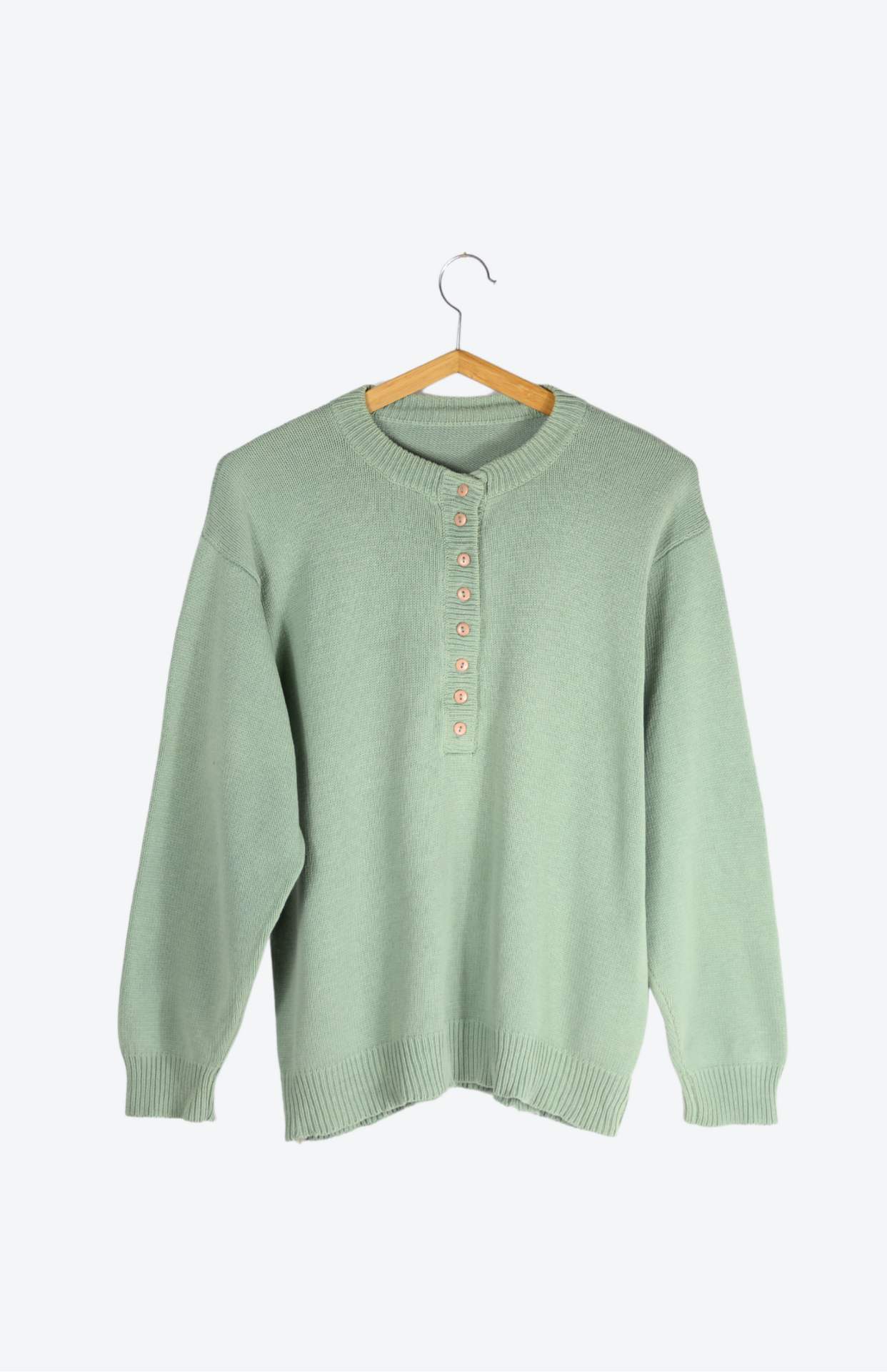 Bavlněný mint svetr s krémovými knoflíčky. Má lehce nabíraný rukáv a rovný volný střih.Stav: Vintage kousek v perfektním stavu, bez vad.