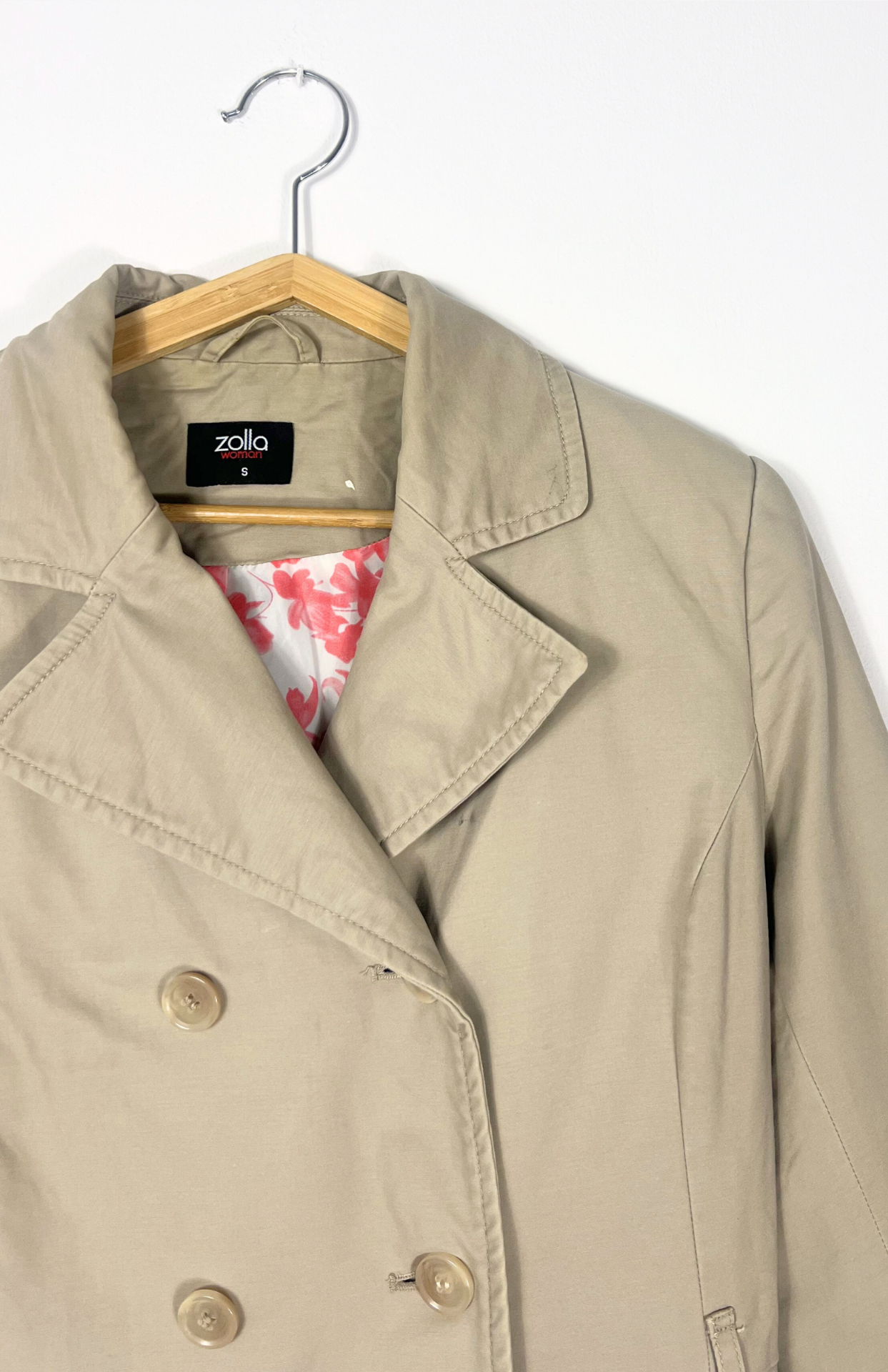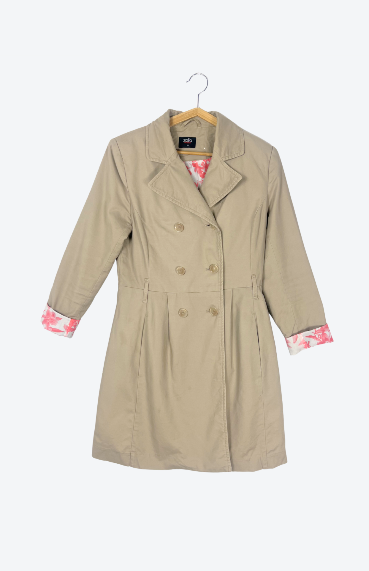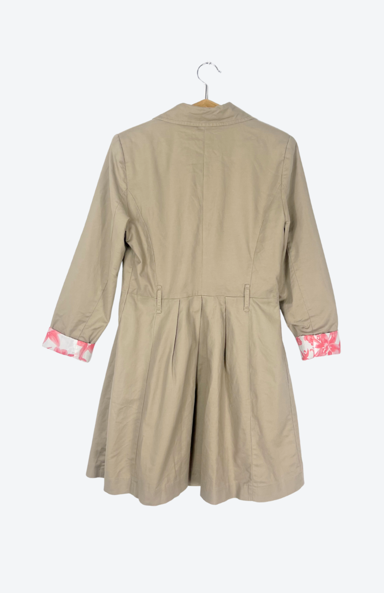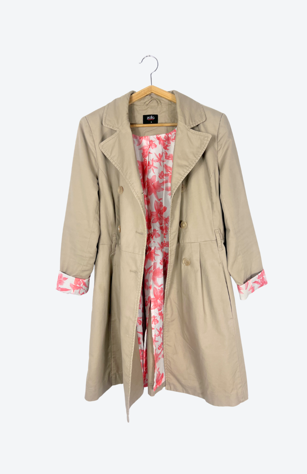 Beige retro trench coat s květinovým detailem a podšívkou. Má sukňový střih se zvýrazněným pasem a propínání na knoflíky. Kapsy po stranách.Stav: Ve skvělém stavu, bez vad.