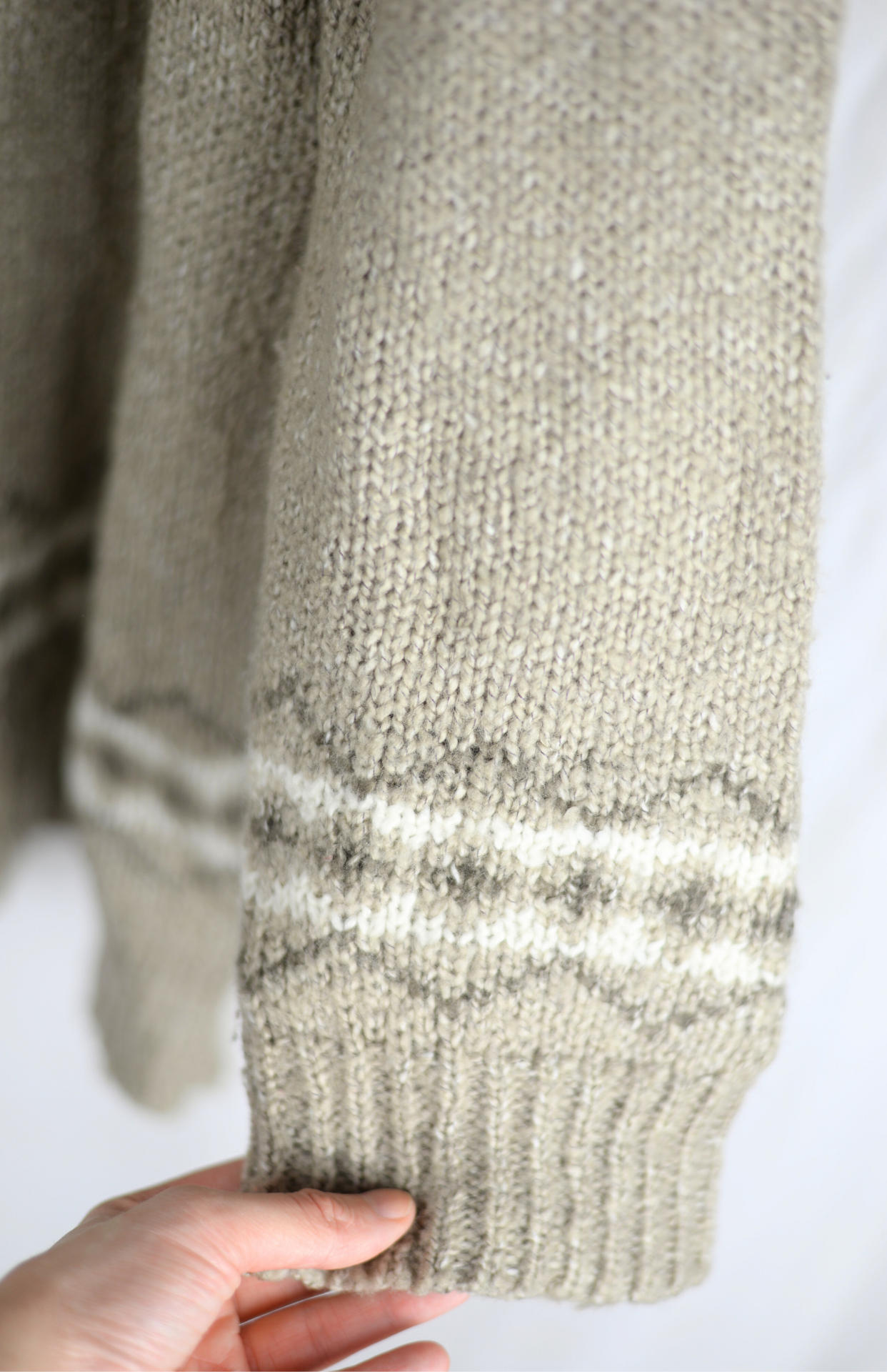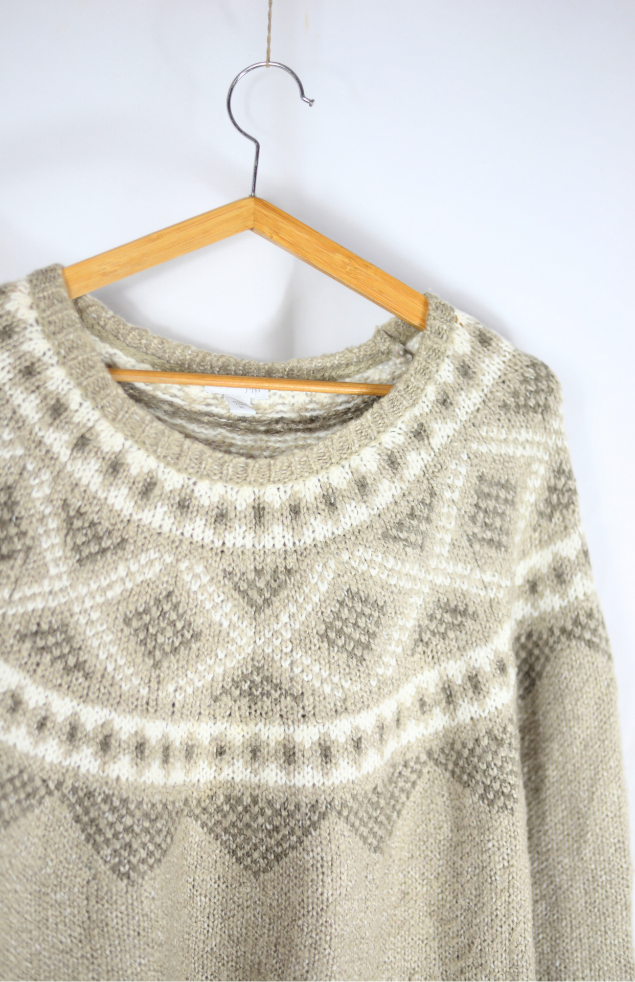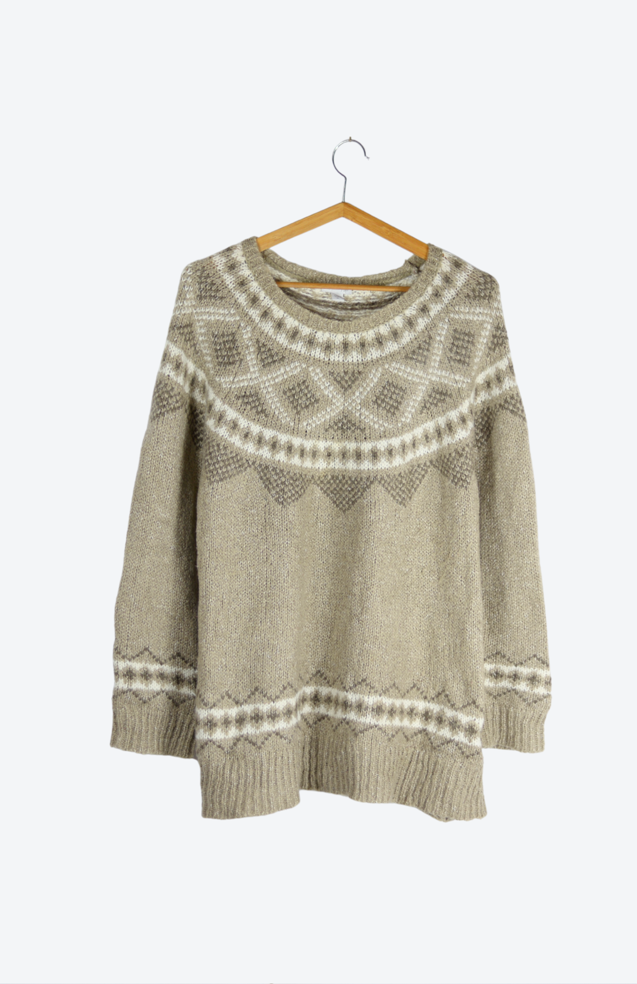 Beige vintage svetr s norskými vzory. Příjemný hebký hřejivý úplet. Má delší střih a vzorované detaily.