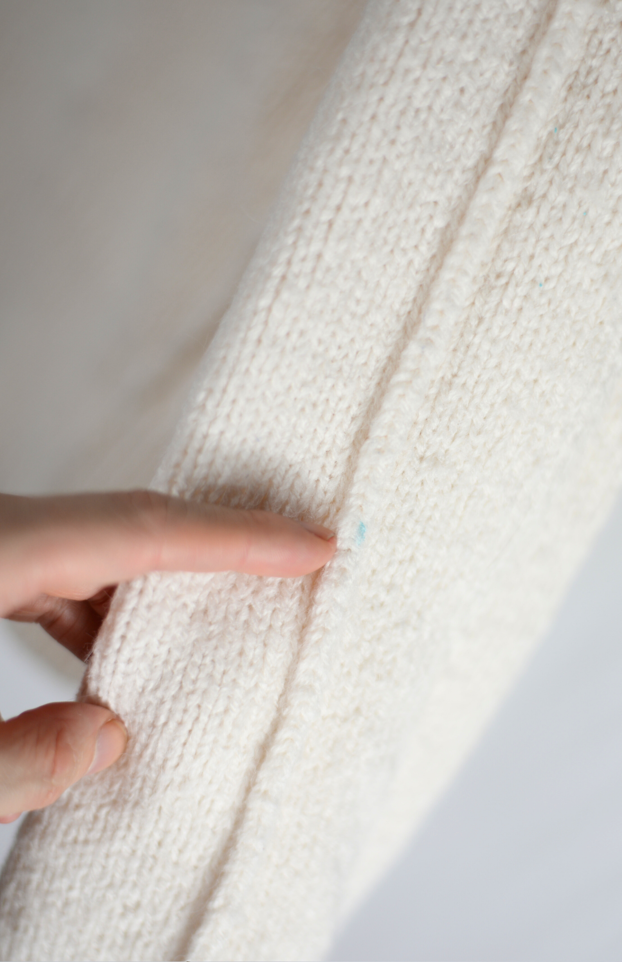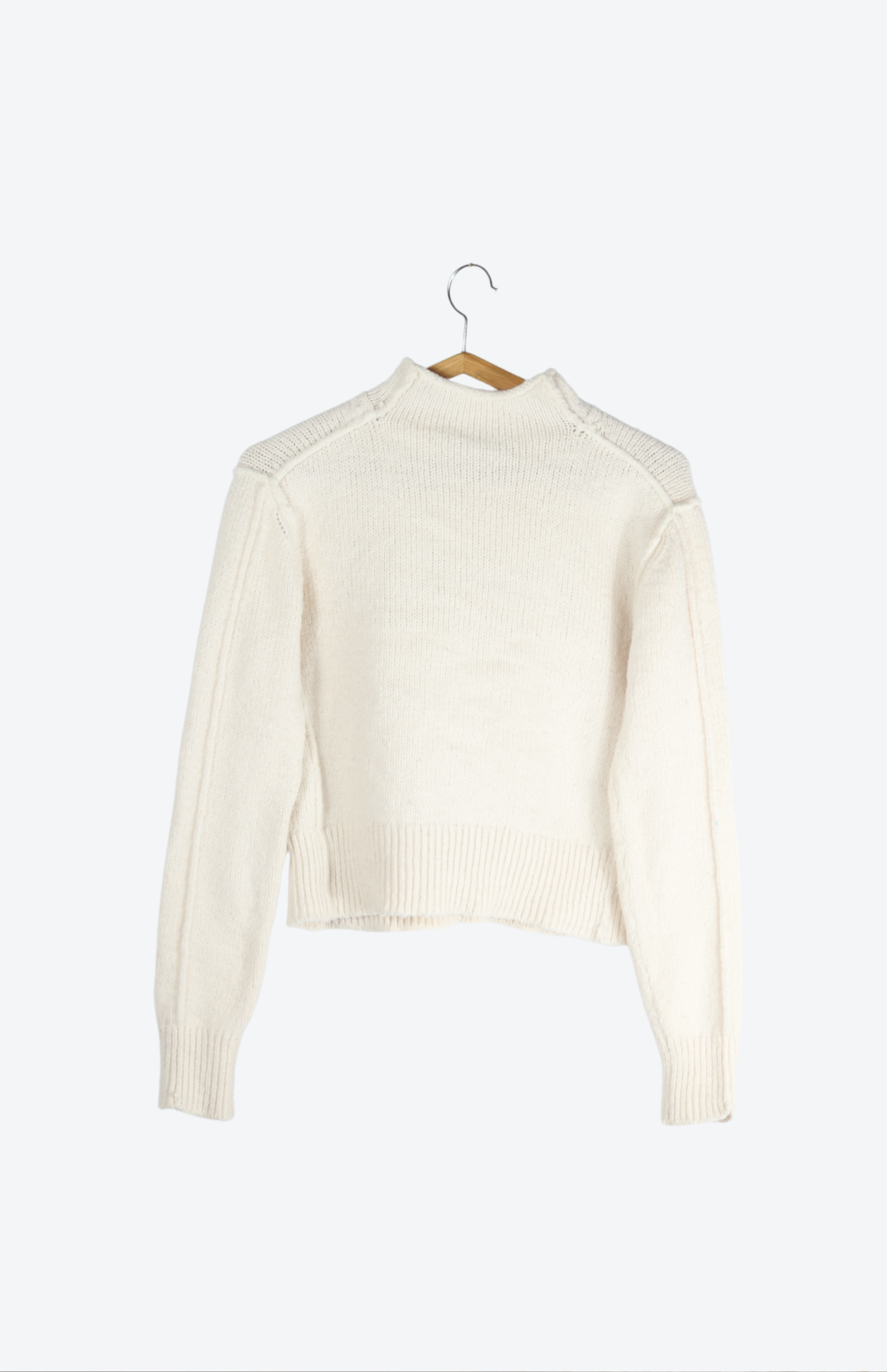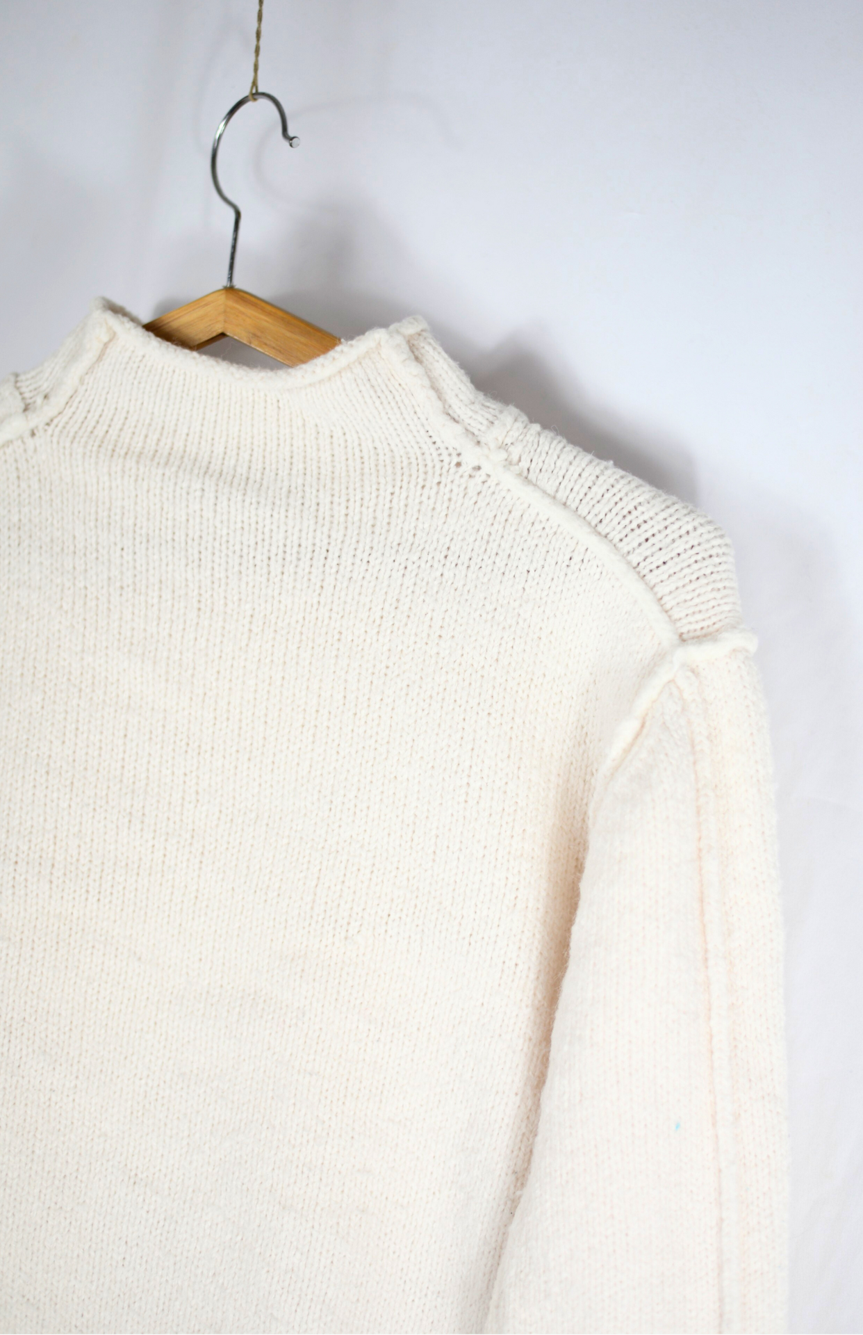 Bílý silný rolák s hrubými švy. Má stojáček u krku a kratší střih.Stav: Pěkný stav, pouze dvě drobné světle modré skvrny na jednom rukávu.