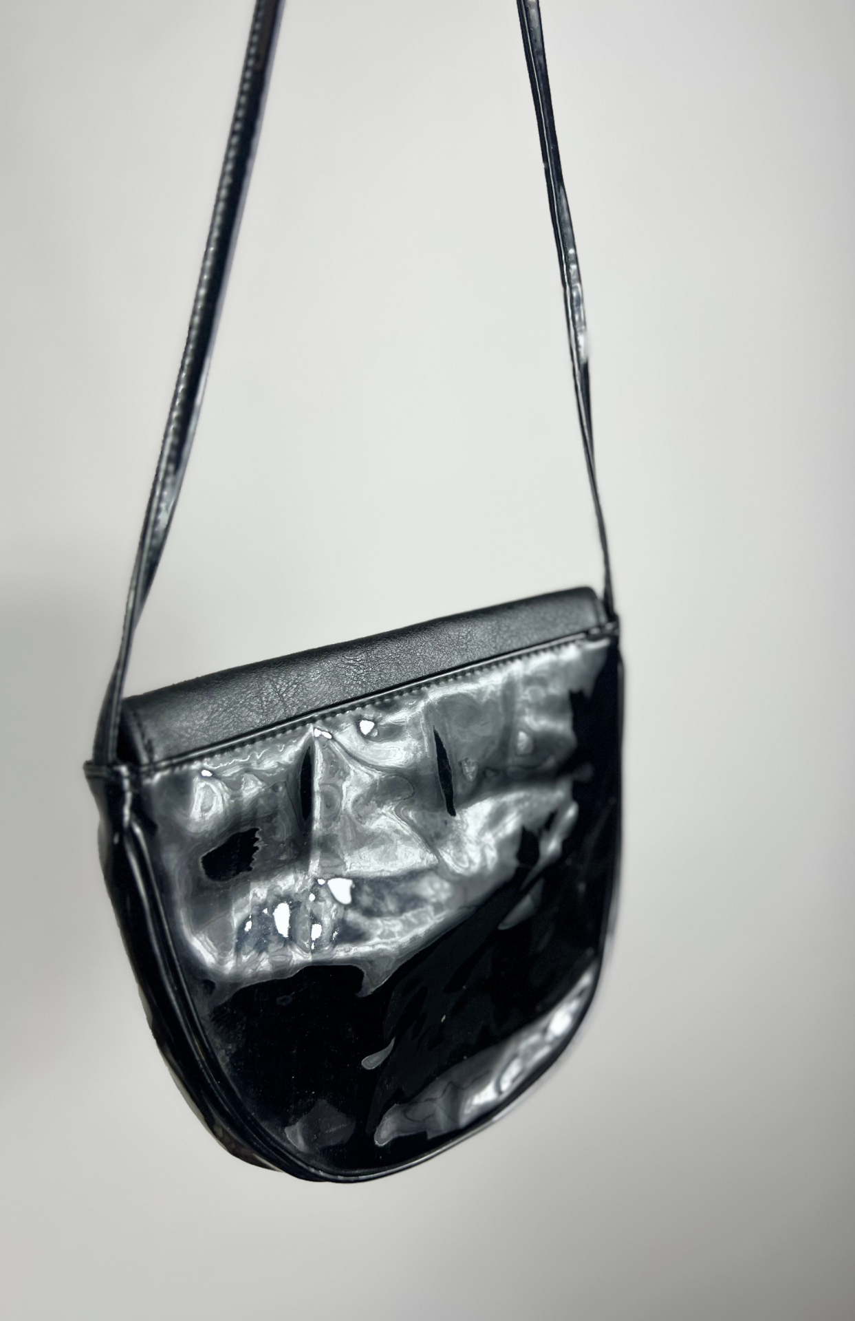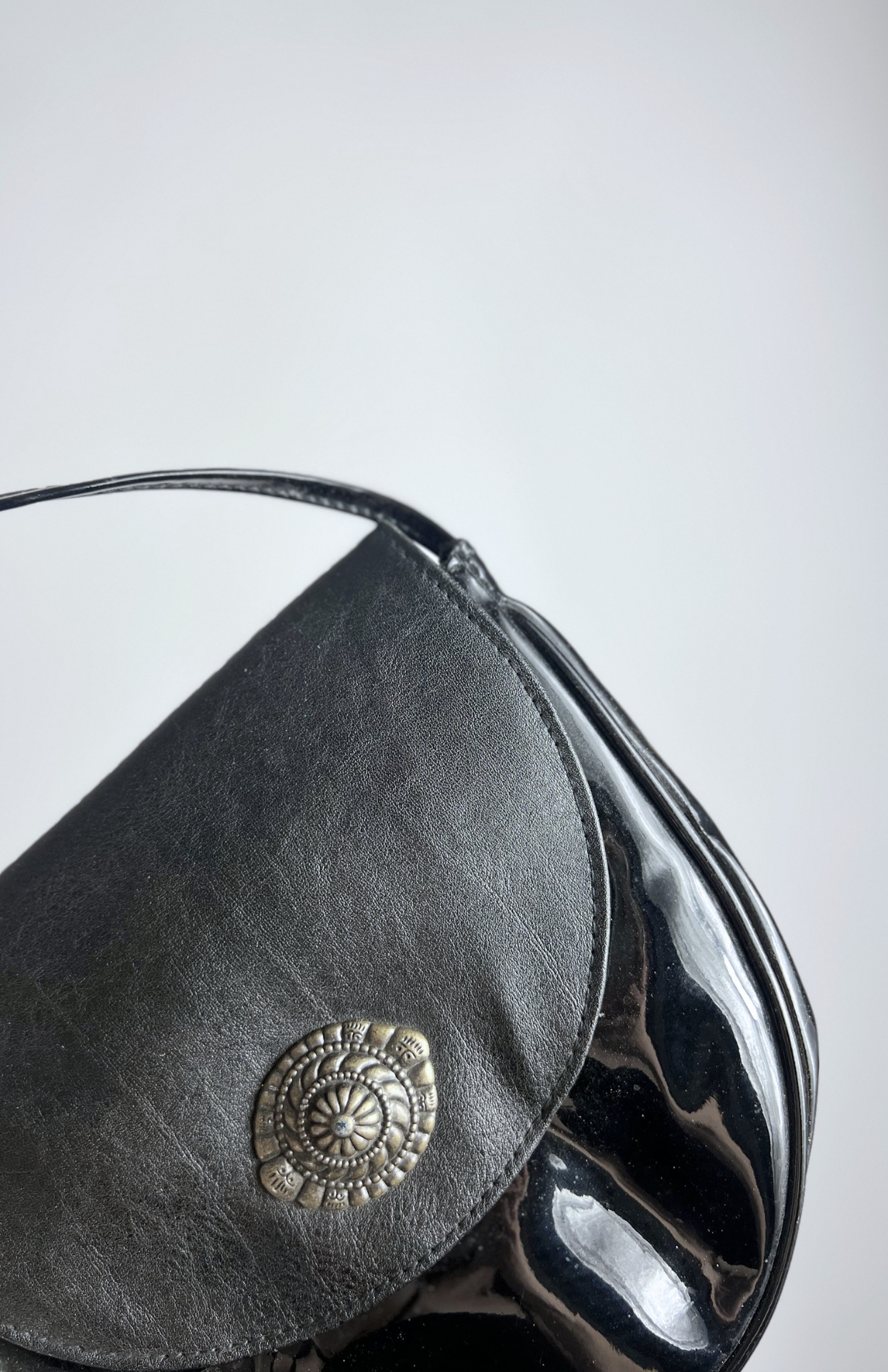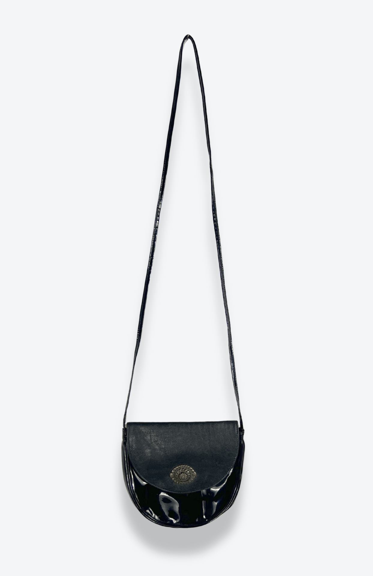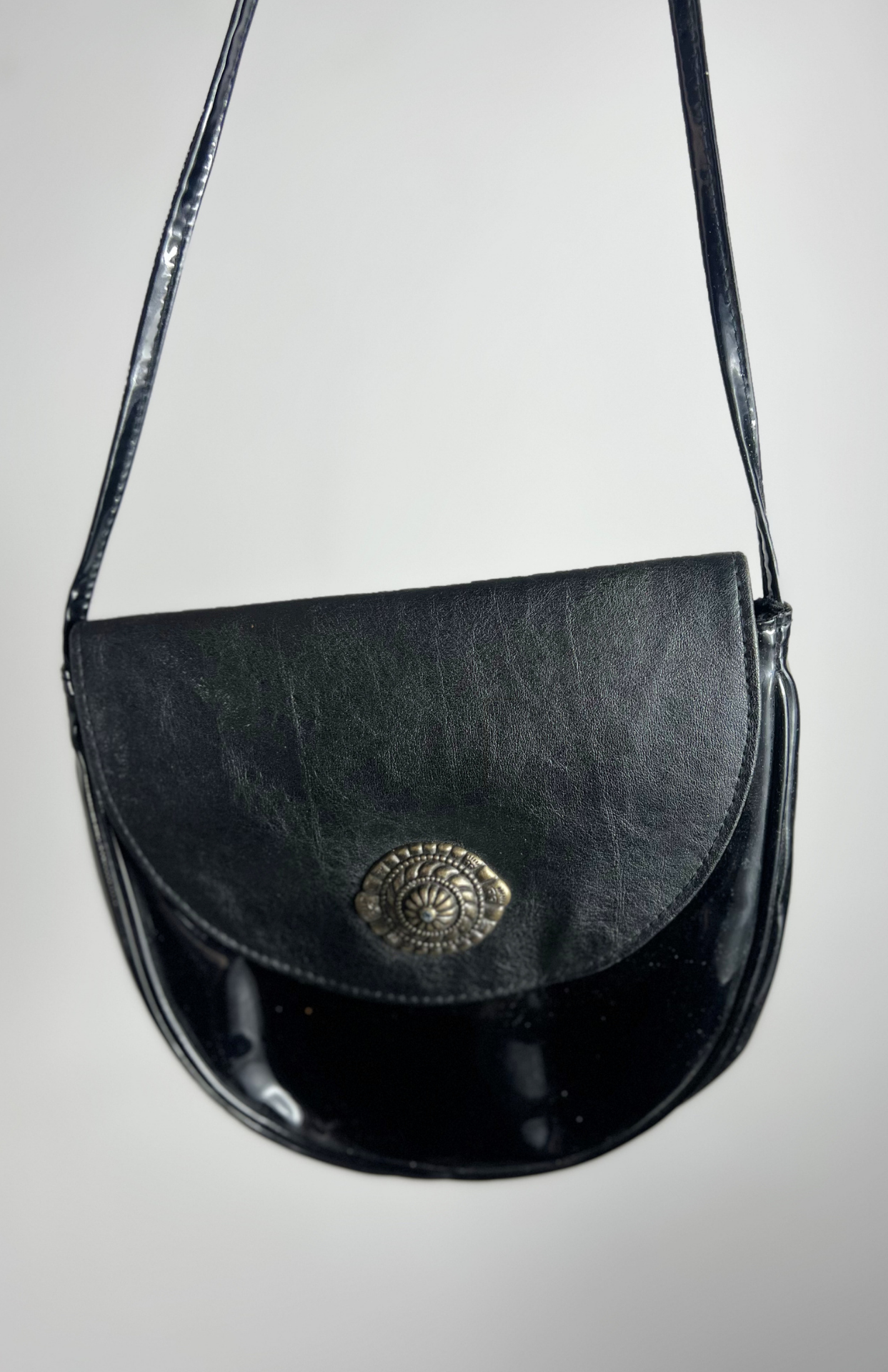 Boho lesklá kabelka se zdobenou přezkou. Má dlouhý tenký popruh a zapínání na patent.
