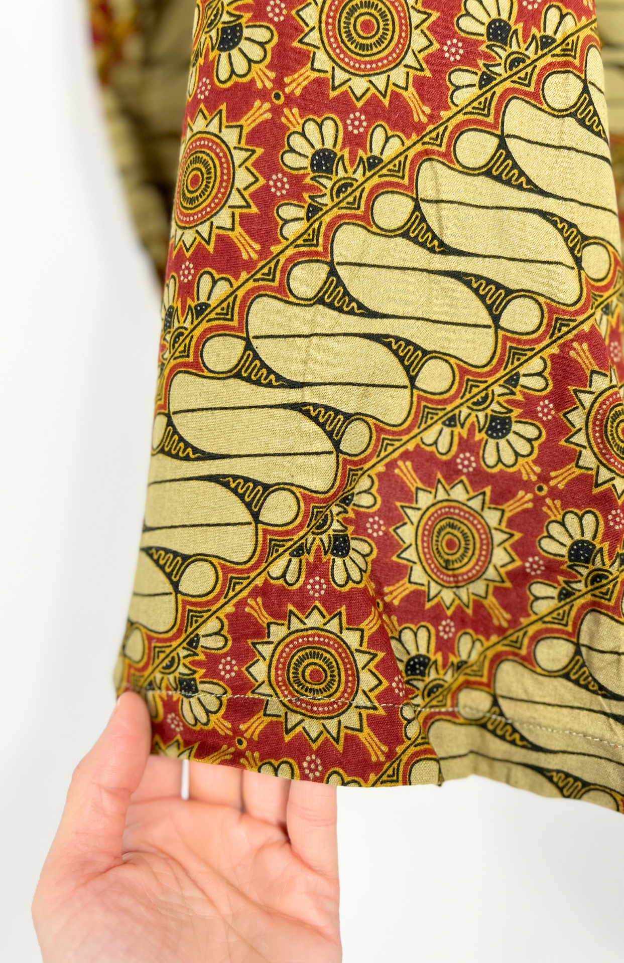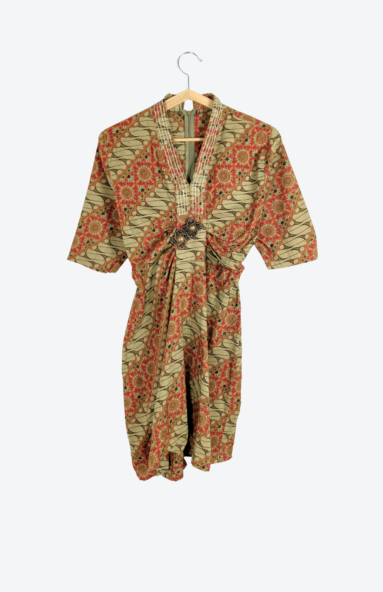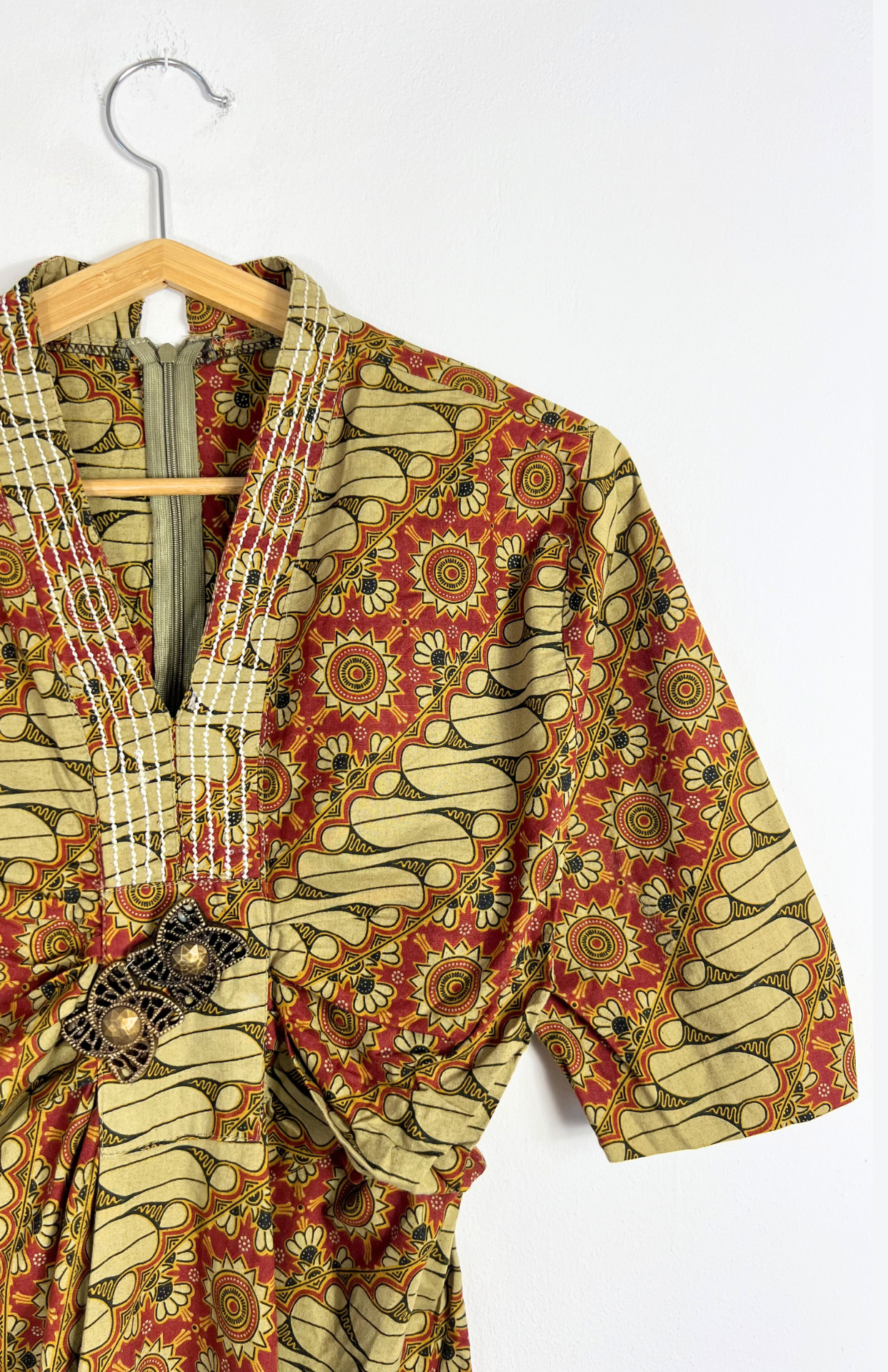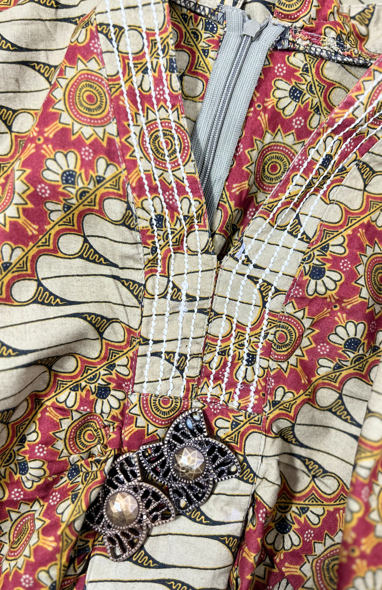 Boho vzorované šaty s korálkovou sponou. Krásné zemité barvy a ornamentální vzor. Mají střih který zvýrazní pas a pěkné detaily. Vzadu na zip. Nejspíše šité švadlenkou.