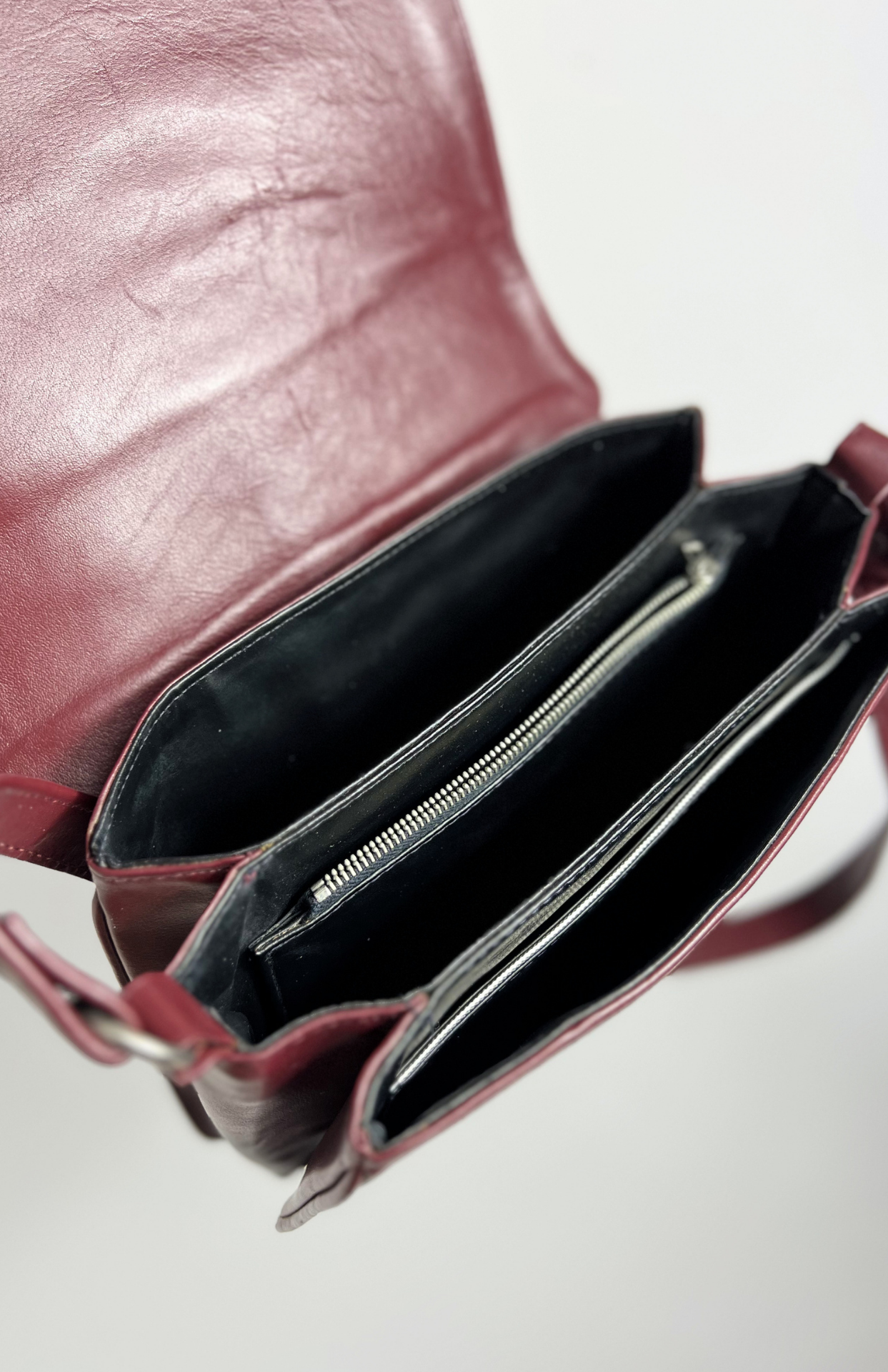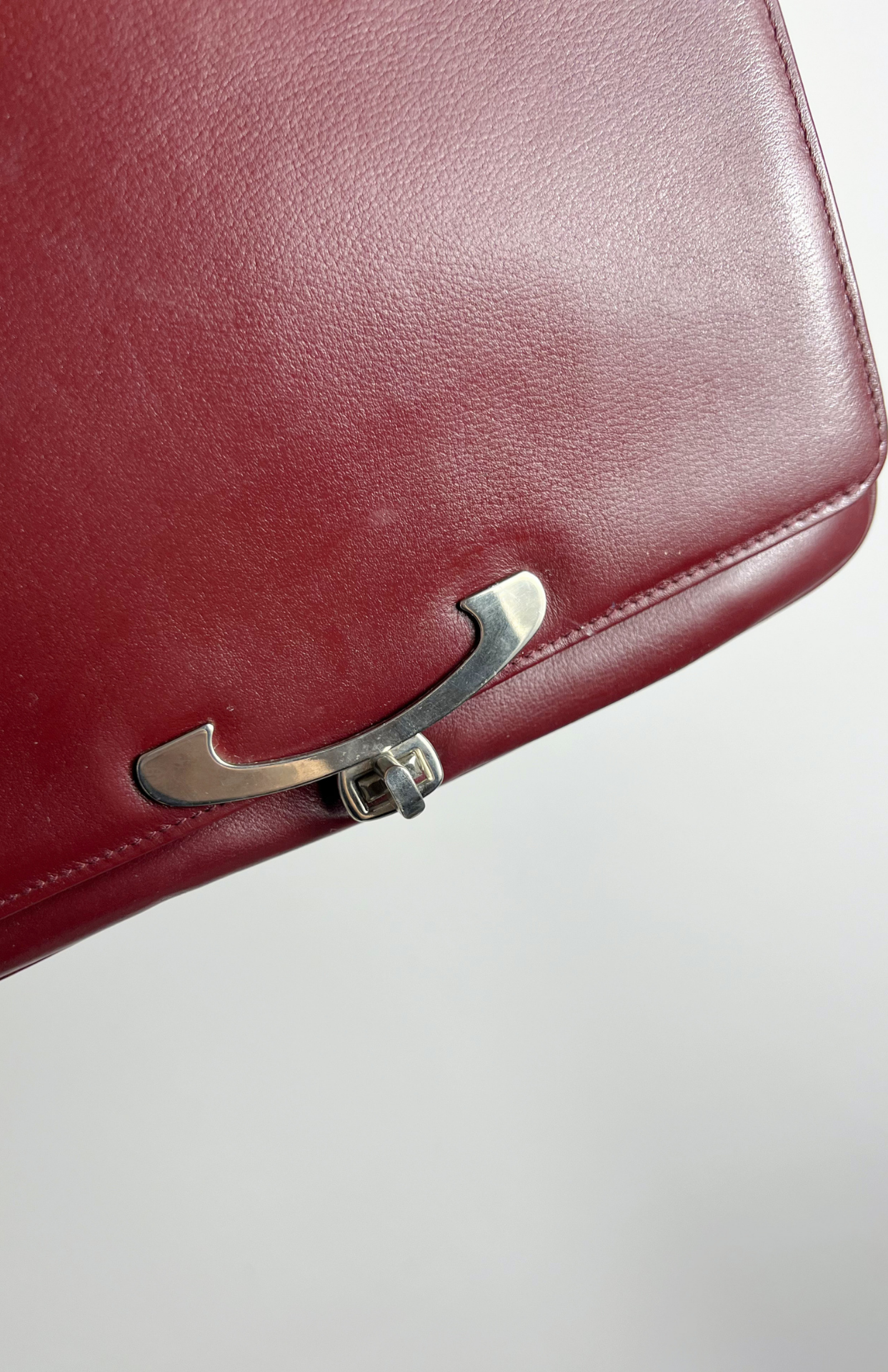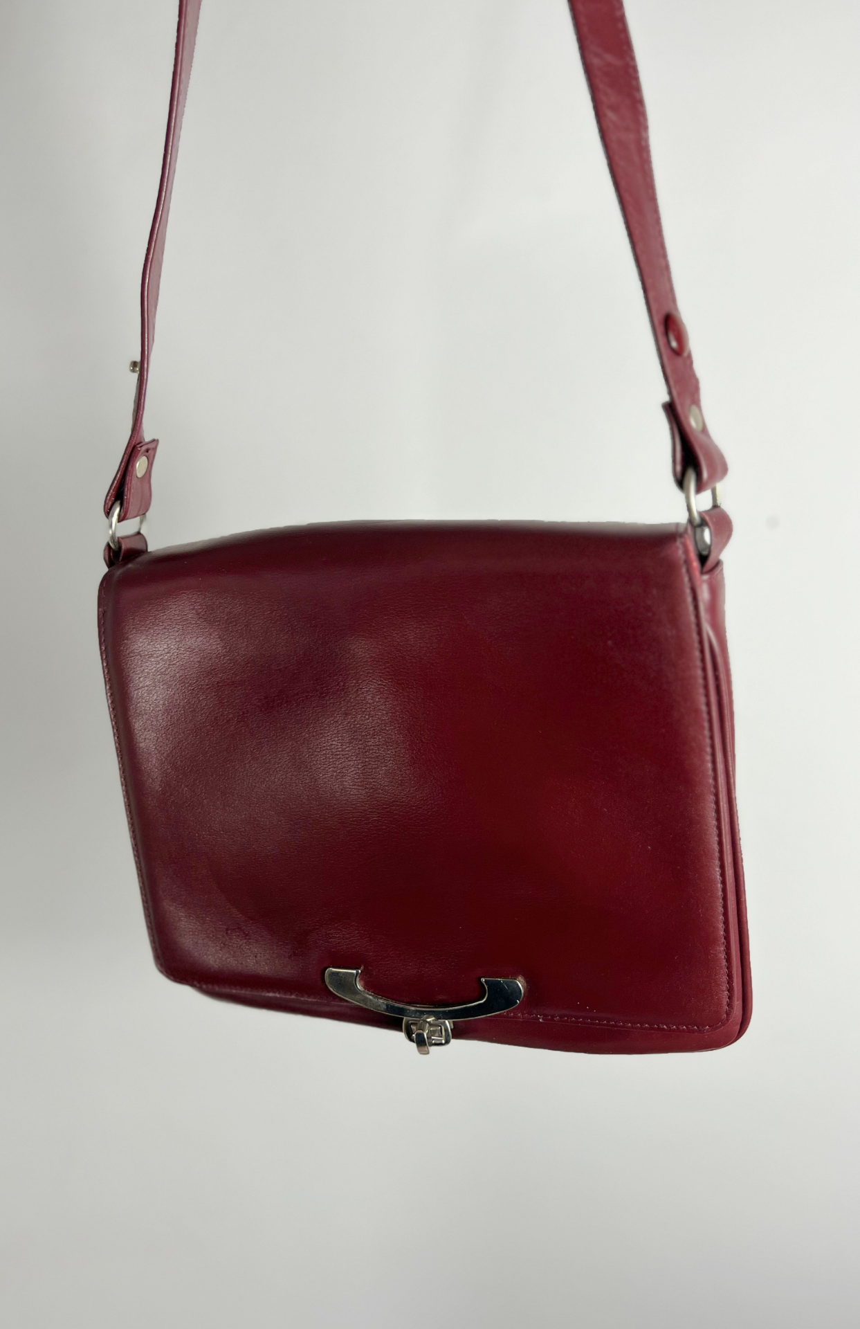 Burgundy retro kabelka. Má otáčecí zapínání, uvnitř několik přihrádek.