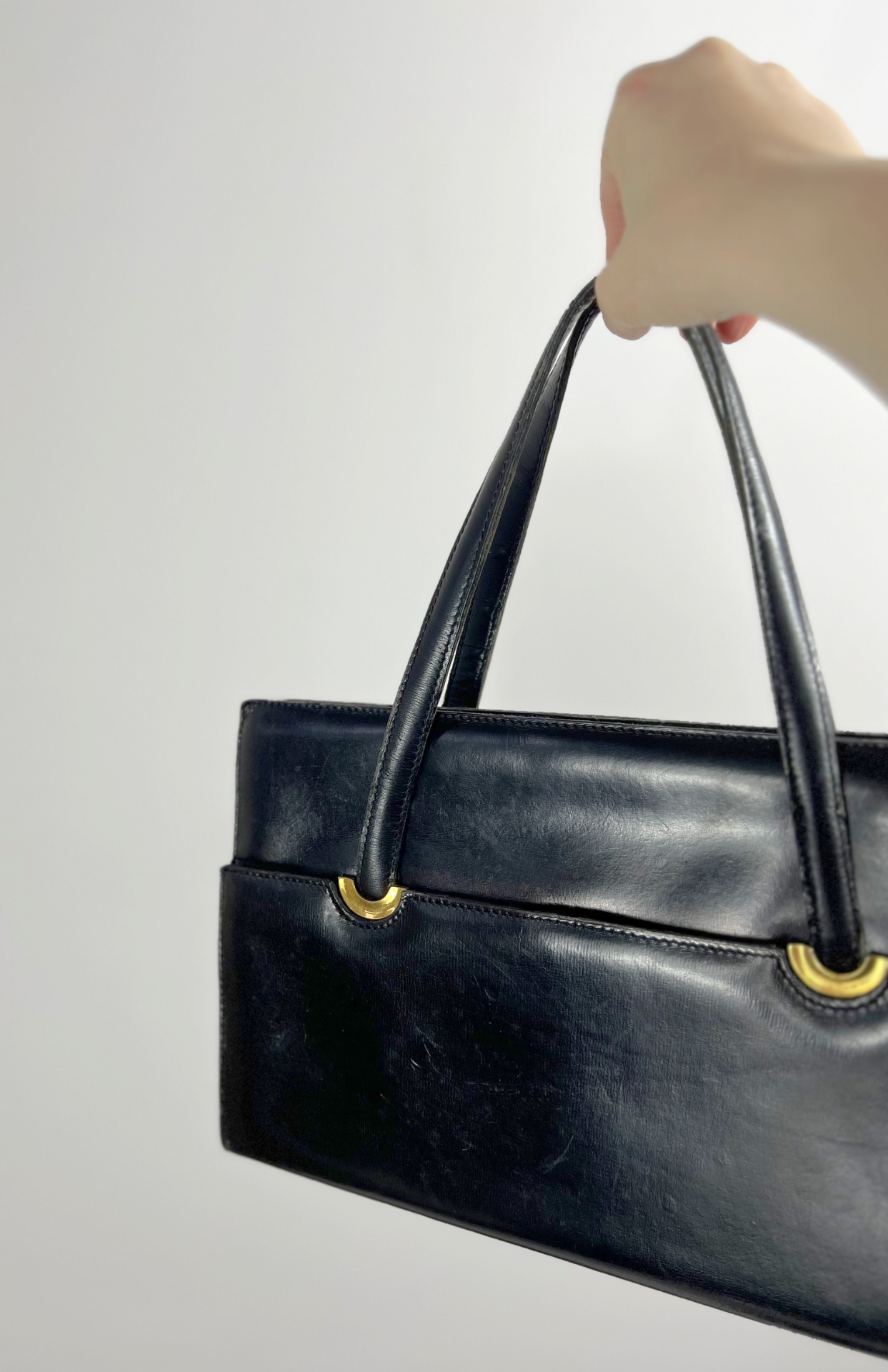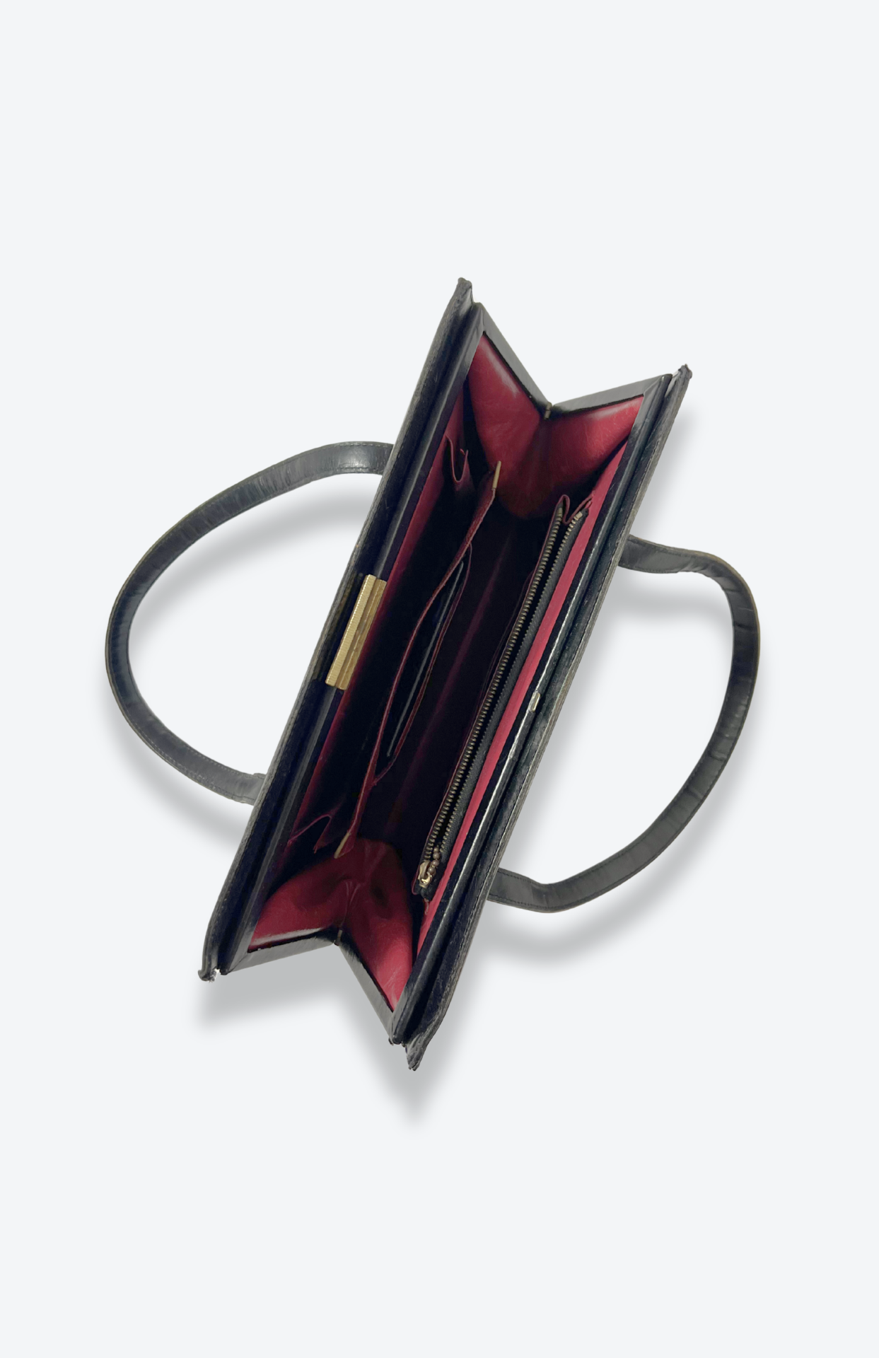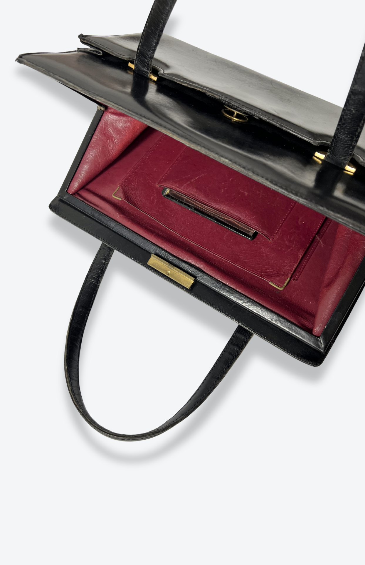 Černá retro kožená brašna do ruky. Má hodně kapes a přihrádek. Uvnitř krásná červená hladká kůže. BONUS: původní zdrcátko