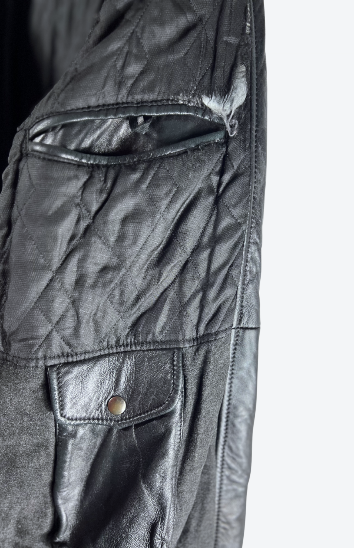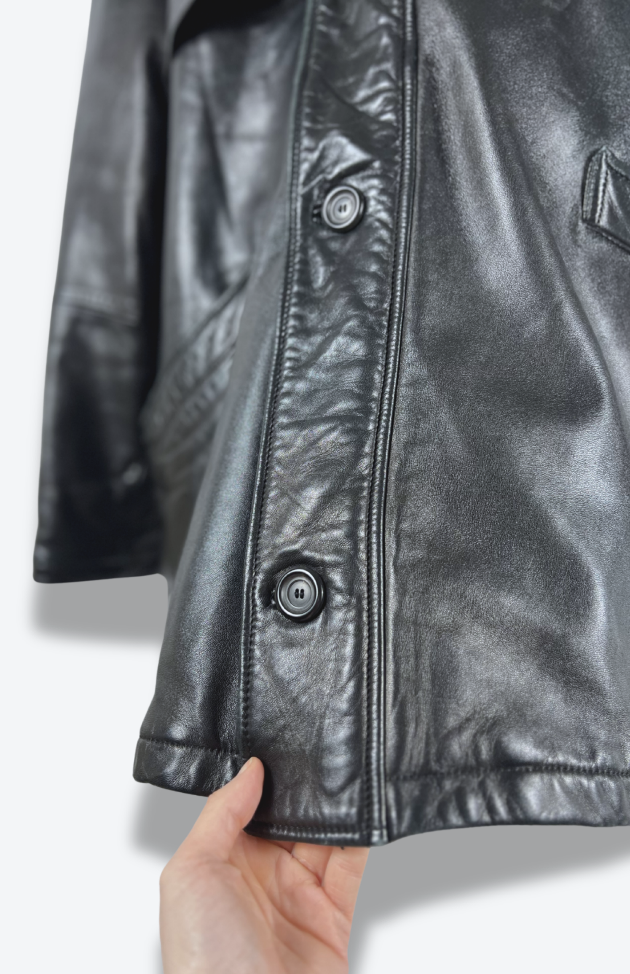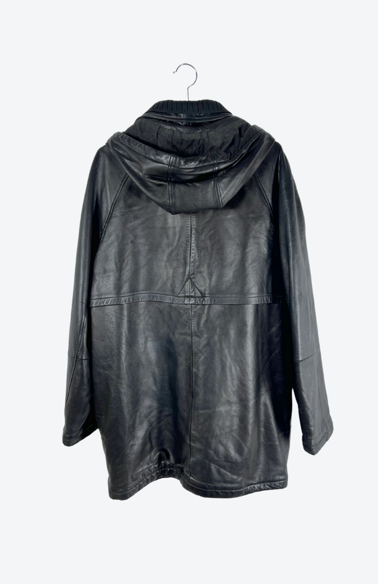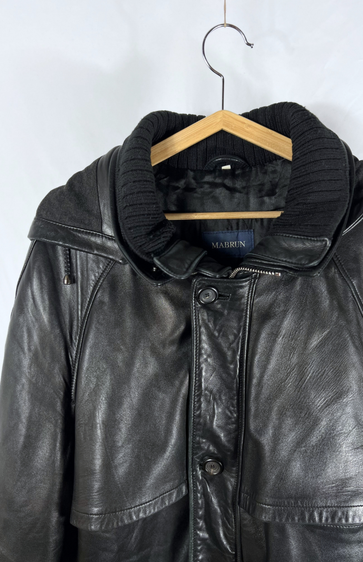 Silná kožená retro bunda. Kapsy zvenčí i skryté uvnitř. Má odnímatelnou kapuci a límec ze silného úpletu. Zapínání na zip a knoflíky. Pánská / oversize unisex.