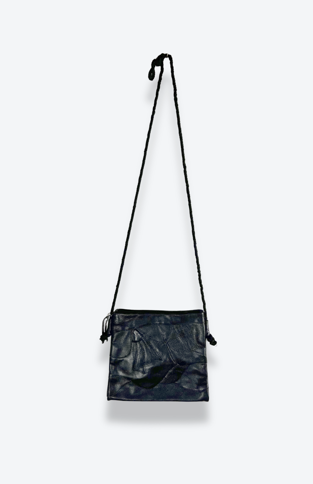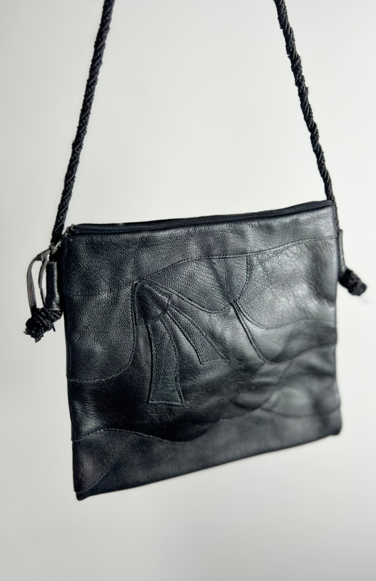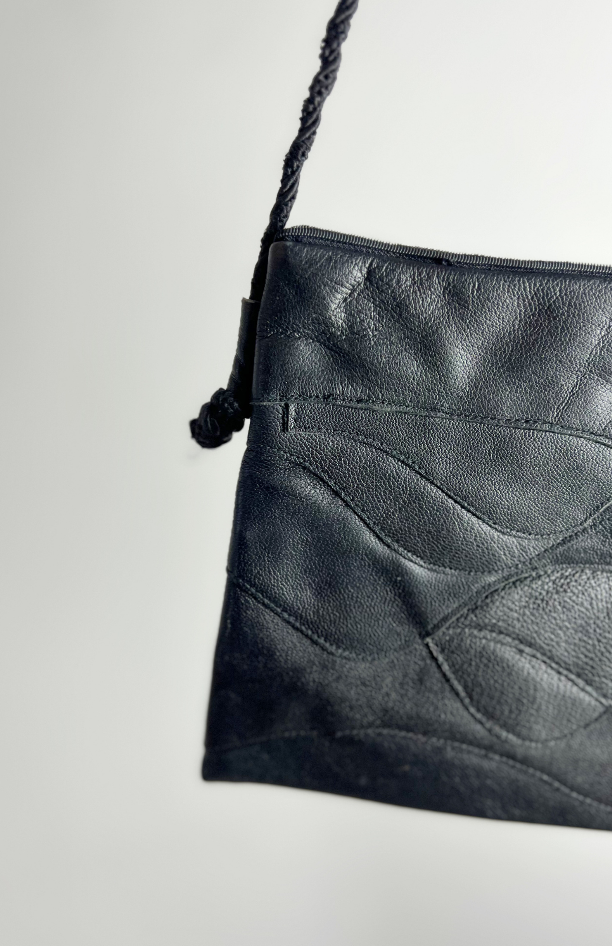 Černá retro kožená kabelka s prošíváním. Má dlouhý tkaný popruh a zapínání na zip.