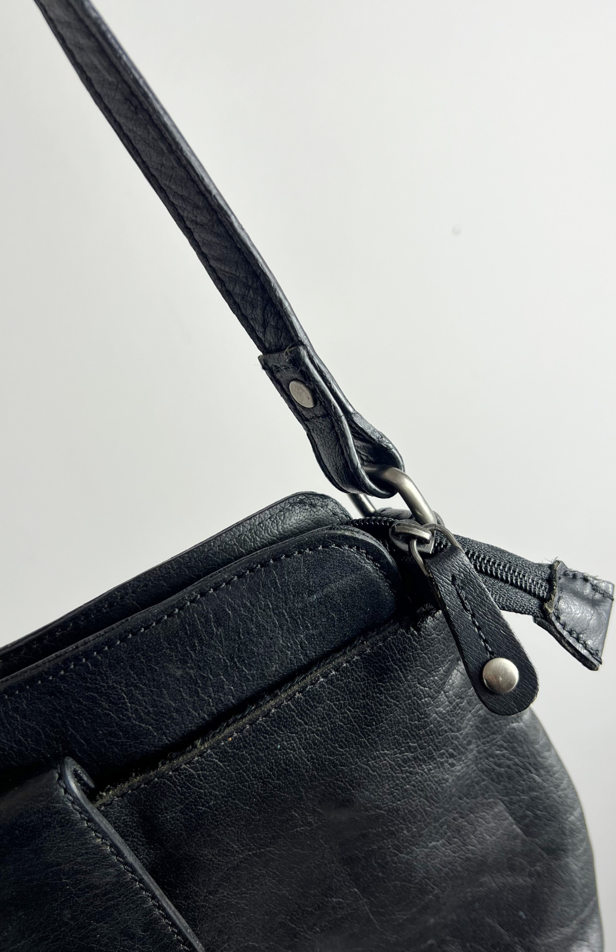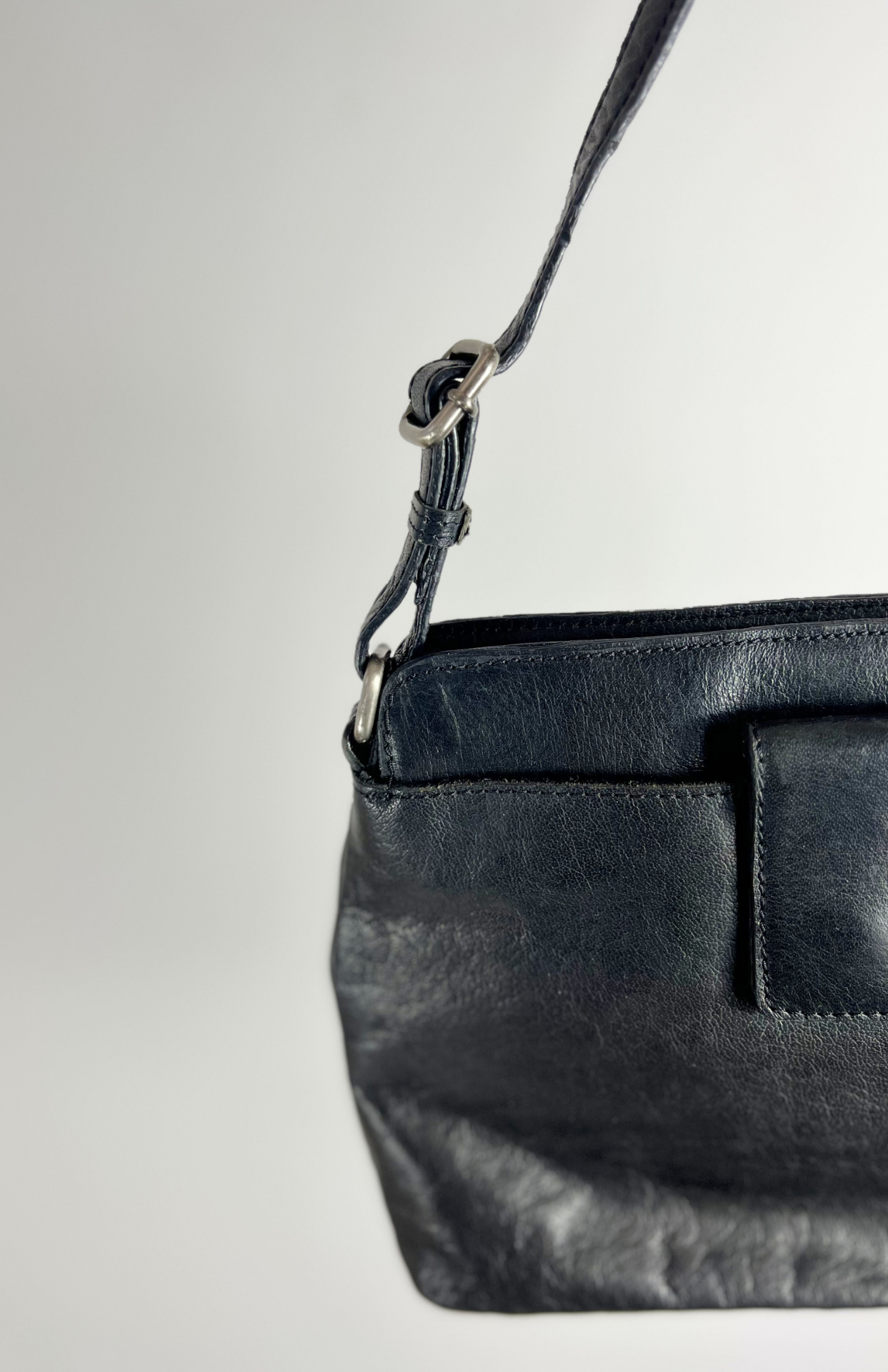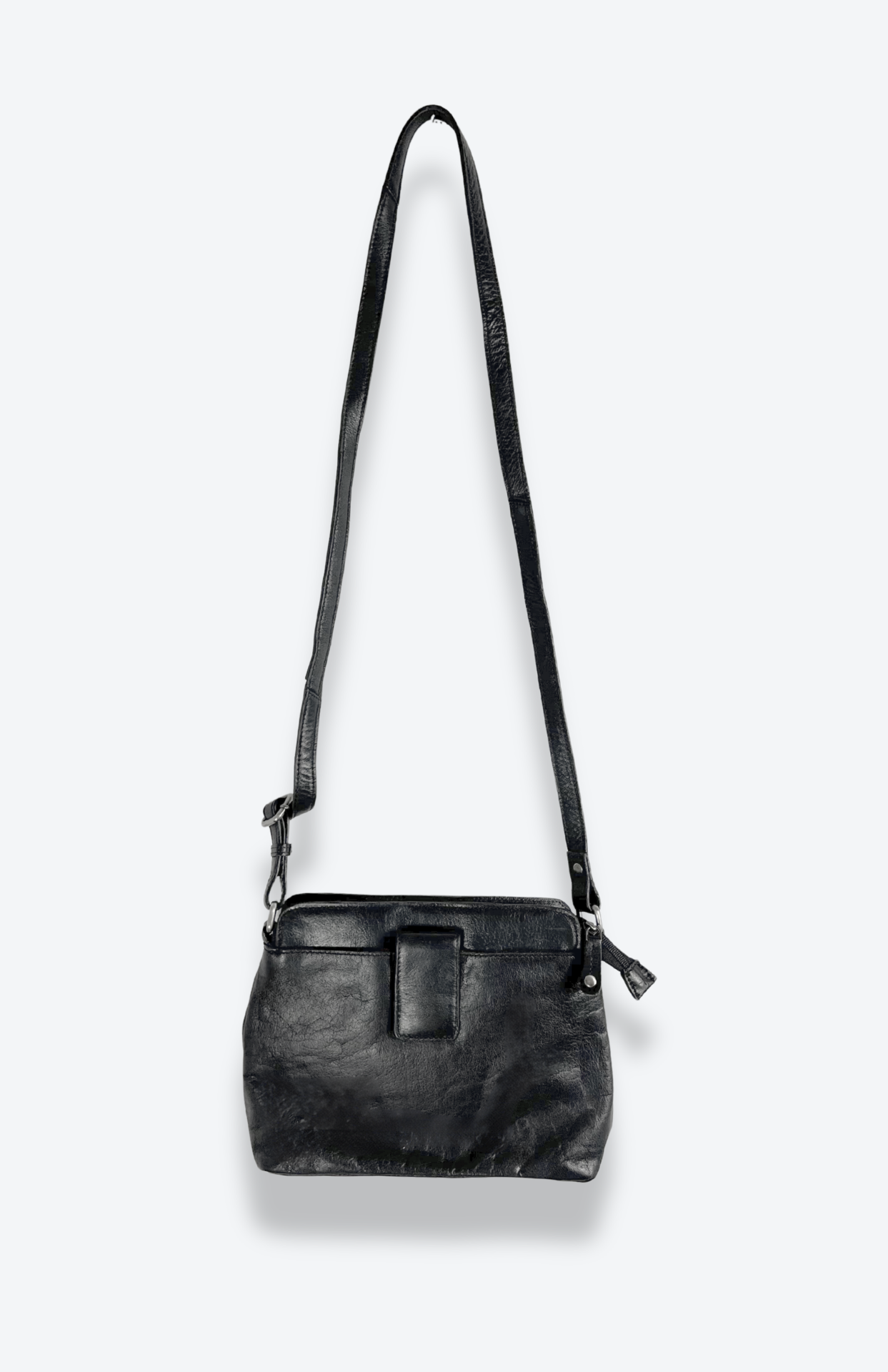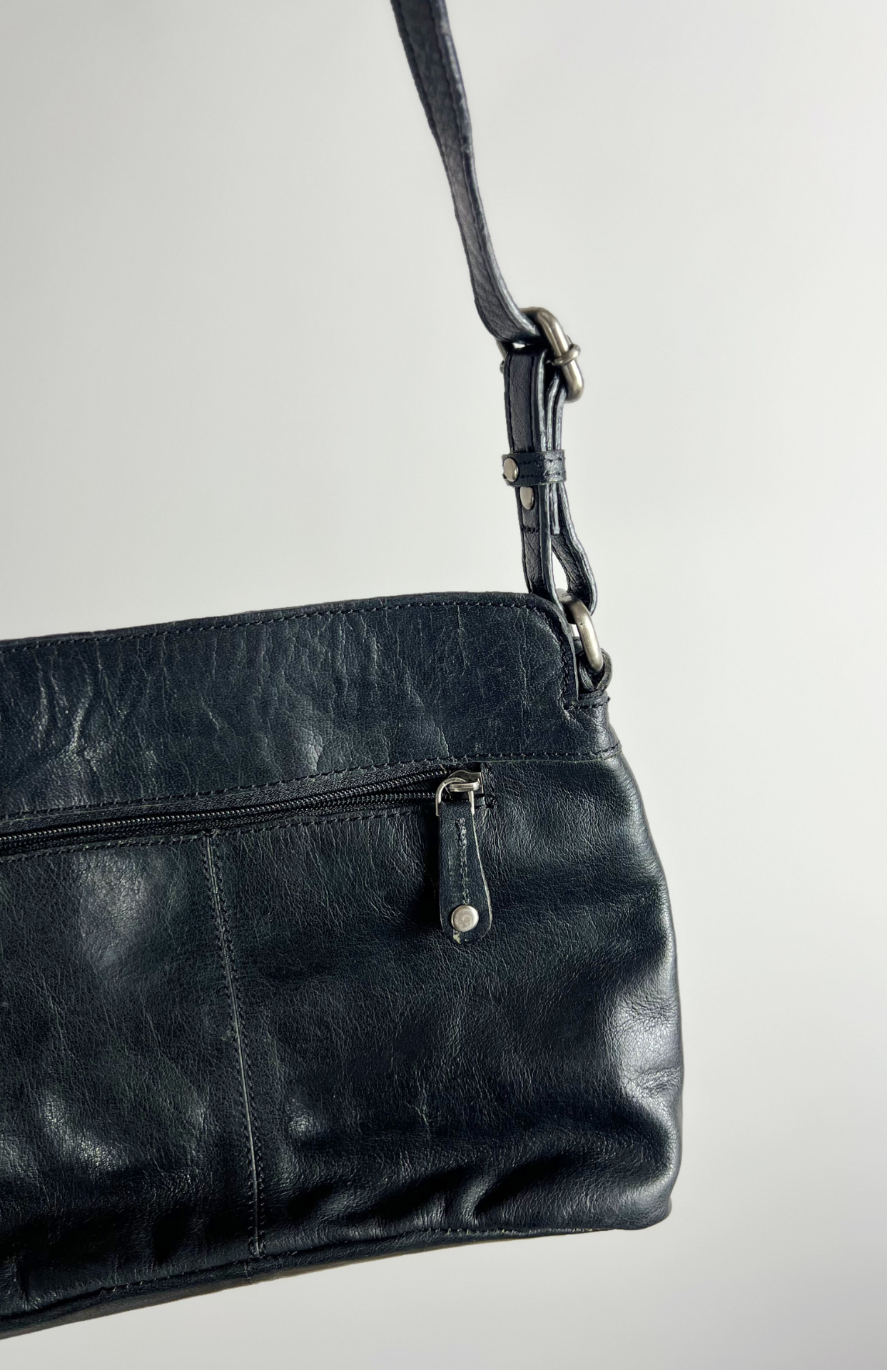 Černá retro kožená minimal kabelka. Má nastavitelný popruh a zapínání na zip. Pěkně zpracovaná.