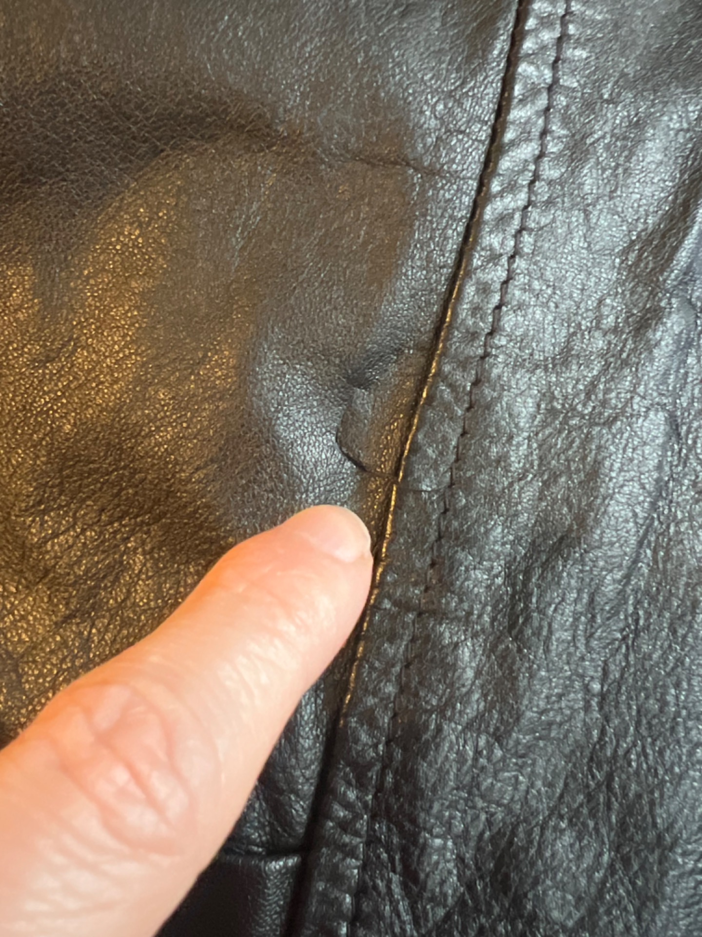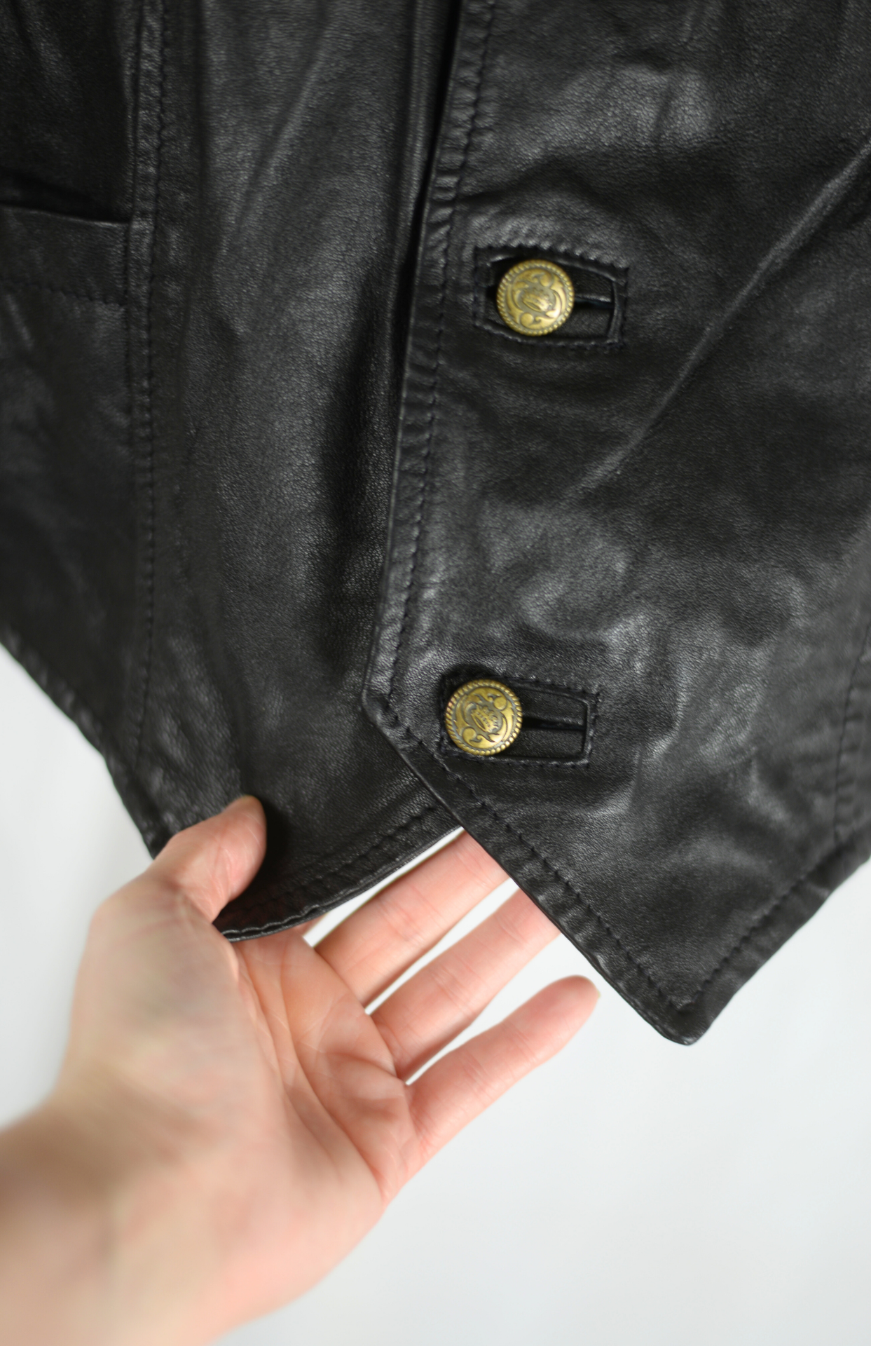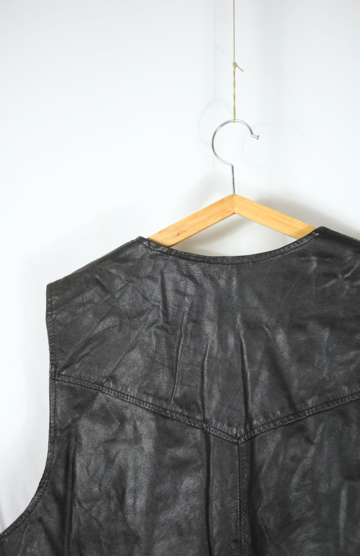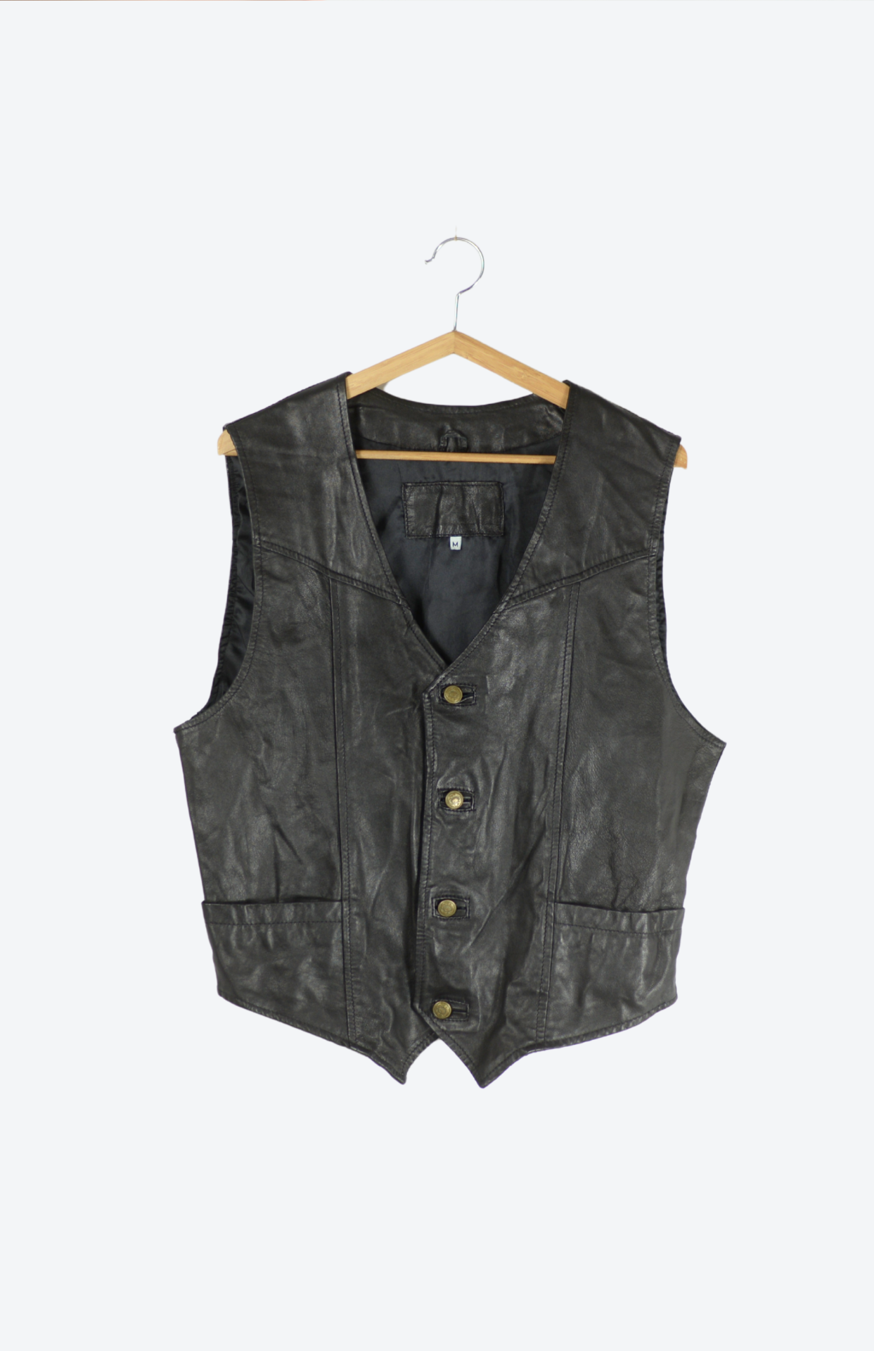 Kožená vintage vesta v tmavě hnědé, téměř černé barvě. Má kovové patentové knoflíčky a kapsy po stranách.