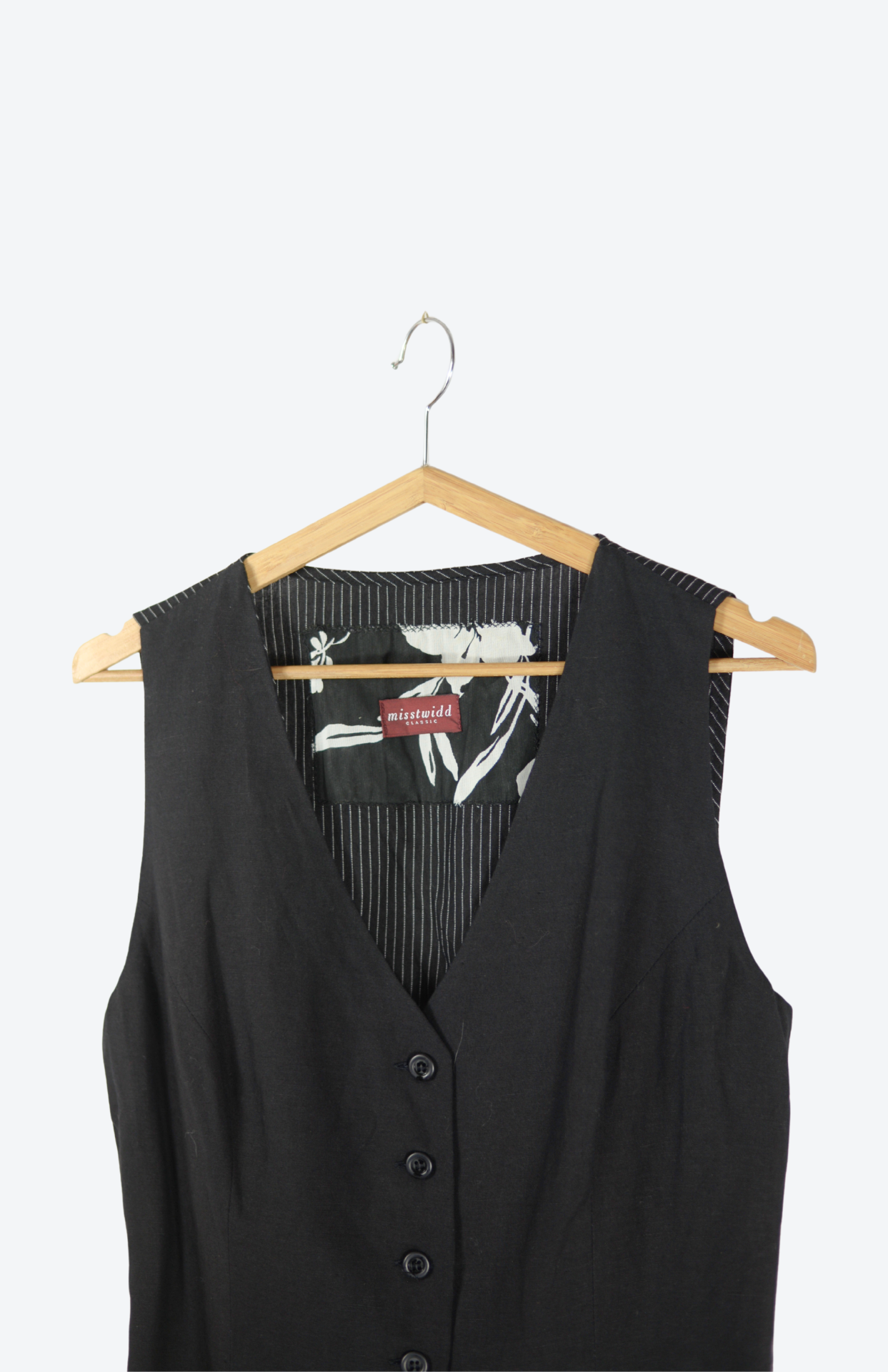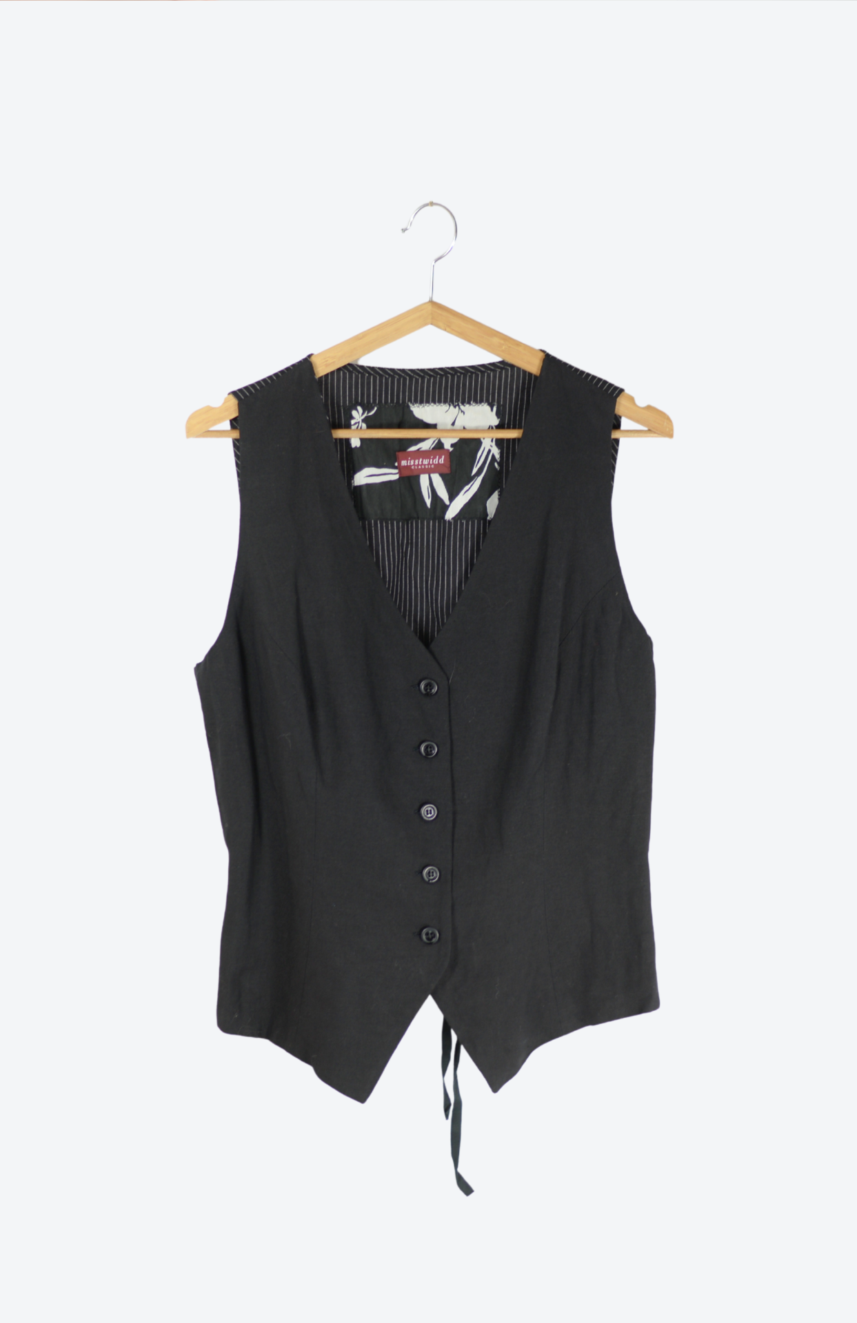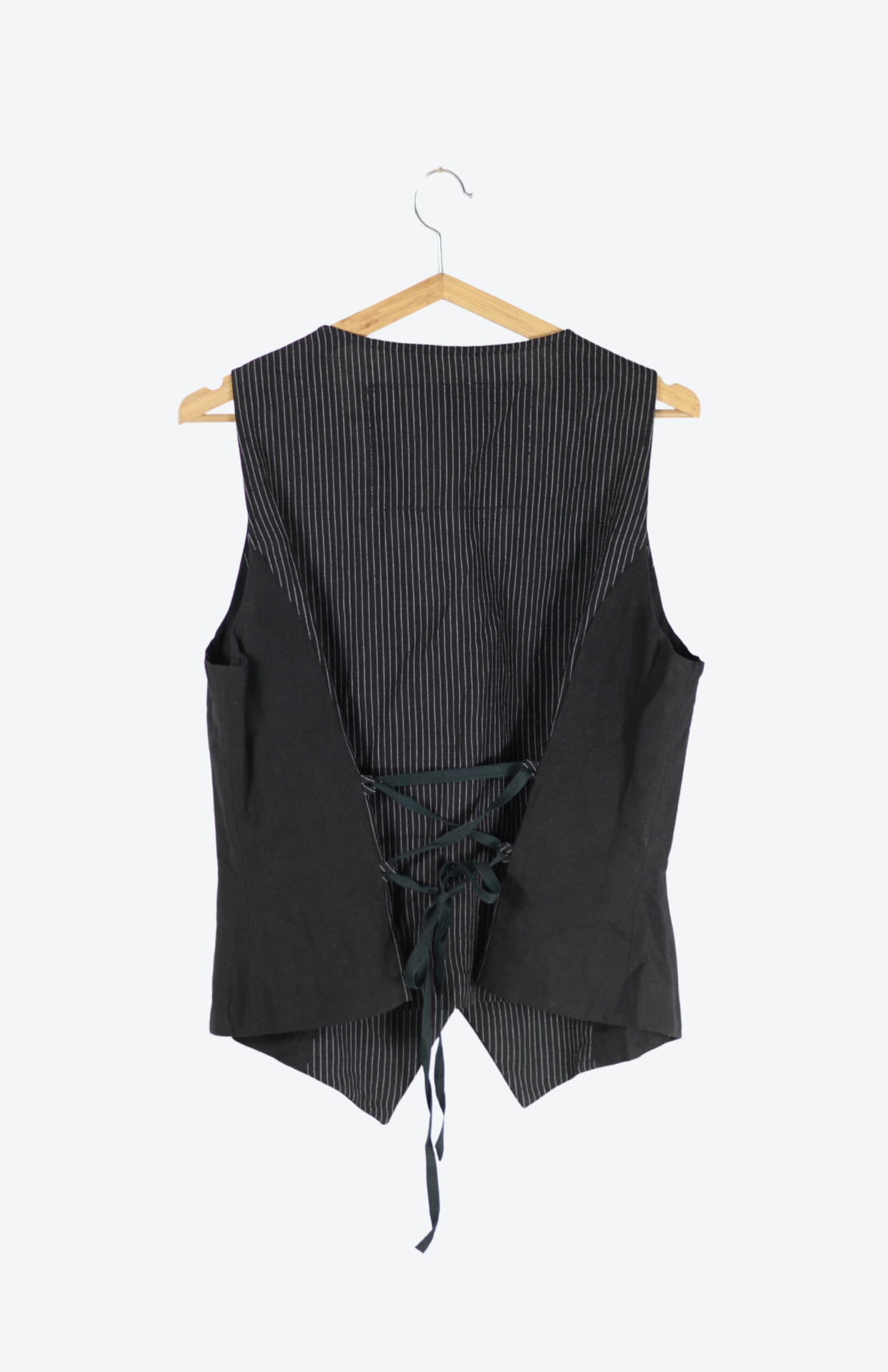 Černá lněná originální vesta. Má detail se šněrováním na zádech a tenký bílý proužek. Vpředu propínací na černé drobné knoflíčky. Skvělý kousek k vrstvení.