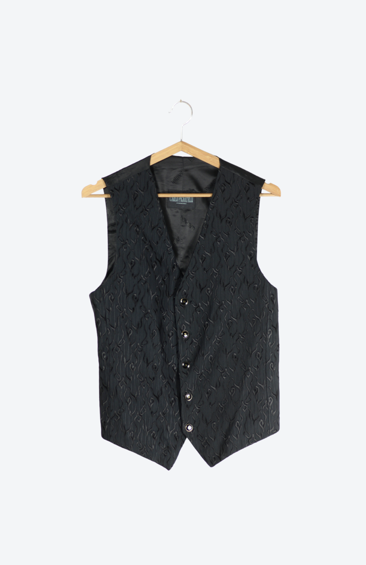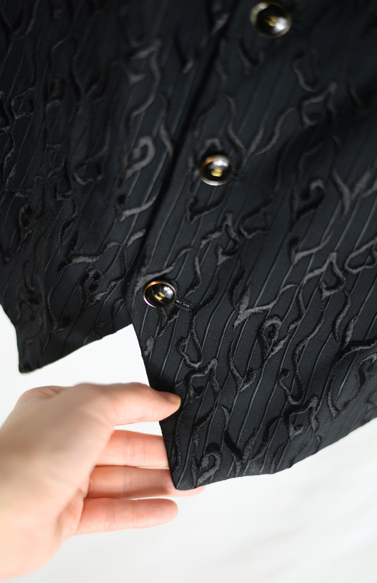 Vintage vesta s výrazným vyšívaným černým vzorem na přední straně. Má saténovou černou podšívku i záda, vzadu s páskem pro přizpůsobení v pase.