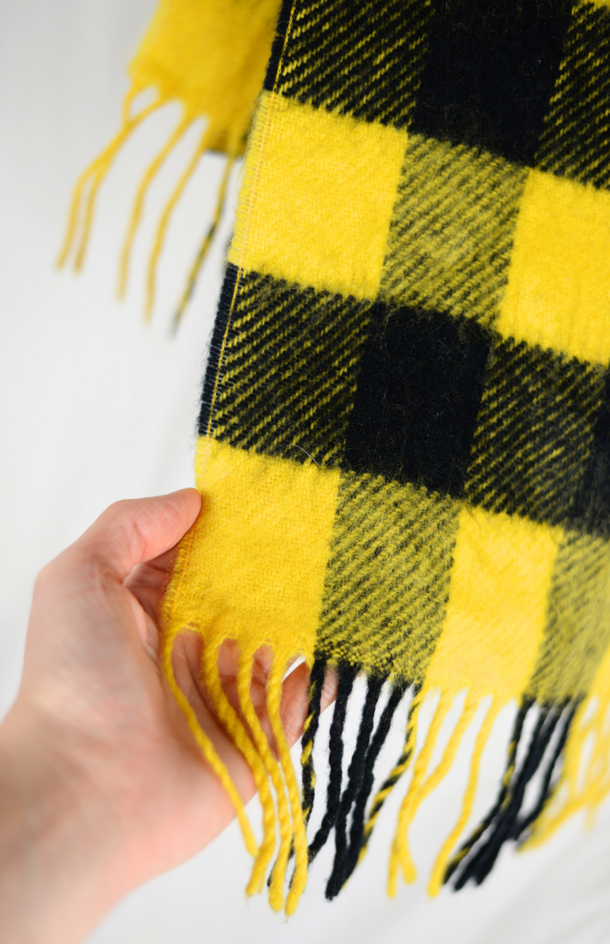 Černožlutá kostkovaná šála. Delší klasické kulaté střapce.