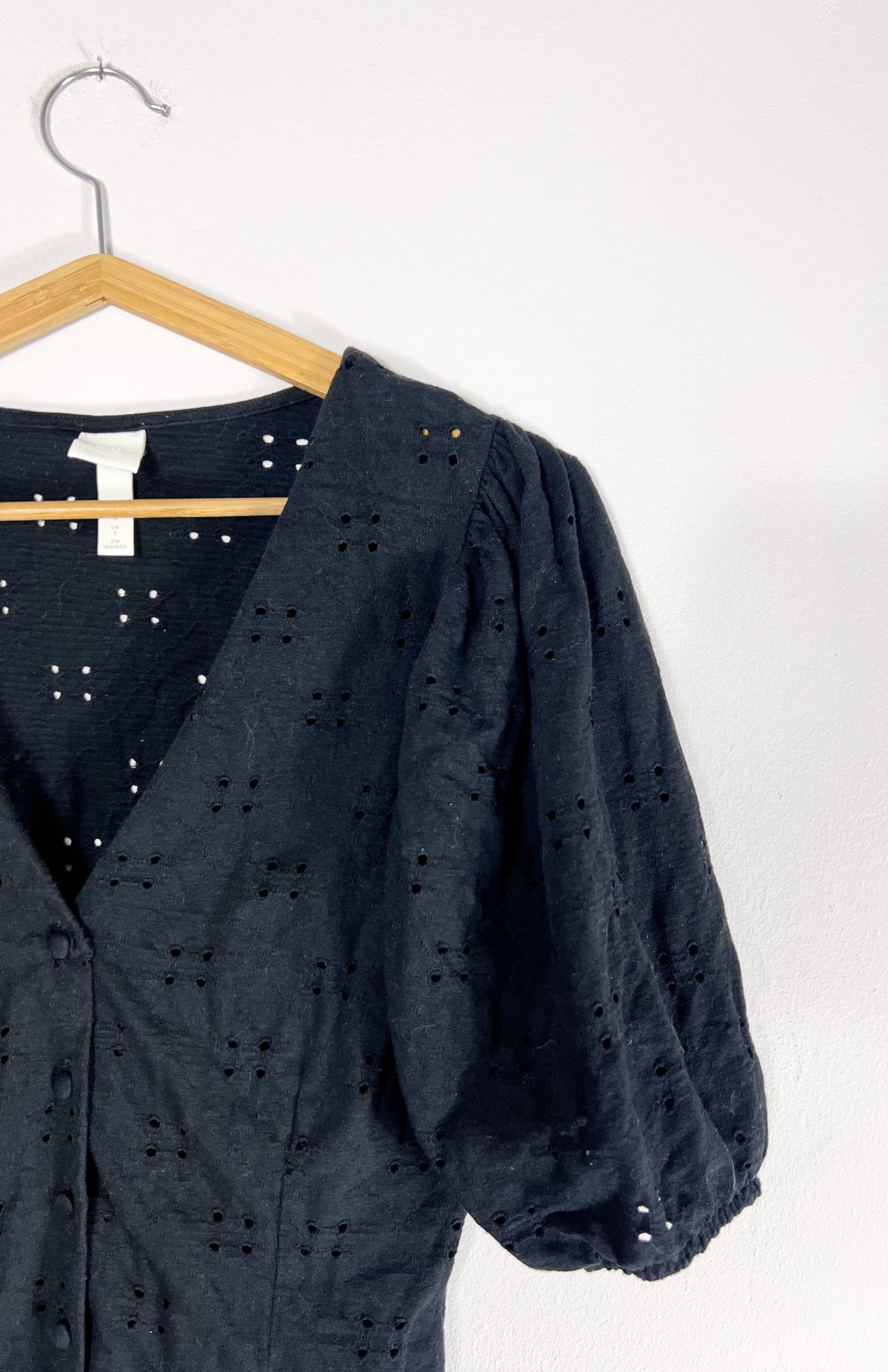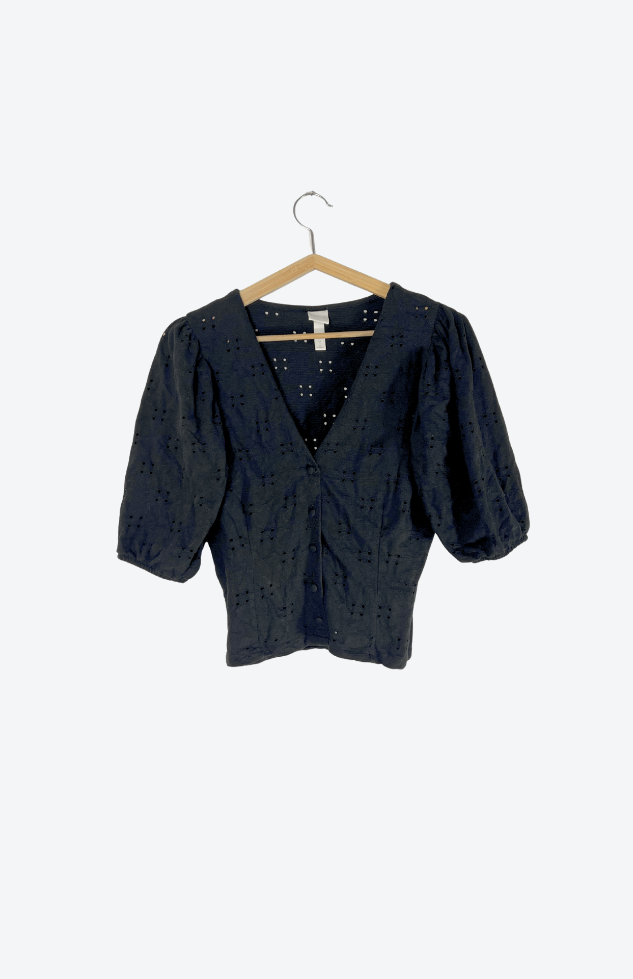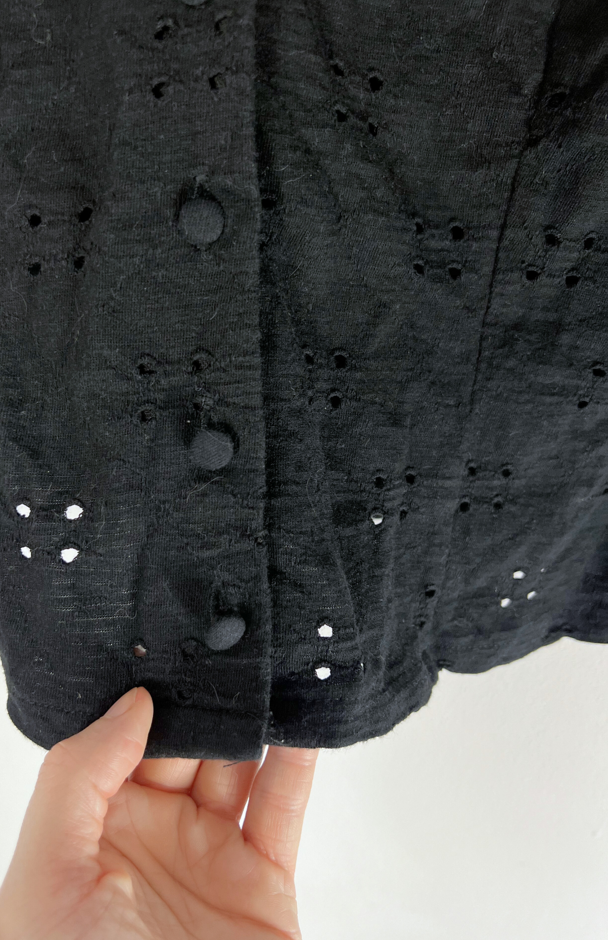 Černý madeirový top. Příjemně pružný, upnutý na tělo. Má nabírané rukávy a knoflíčky na středu.