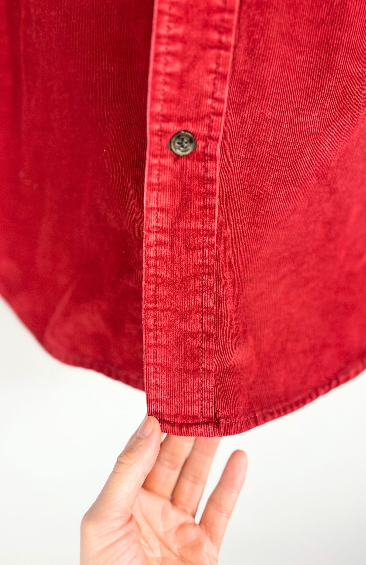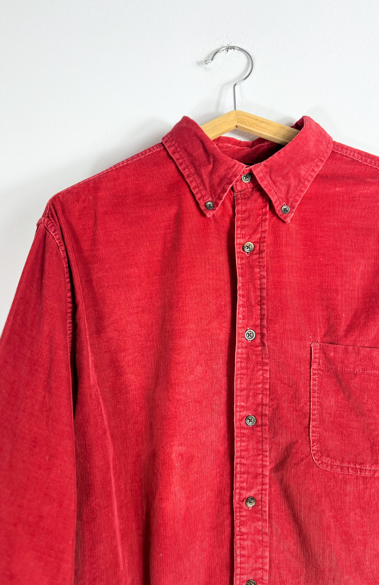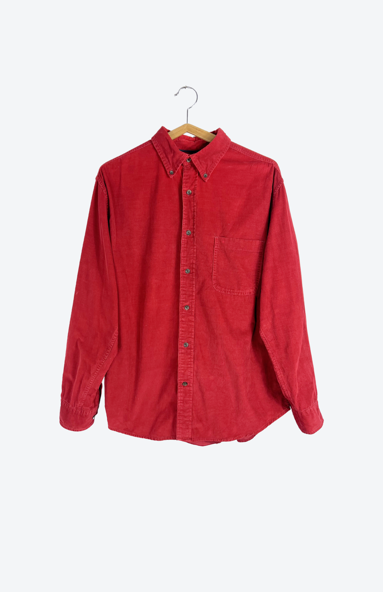 Vintage propínací košile ze středně silného bavlněného manšestru. Má dlouhý rukáv, volný střih a strukturovaný materiál. Na hrudi s kapsou. Pánská / oversize unisex.