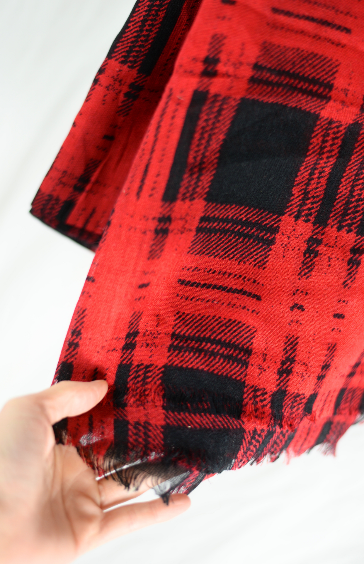 Červená šála s kostkou. Lehká, široká a ideální na různé úvazy.
