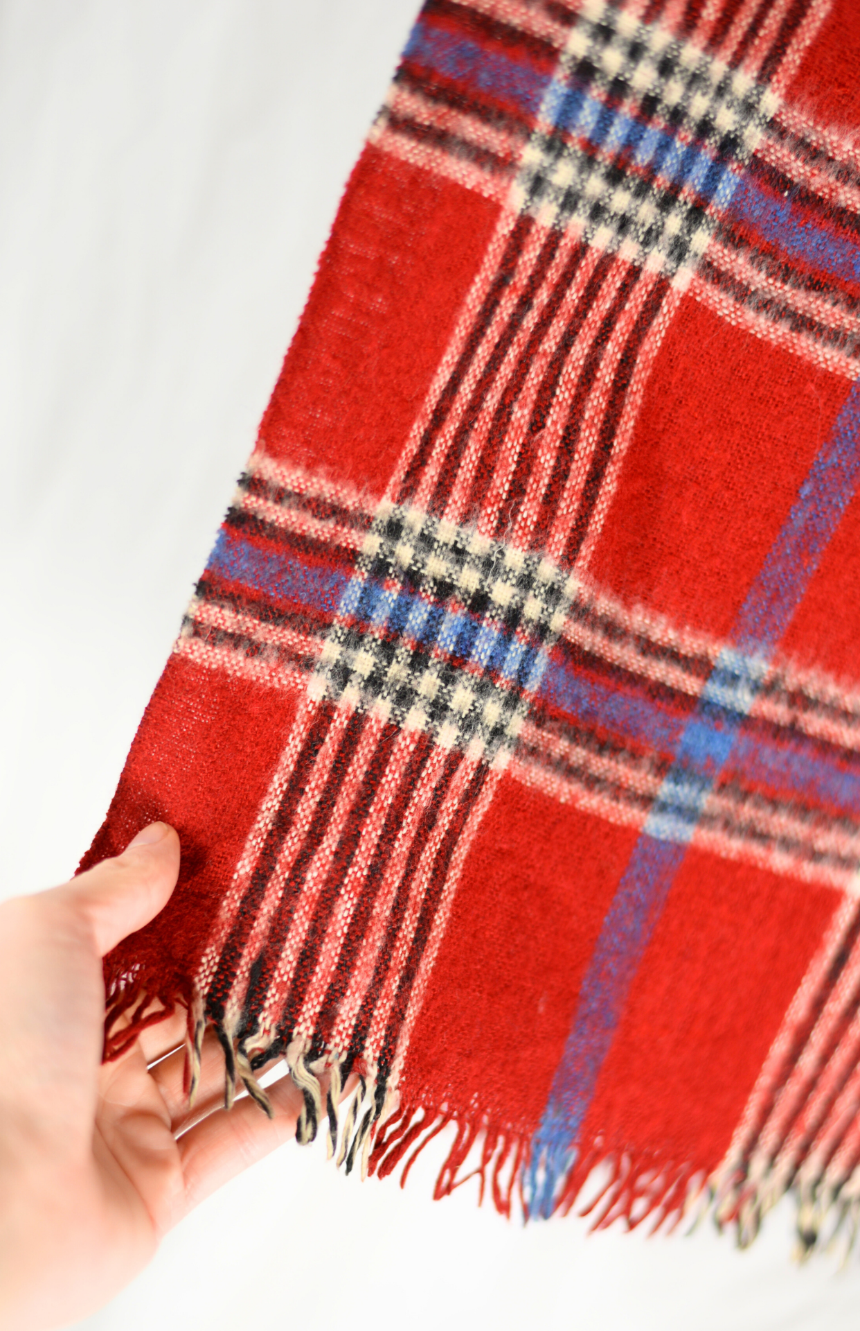 Červená šála s kostkou. Lehčí příjemný úplet a drobné střapečky.