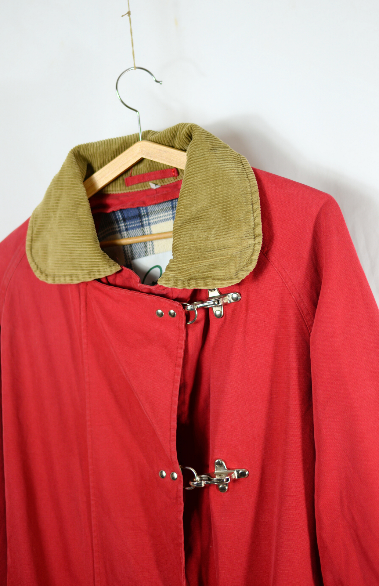 Delší sytě červený retro kabát. Teplejší kousek s průvlekovým kovovým zapínáním. Má manšestrový límeček, detaily na rukávech. Kapsy po stranách. Poctový, silný a pěkně zpracovaný oldschool kousek.