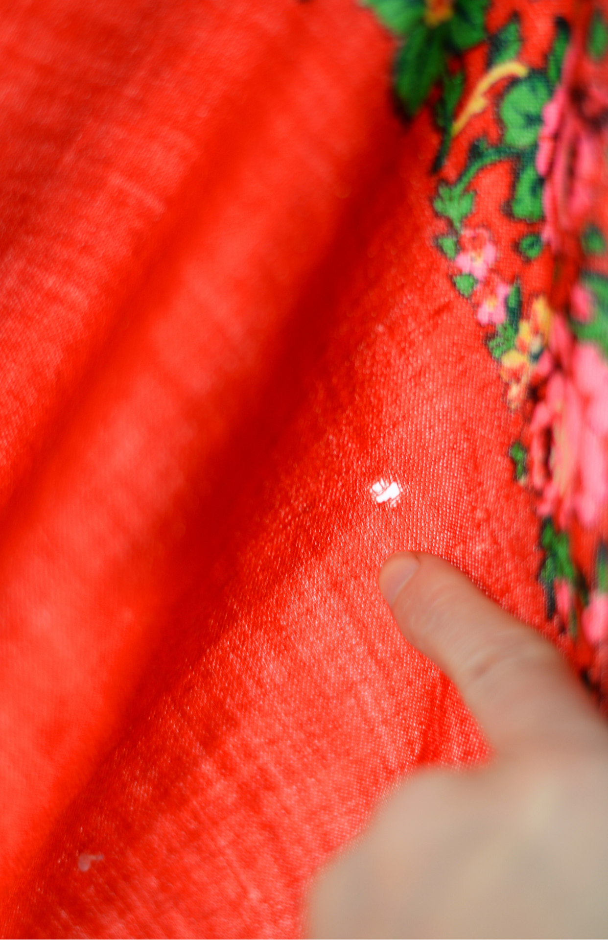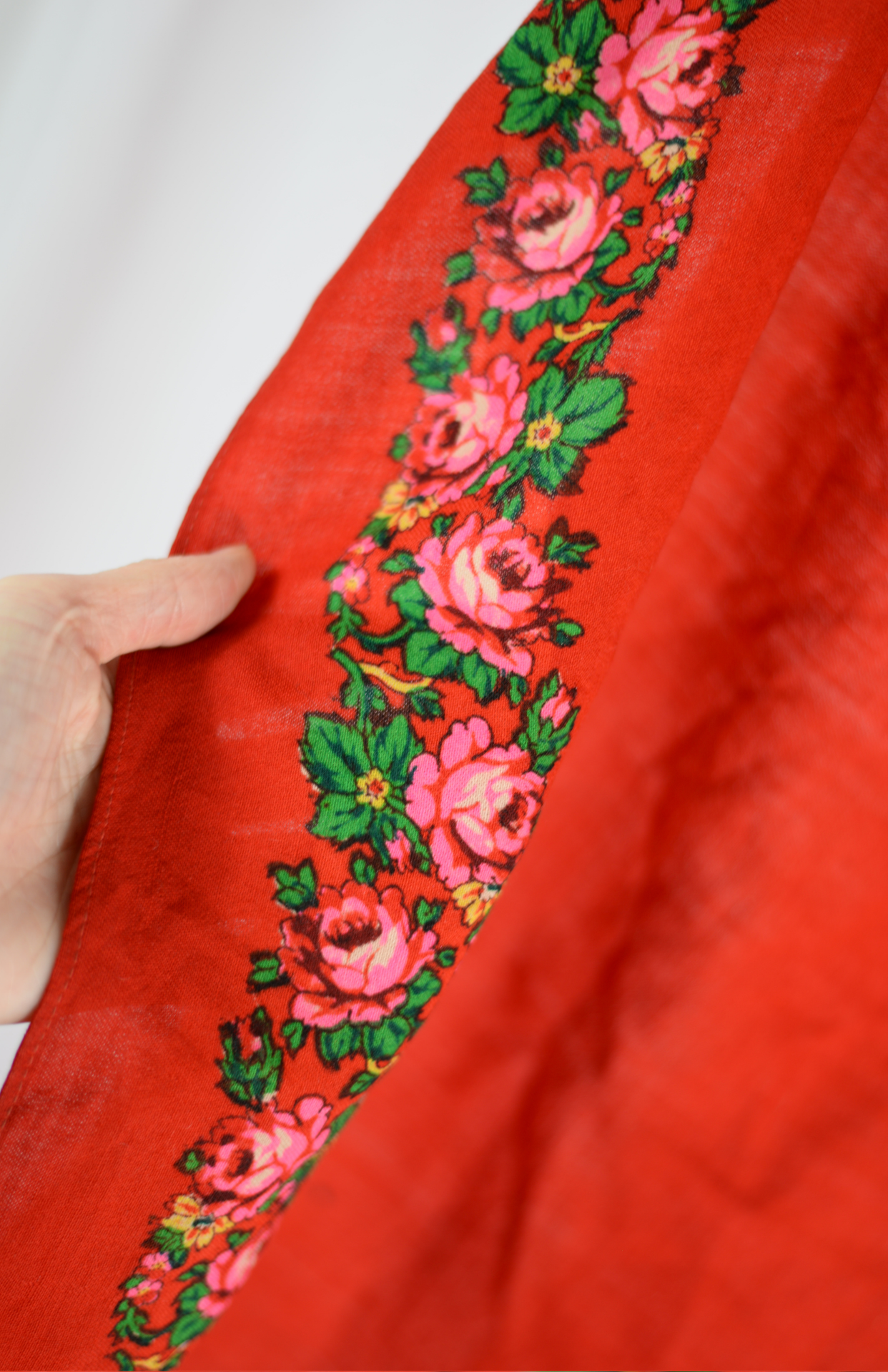 Čtvercový červený šátek s květinami. Stav: Pěkně zachovalý, pouze dvě menší dírky, voz foto.