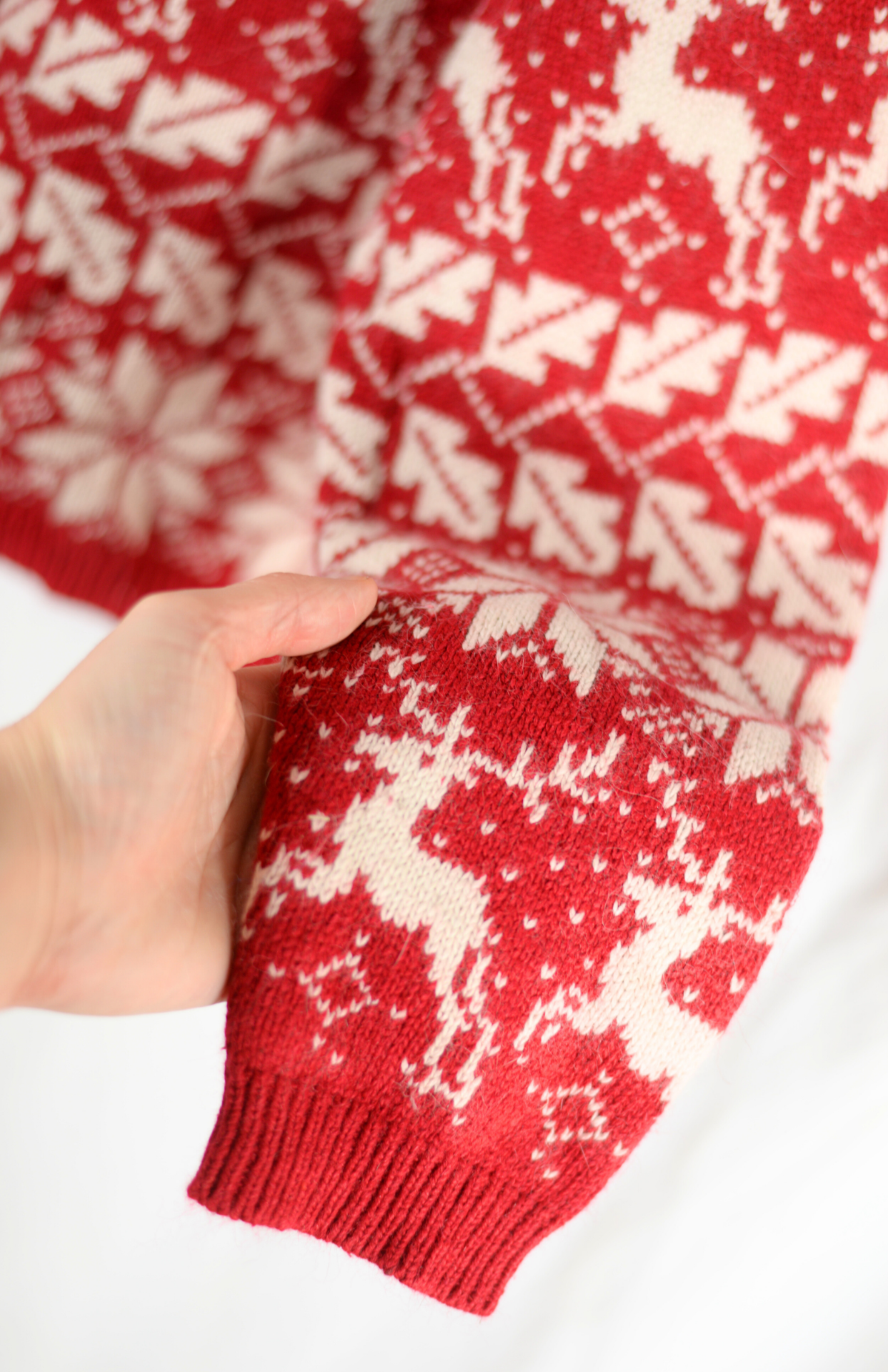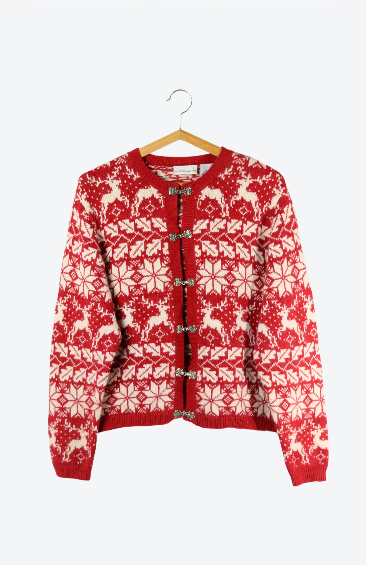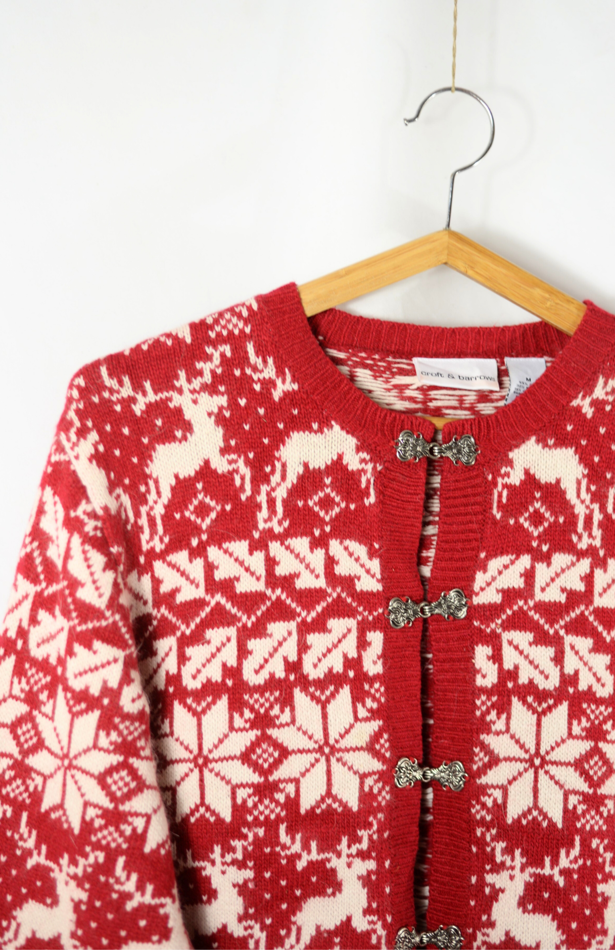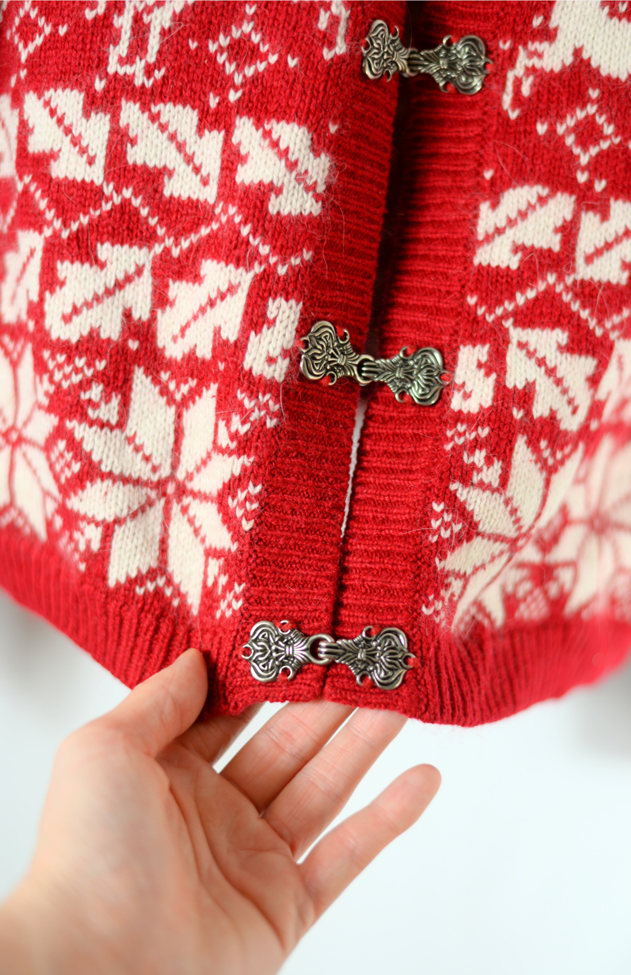 Úžasně hebký norský svetr s výrazným vzorem s vločkami a soby. Má zapínání na zdobené kovové háčky po celé své délce.
