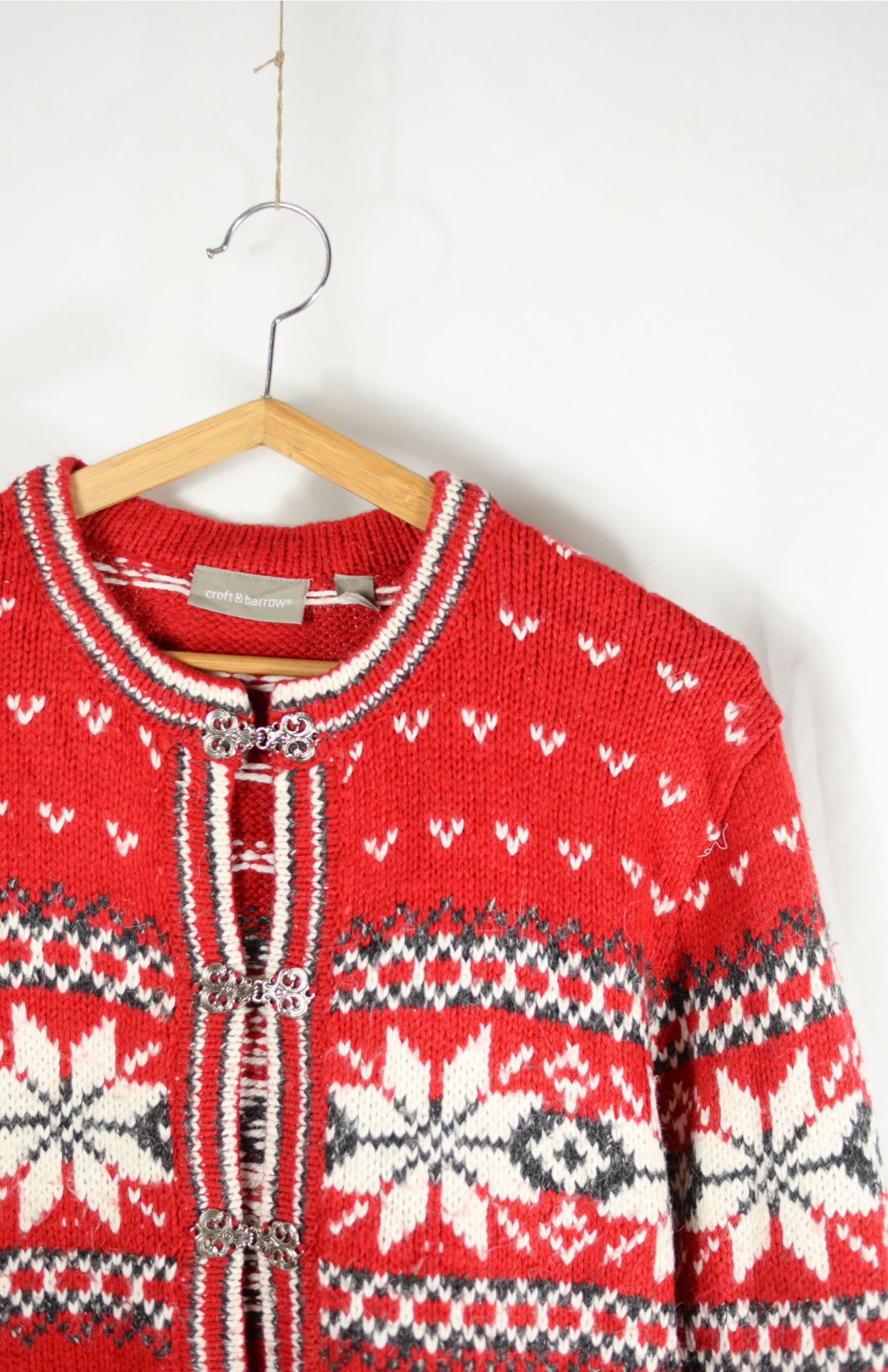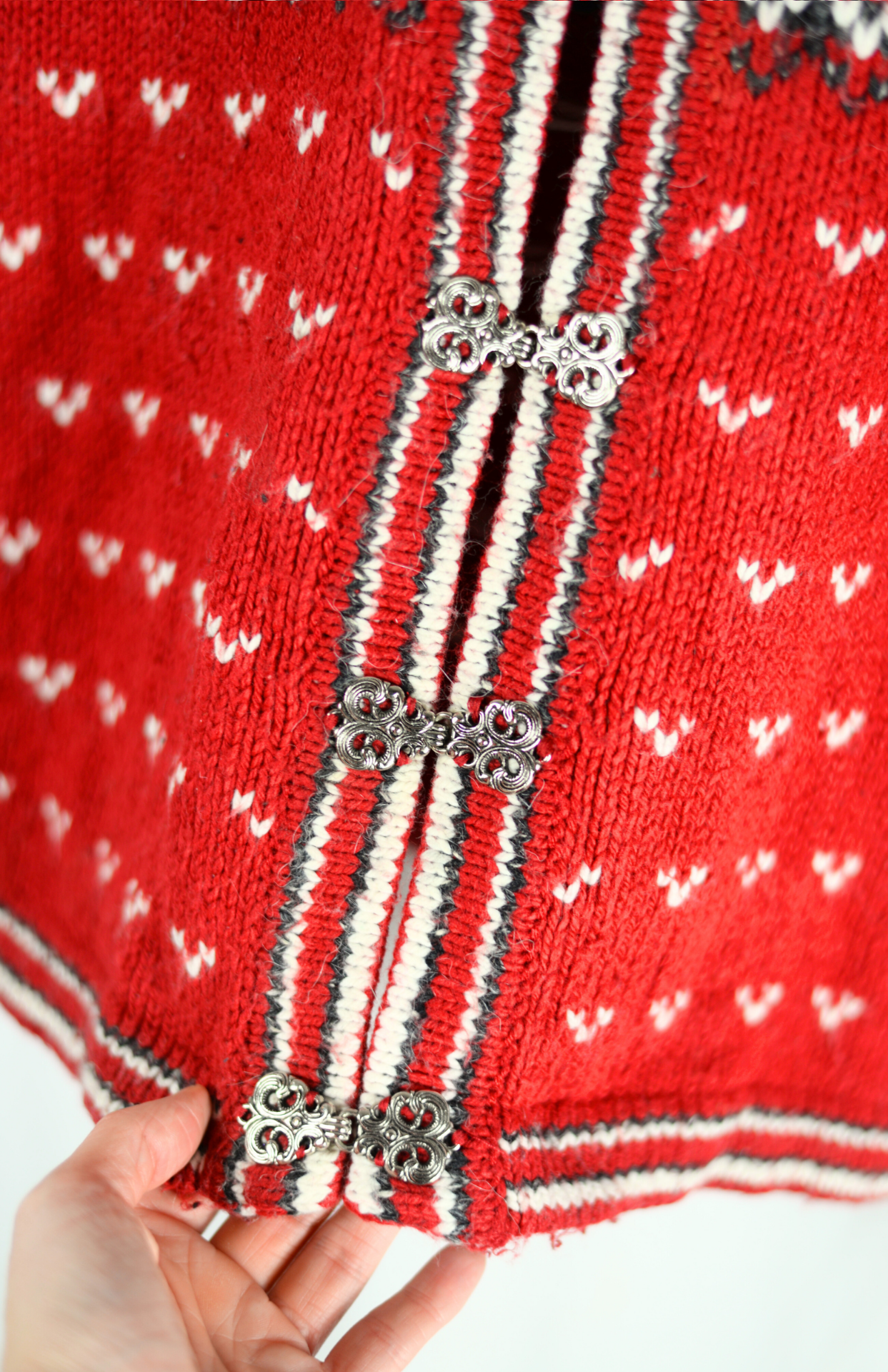 Červený norský svetr se vzorem. Má zapínání na zdobené háčky po celé své délce.