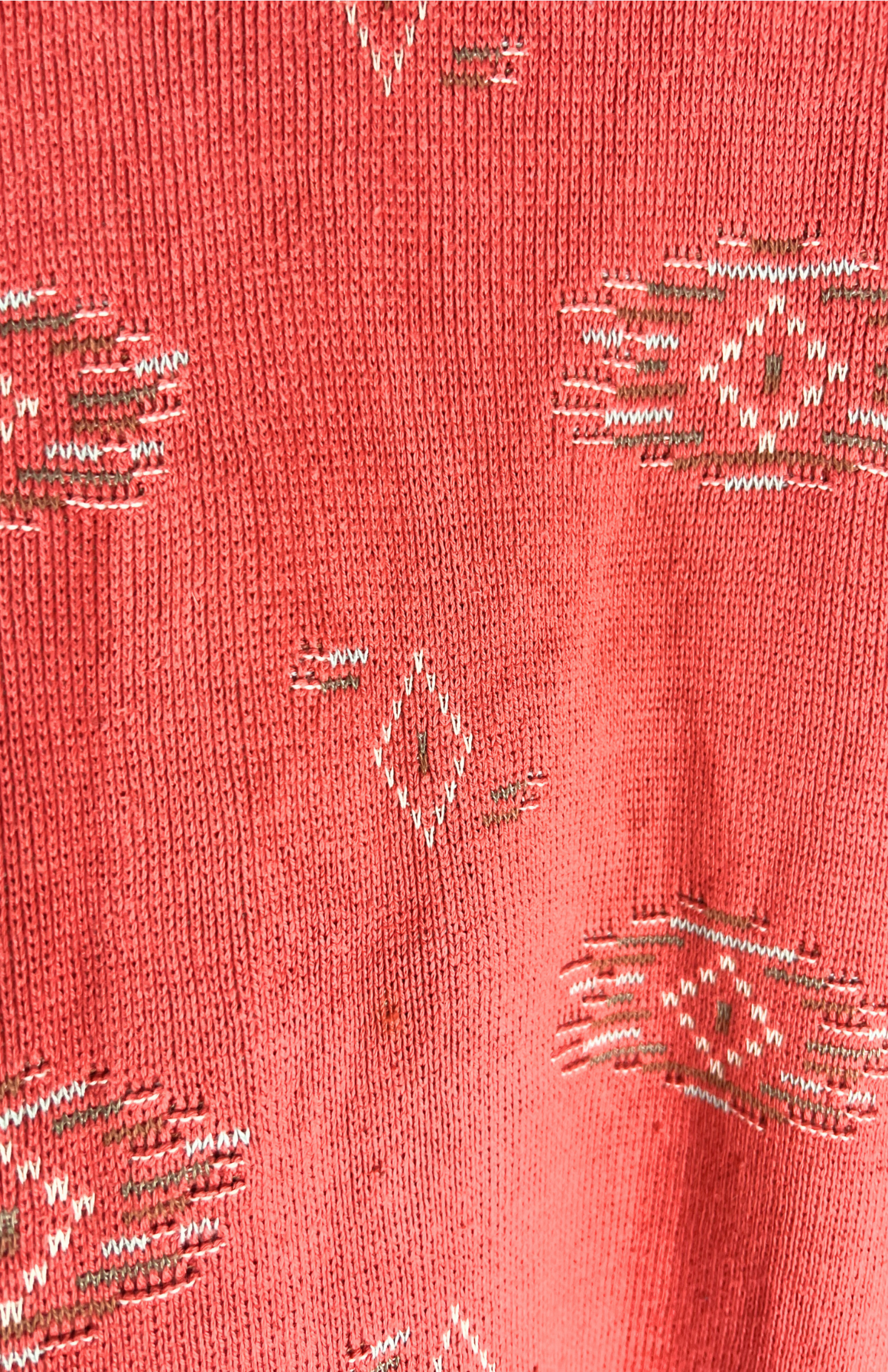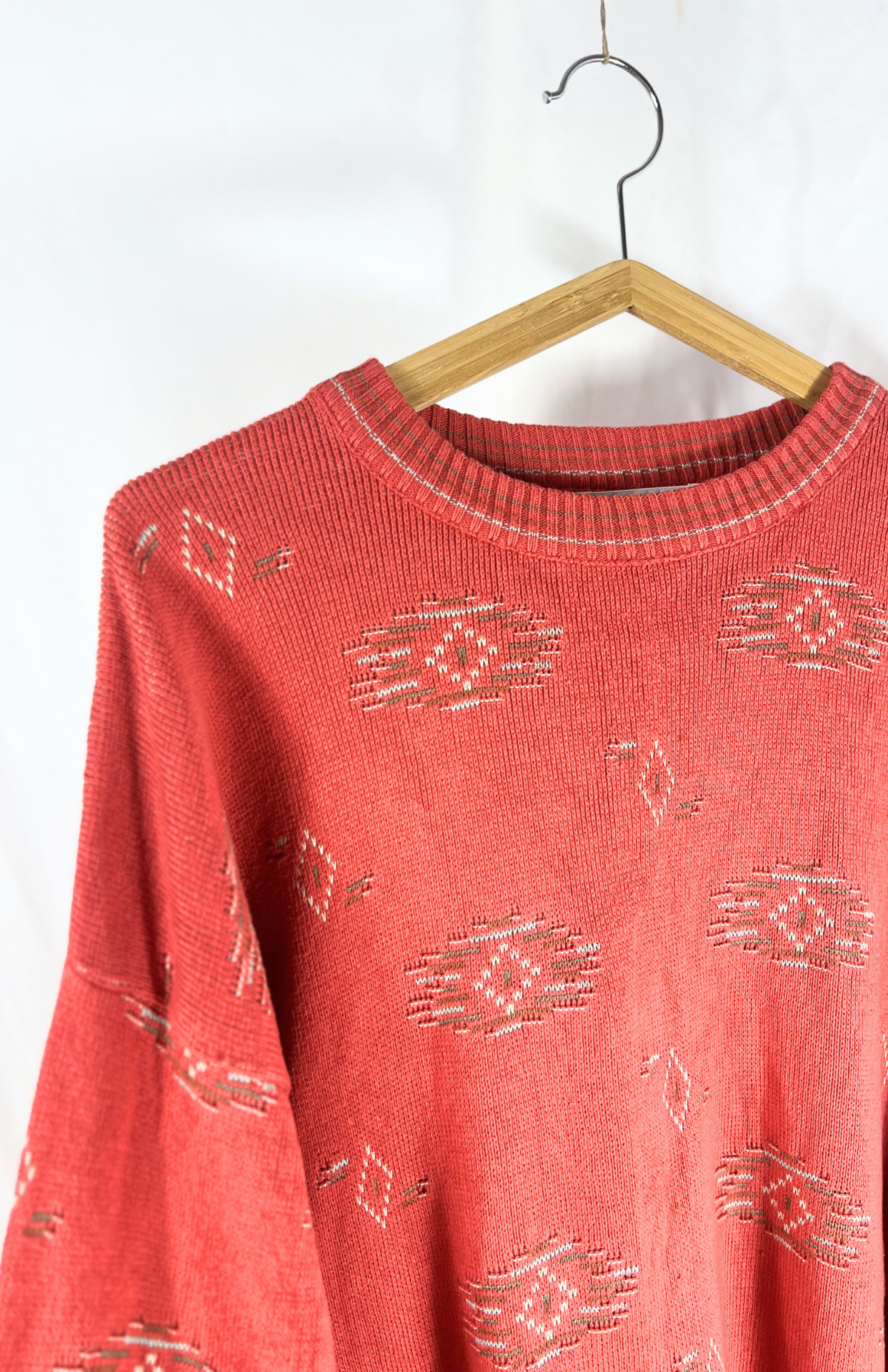 Červený retro svetr se vzory. Má příjemný bavlněný úplet a lehce nabíraný rukáv. Unisex střih.