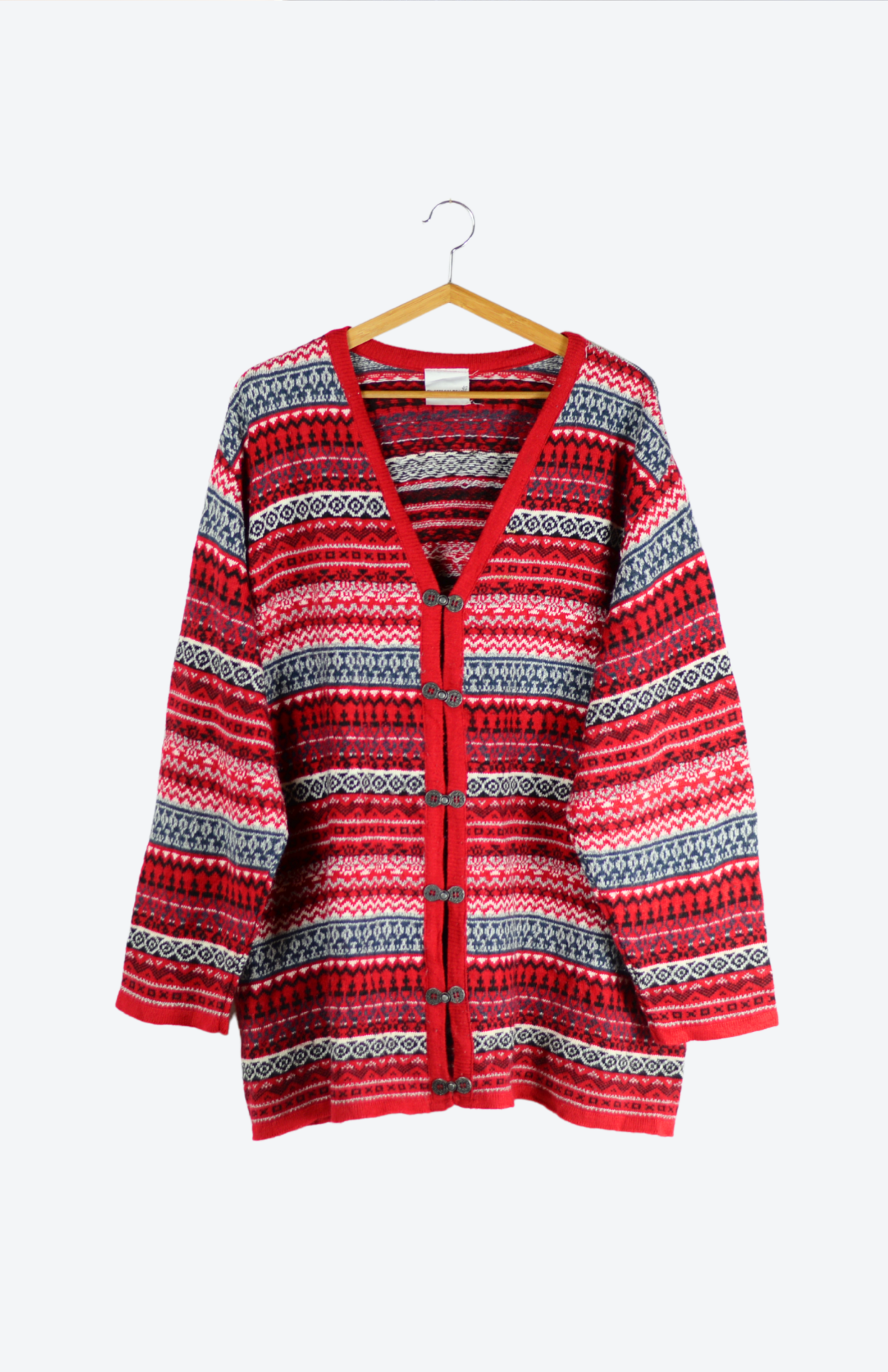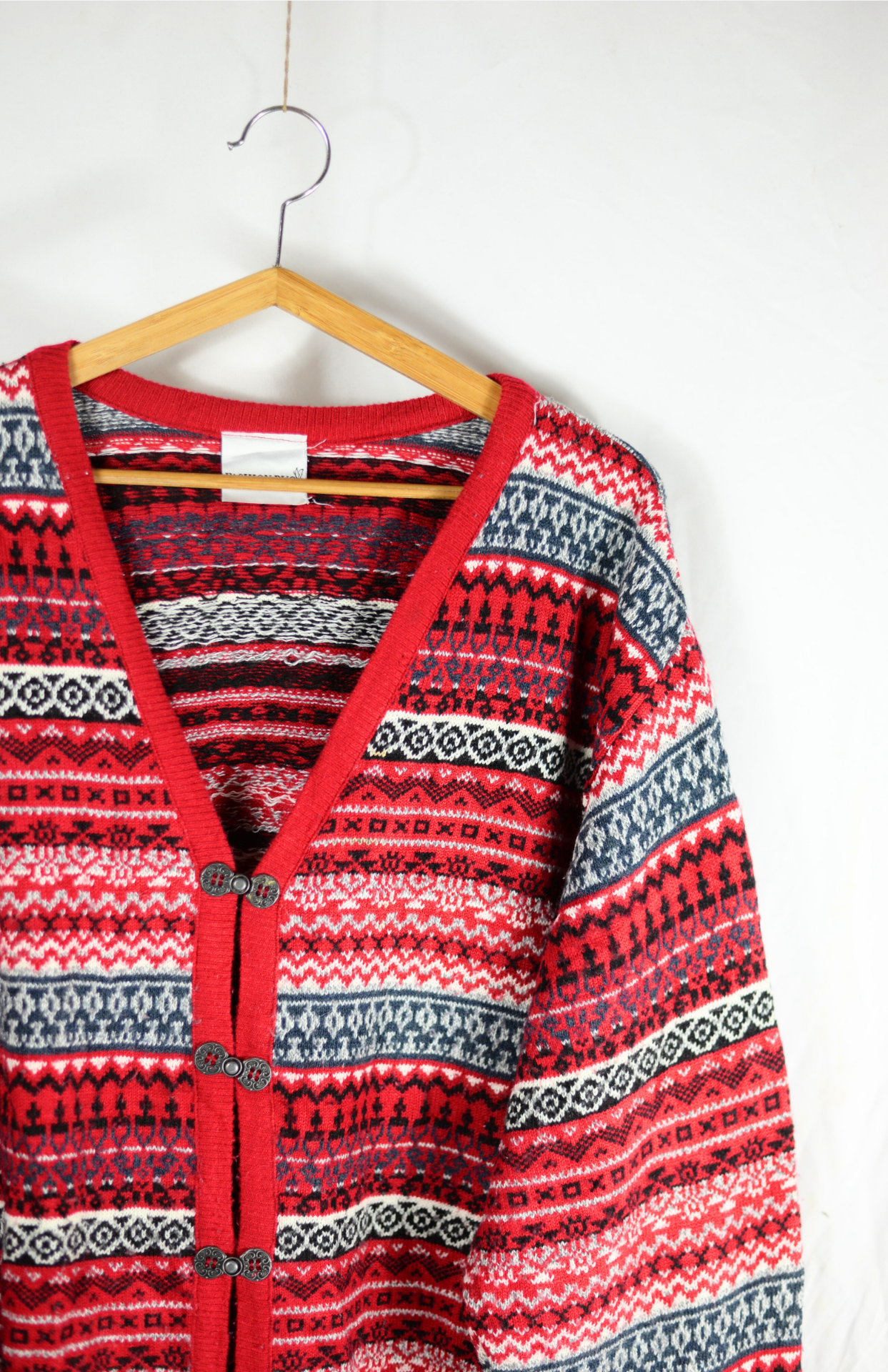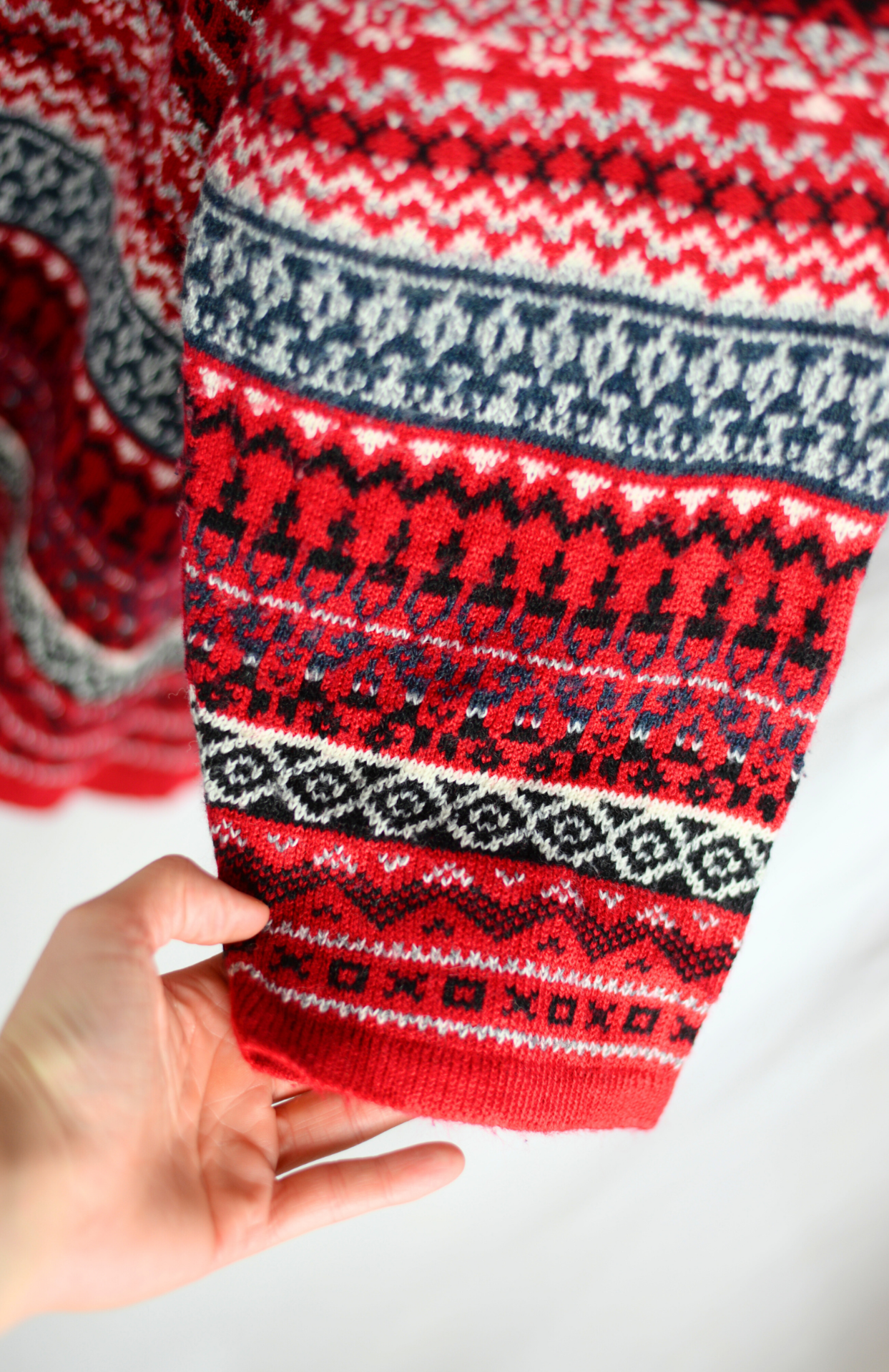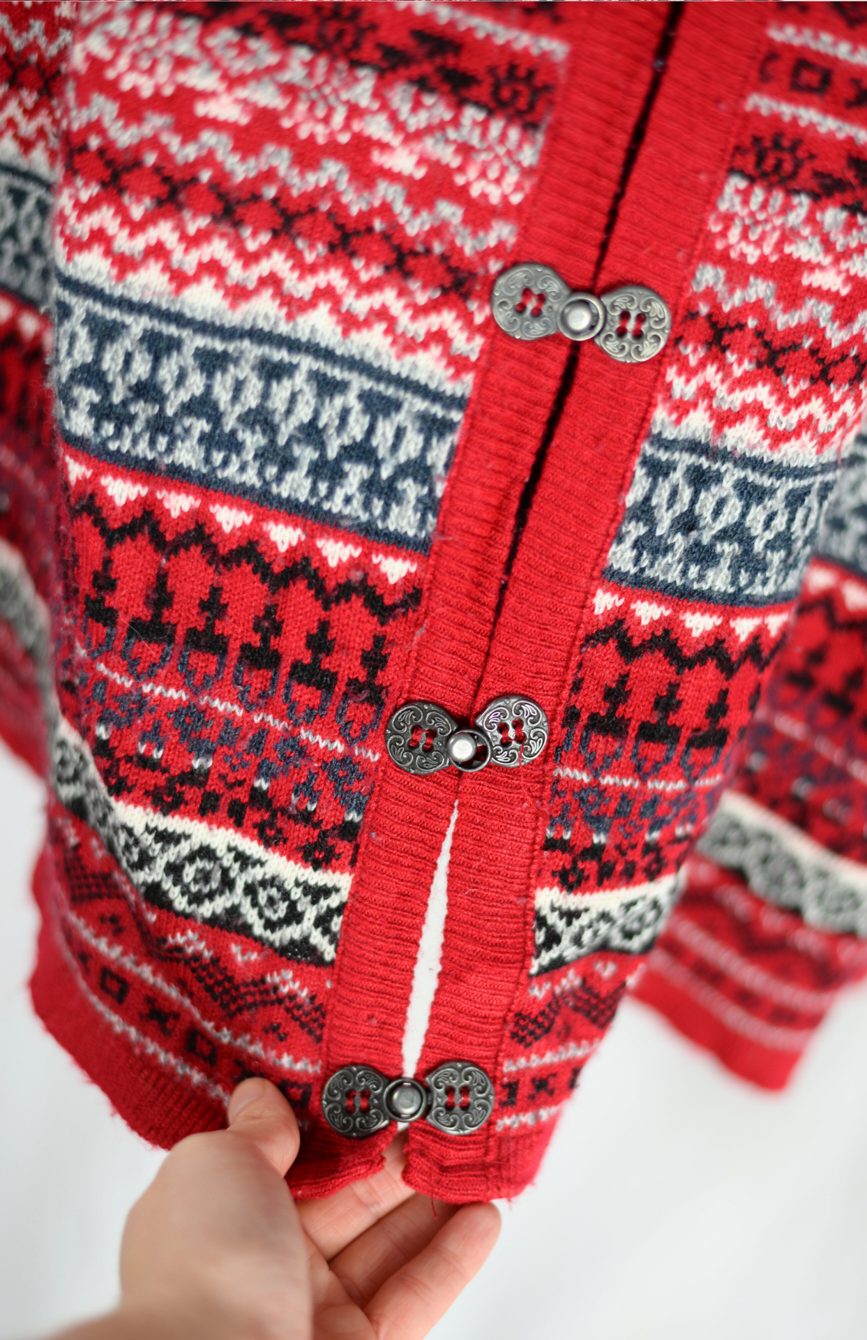 Delší norský svetr s drobným kontrastním vzorem. Má zdobené, proplétací kovové háčky po celé délce.