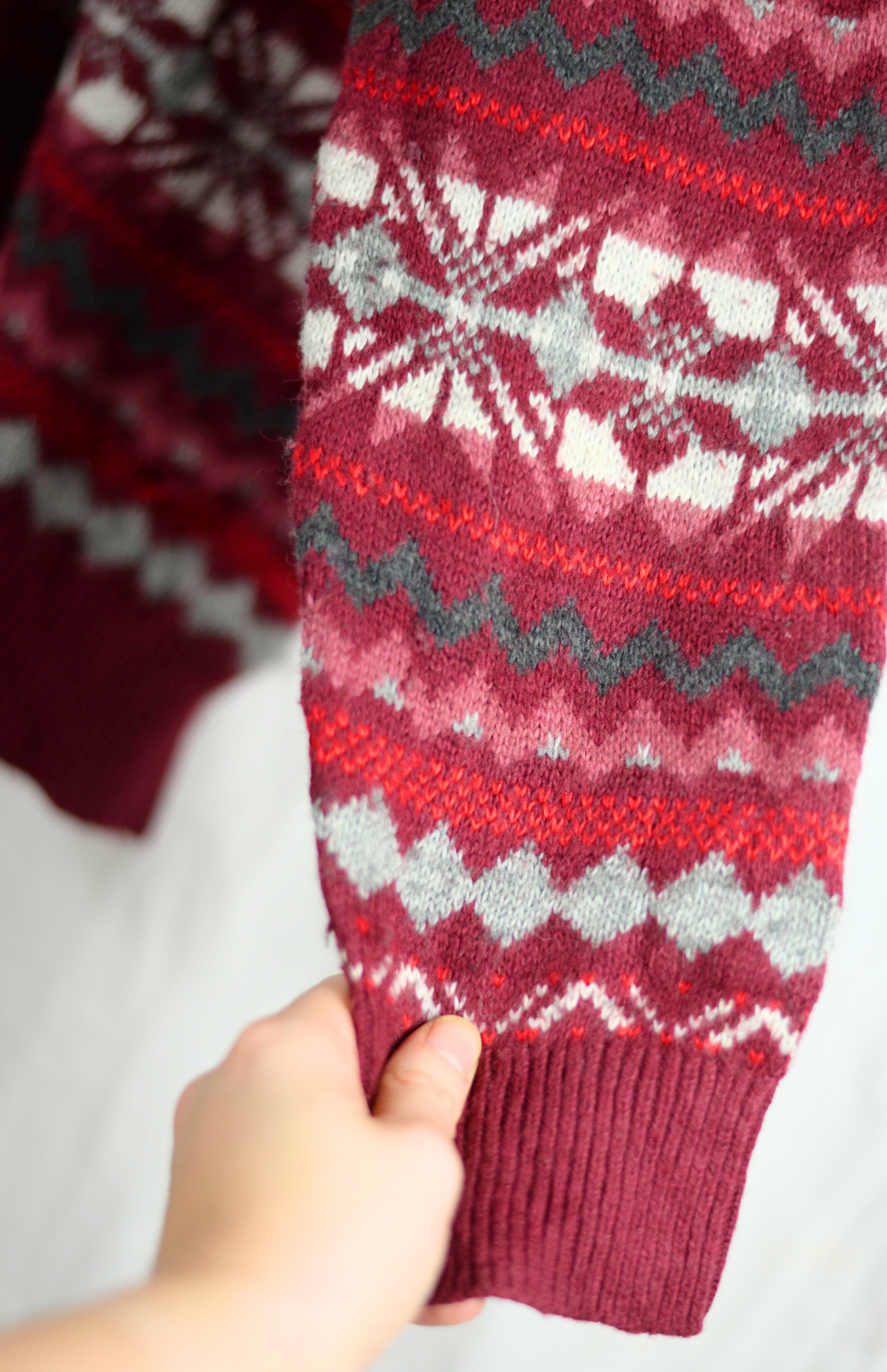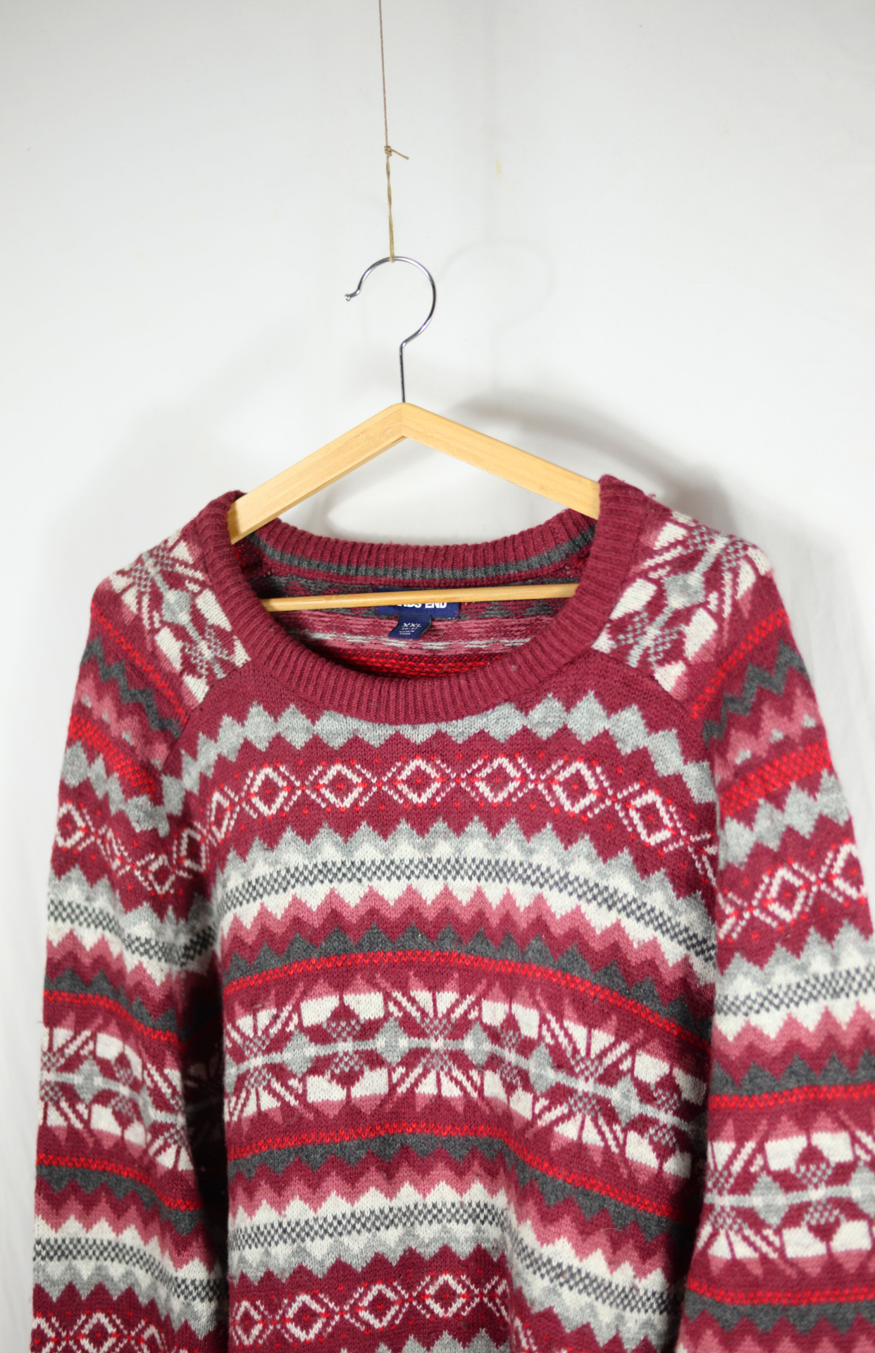 Červený funky svetr se zimním vzorem. Příjemný kousek se středně silným úpletem. Unisex volný střih.