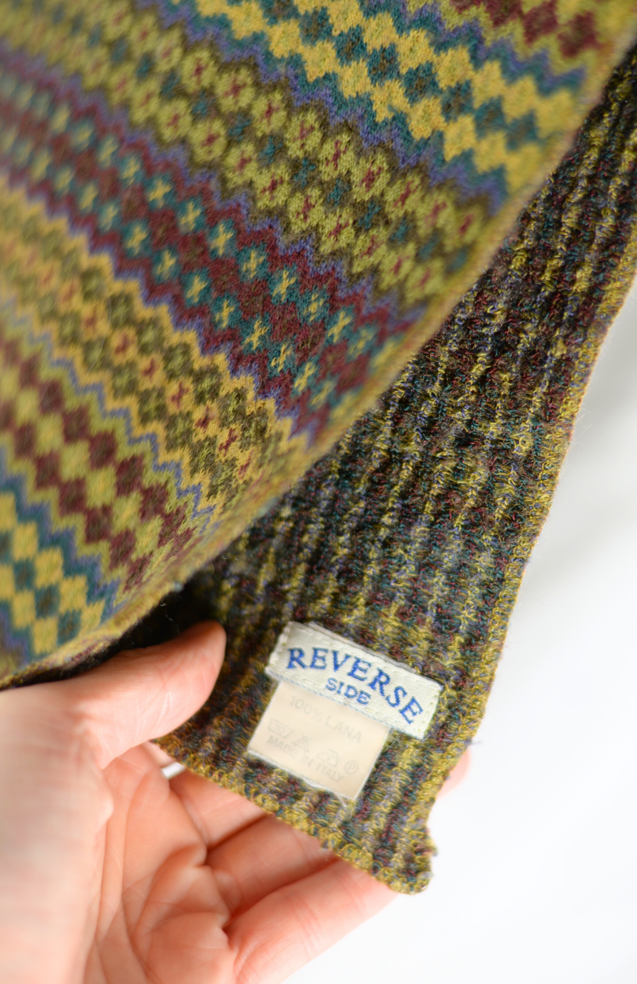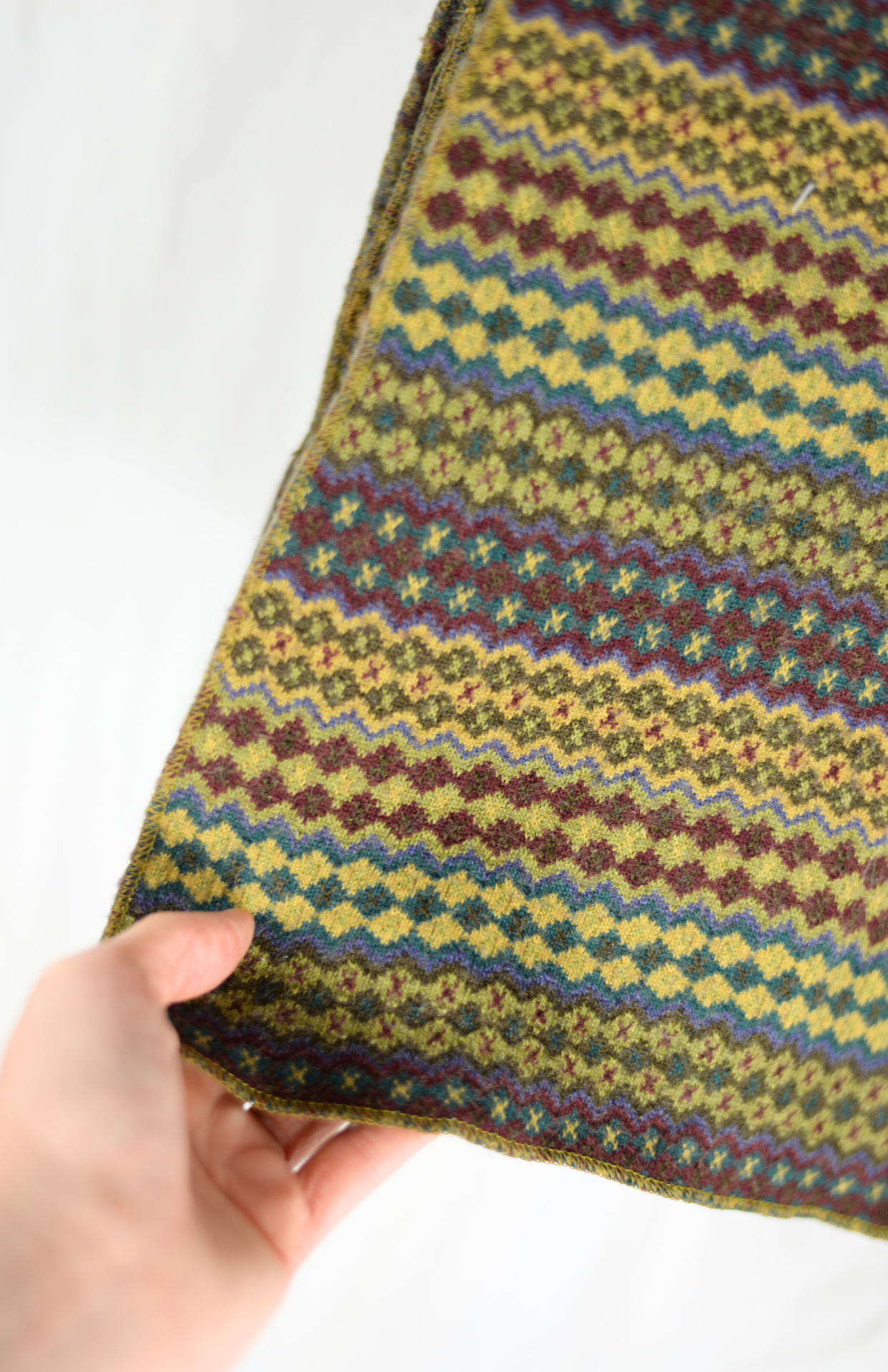 Čistě vlněná barevně vzorovaná šála. Má užší a dlouhý střih. Z jedné strany jemný vzor, z druhé výraznější a barevný. Pěkně zpracovaná a bez střapců.