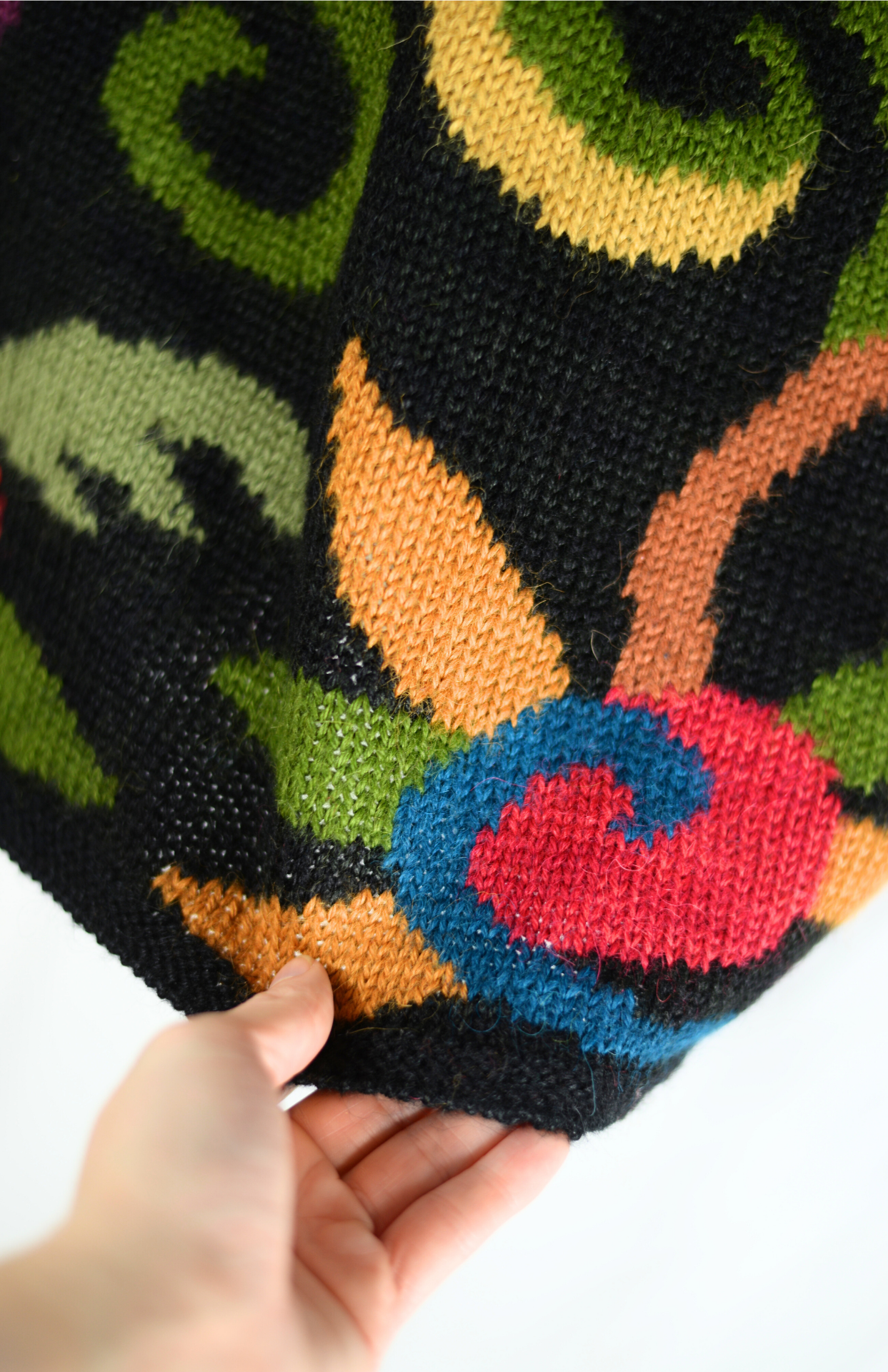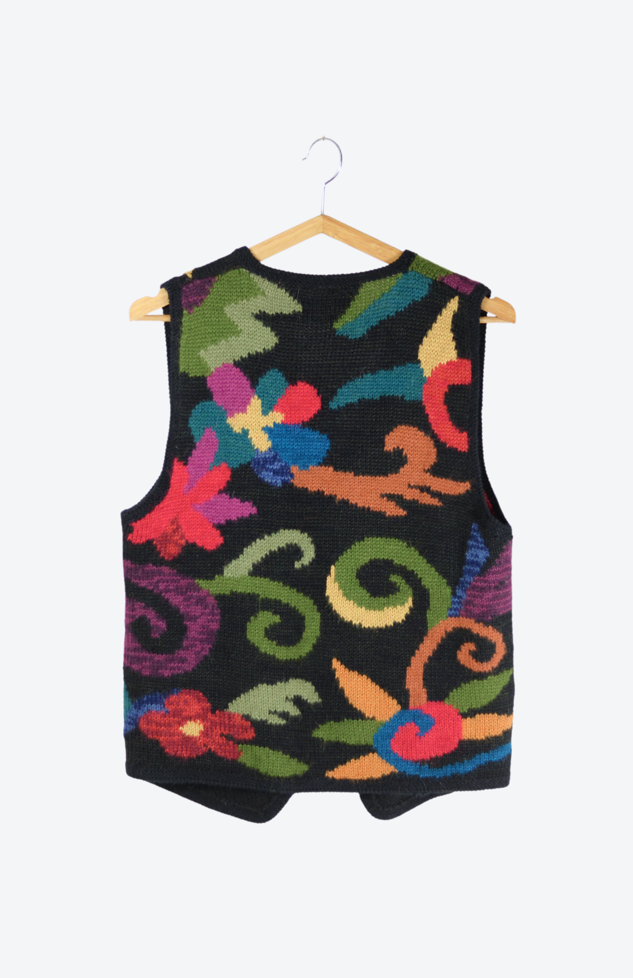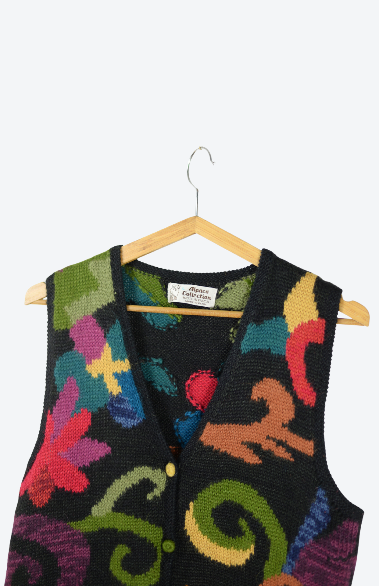 Krásná teplá vesta z čisté alpaka vlny. Silnější úplet s barevnými květinami po celé své ploše. Má různo-barevné knoflíčky potažené úpletem. Velmi pěkně zpracovaná.