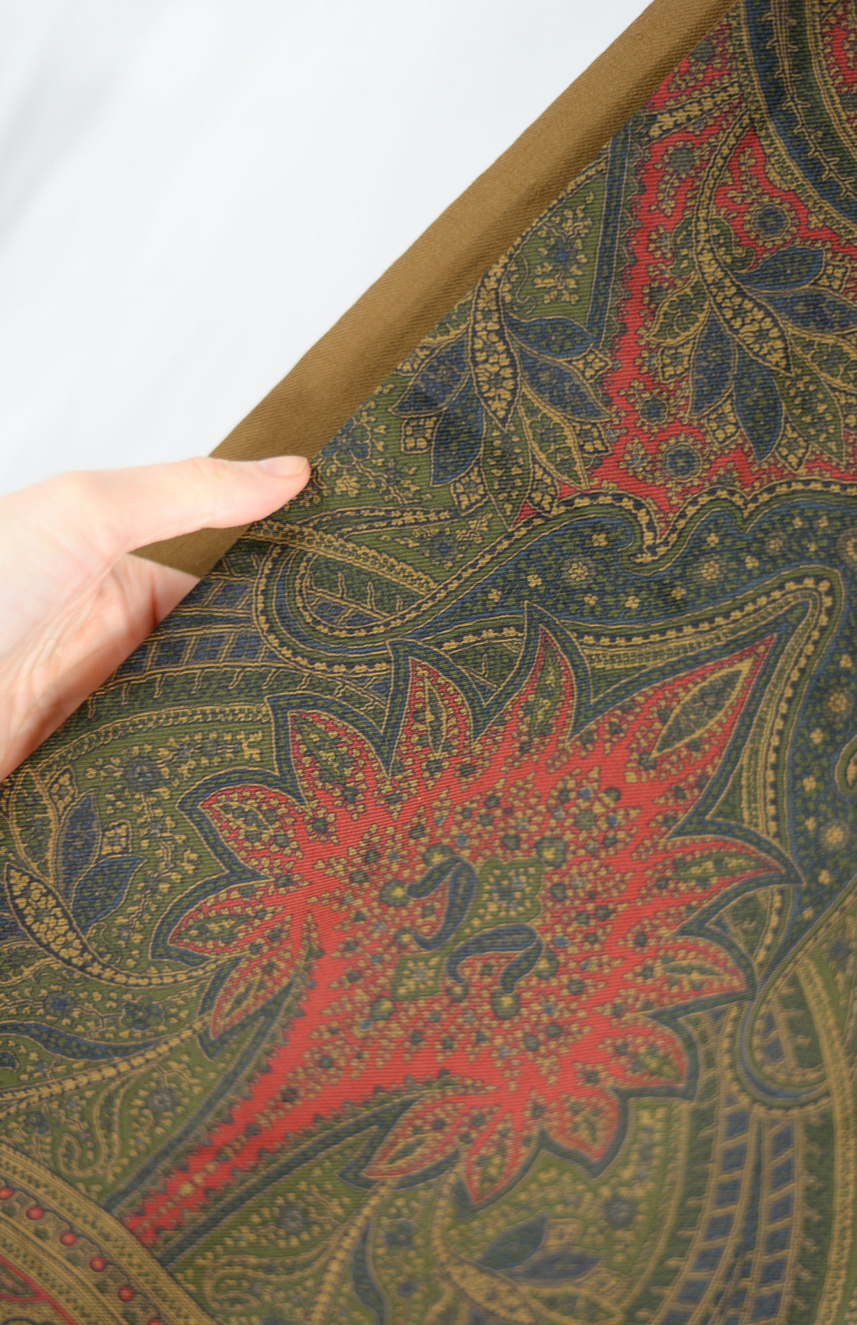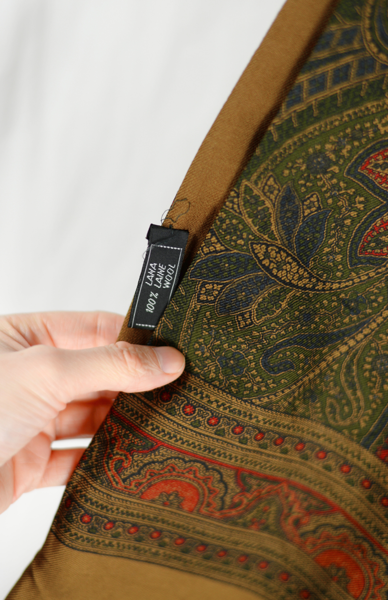 Čistě vlněná vzorovaná šála. Zajímavě zpracovaná - vzadu vlněný hladký úplet, vpředu saténový se vzory.