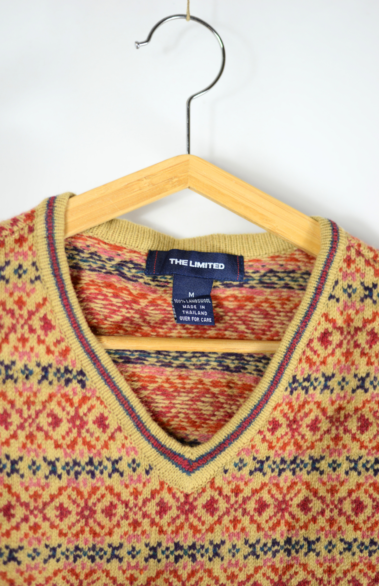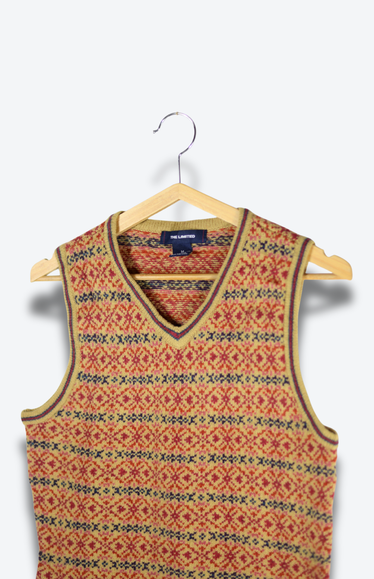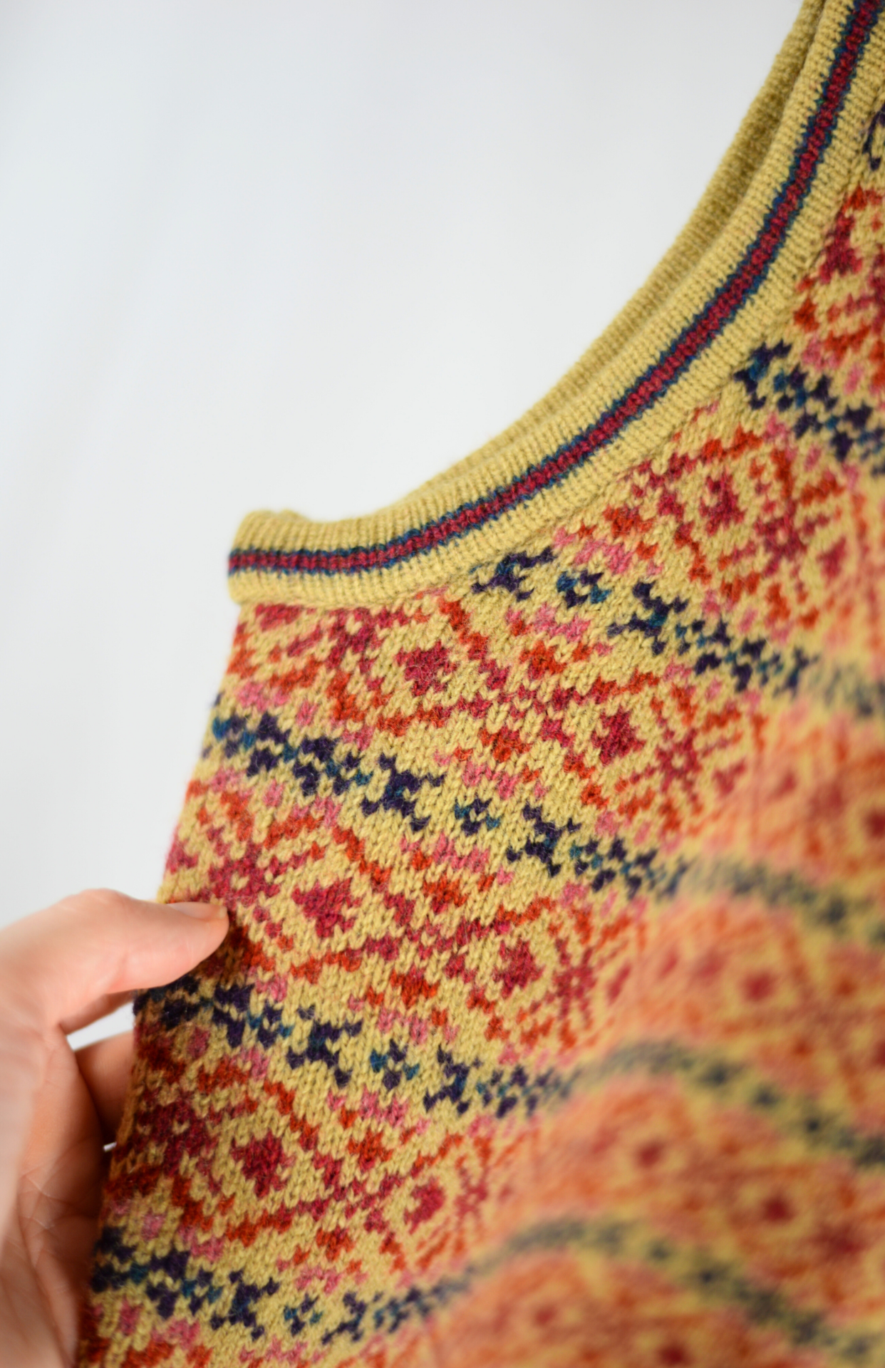Vlněná vzorovaná vesta s drobným barevným vzorem. Má proužek lemované okraje. Kratší střih, ideální k vrstvení. Velmi pěkně zpracovaný vintage kousek.
