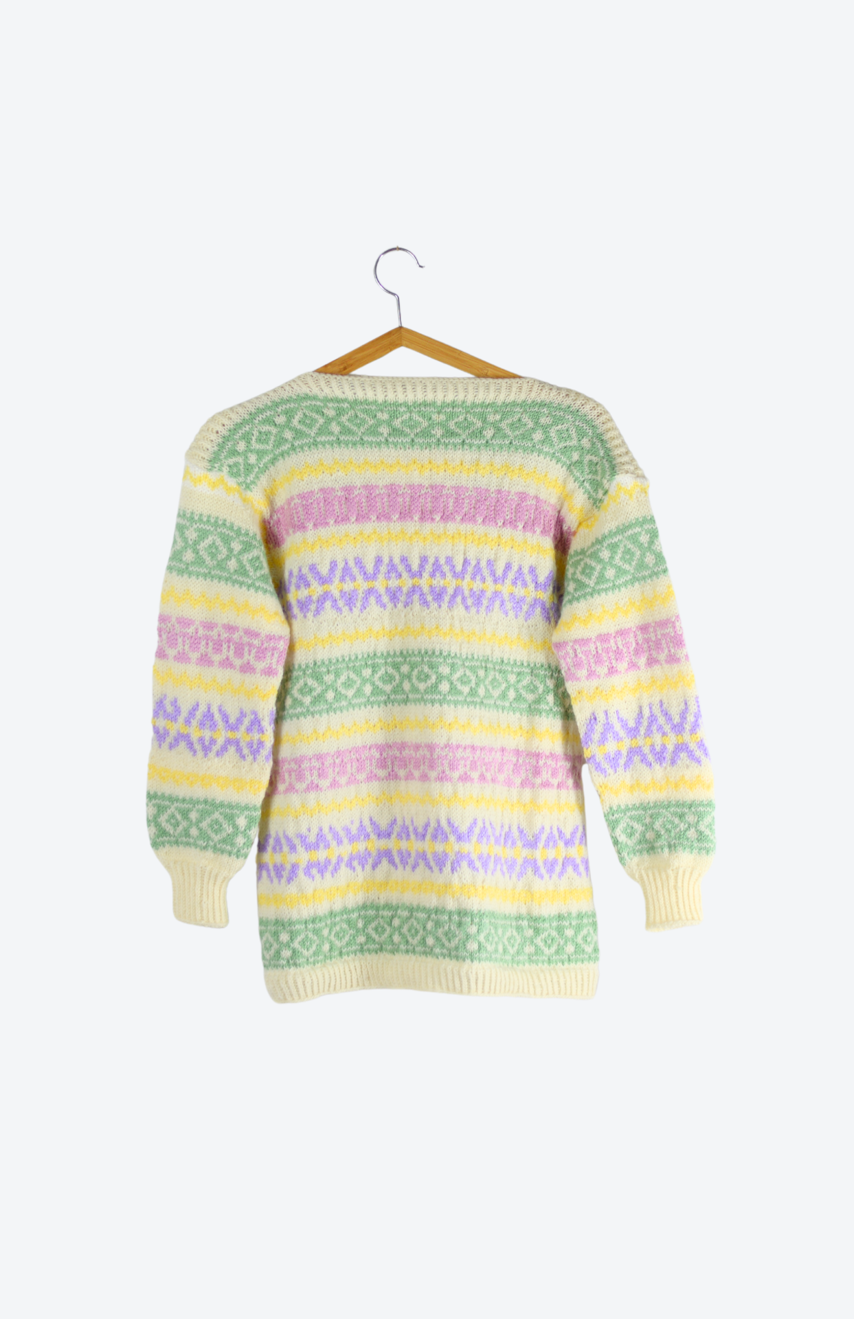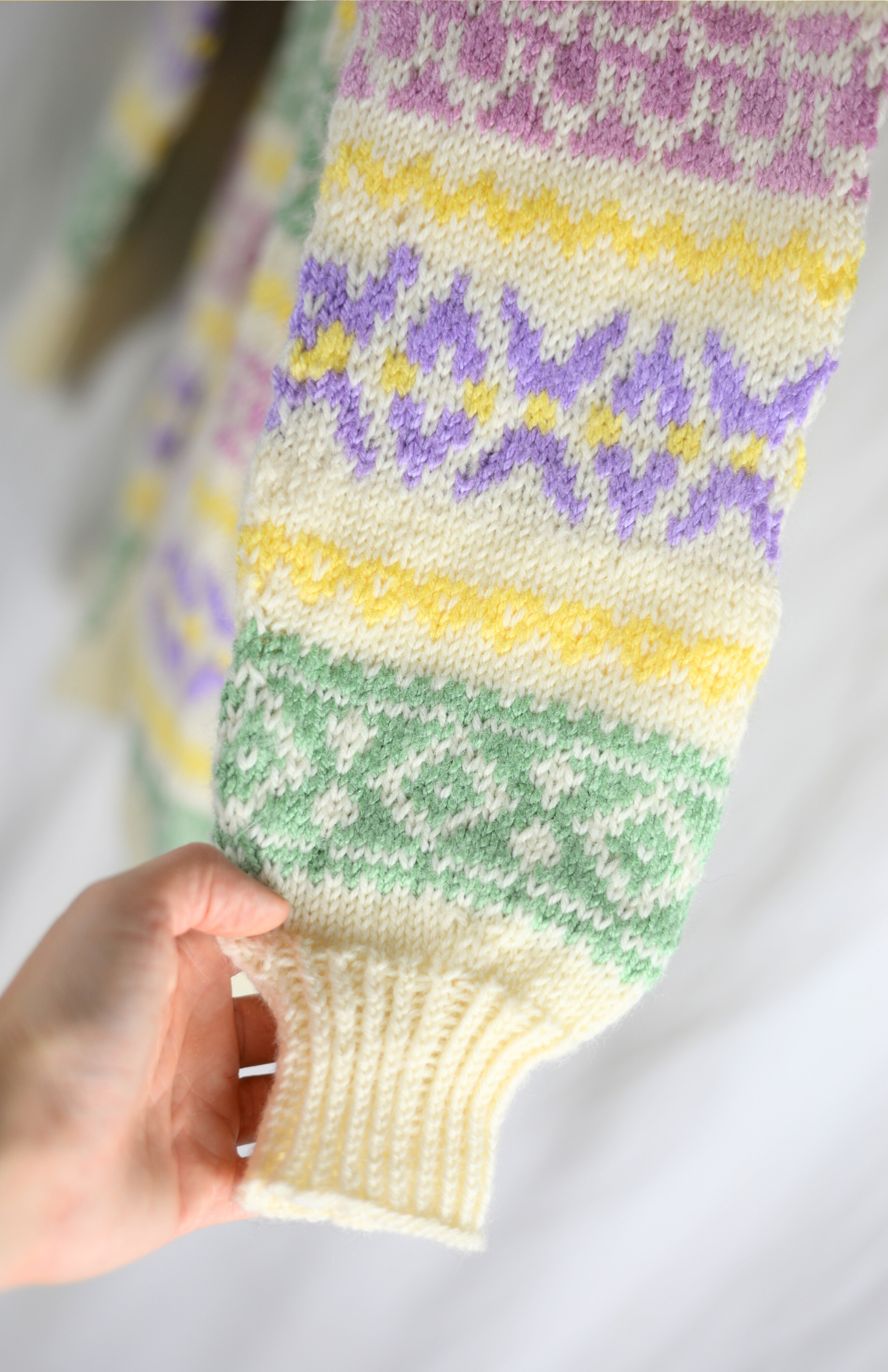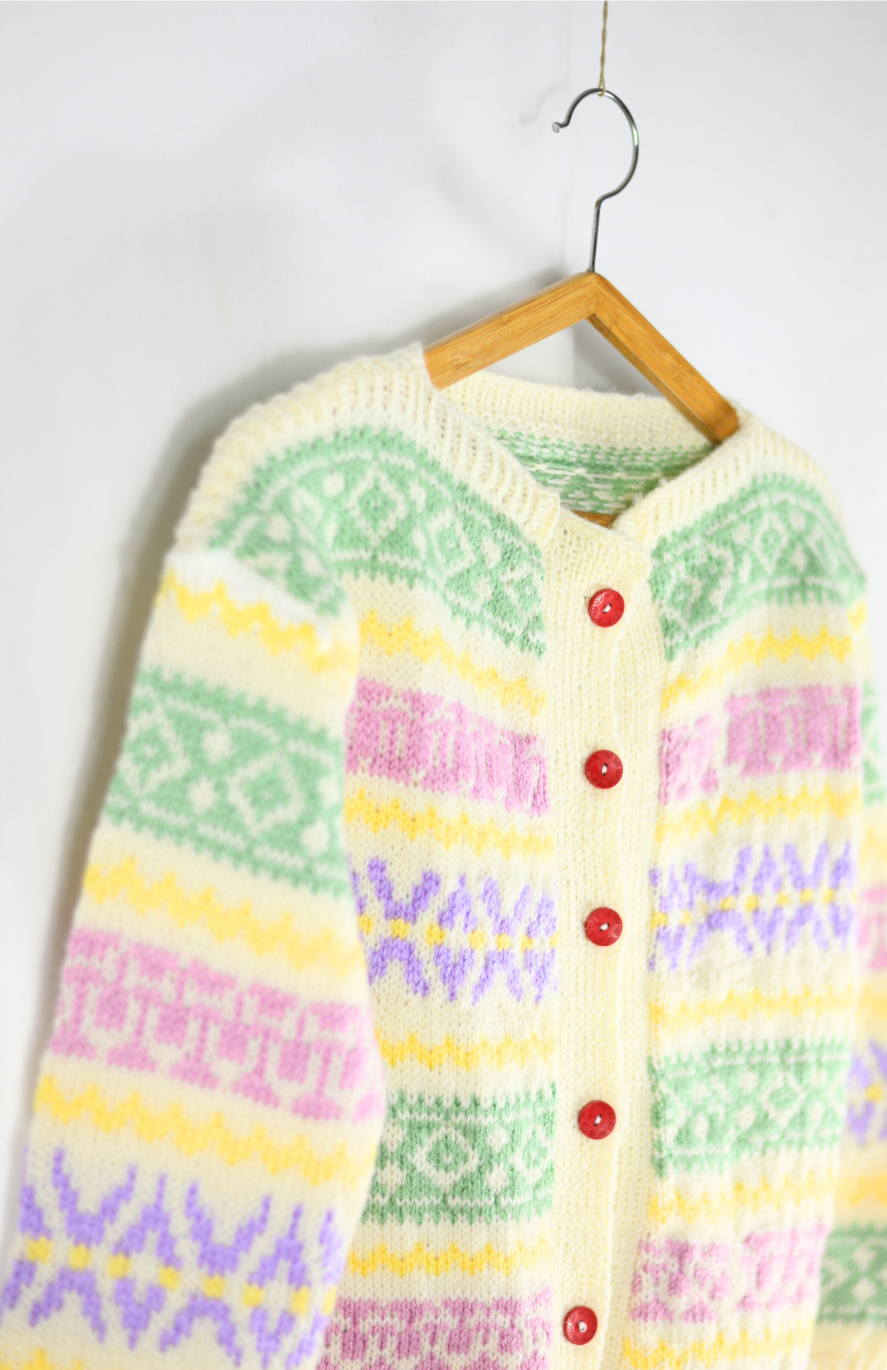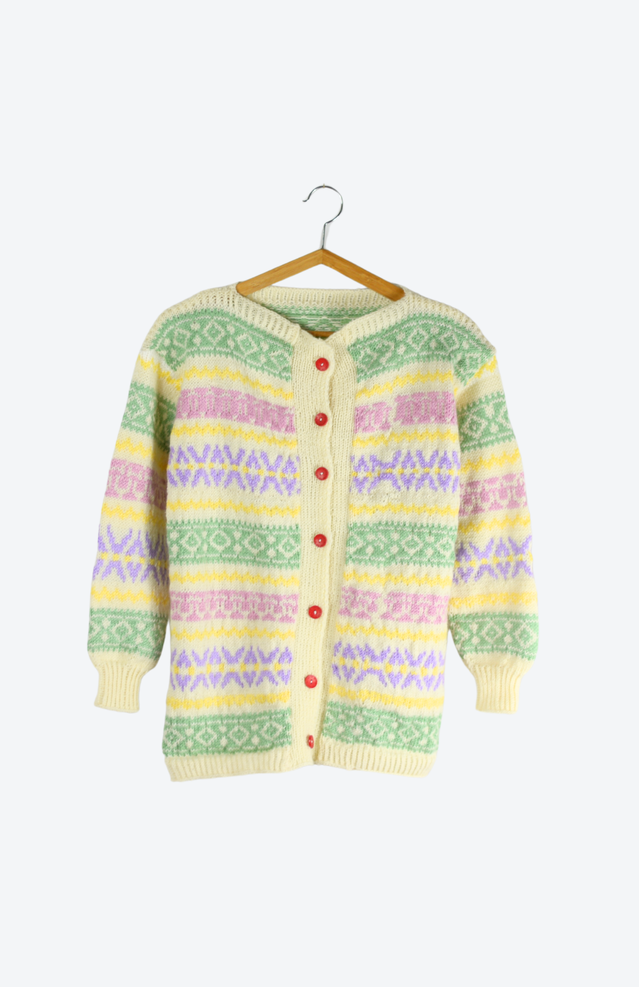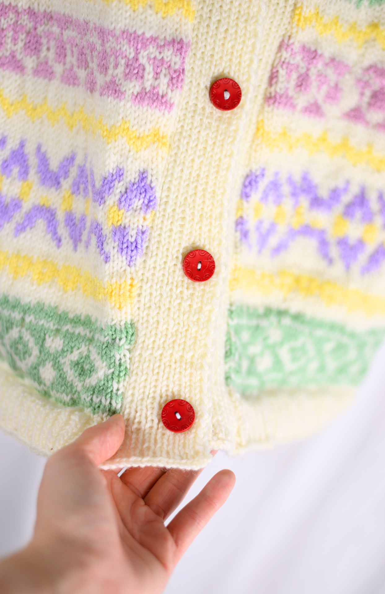 Krásný retro pletený svetr s pastelovými vzory. Má zapínání na červené knoflíky, jemně nabíraný rukáv a lodičkový výstřih. Teplý, silnější úplet.