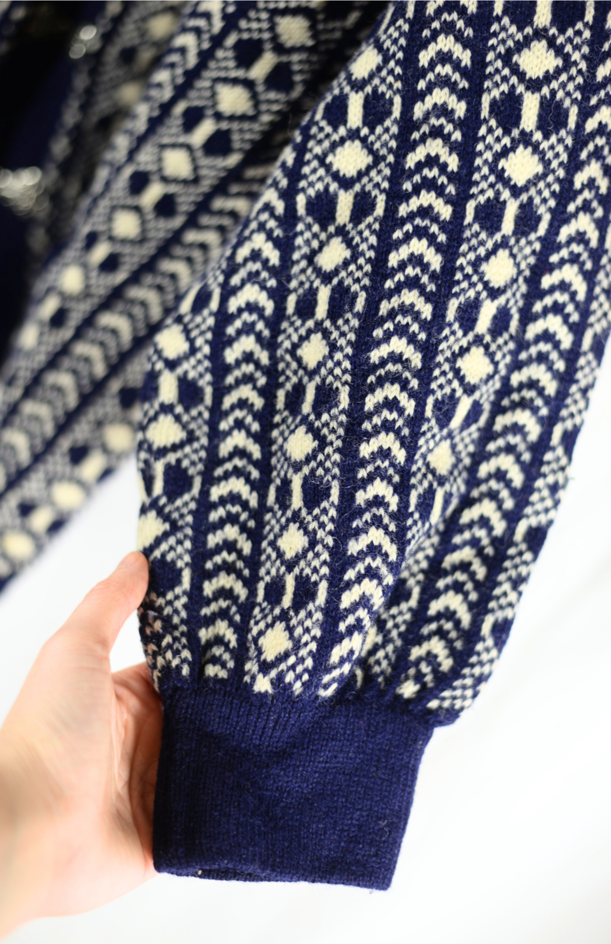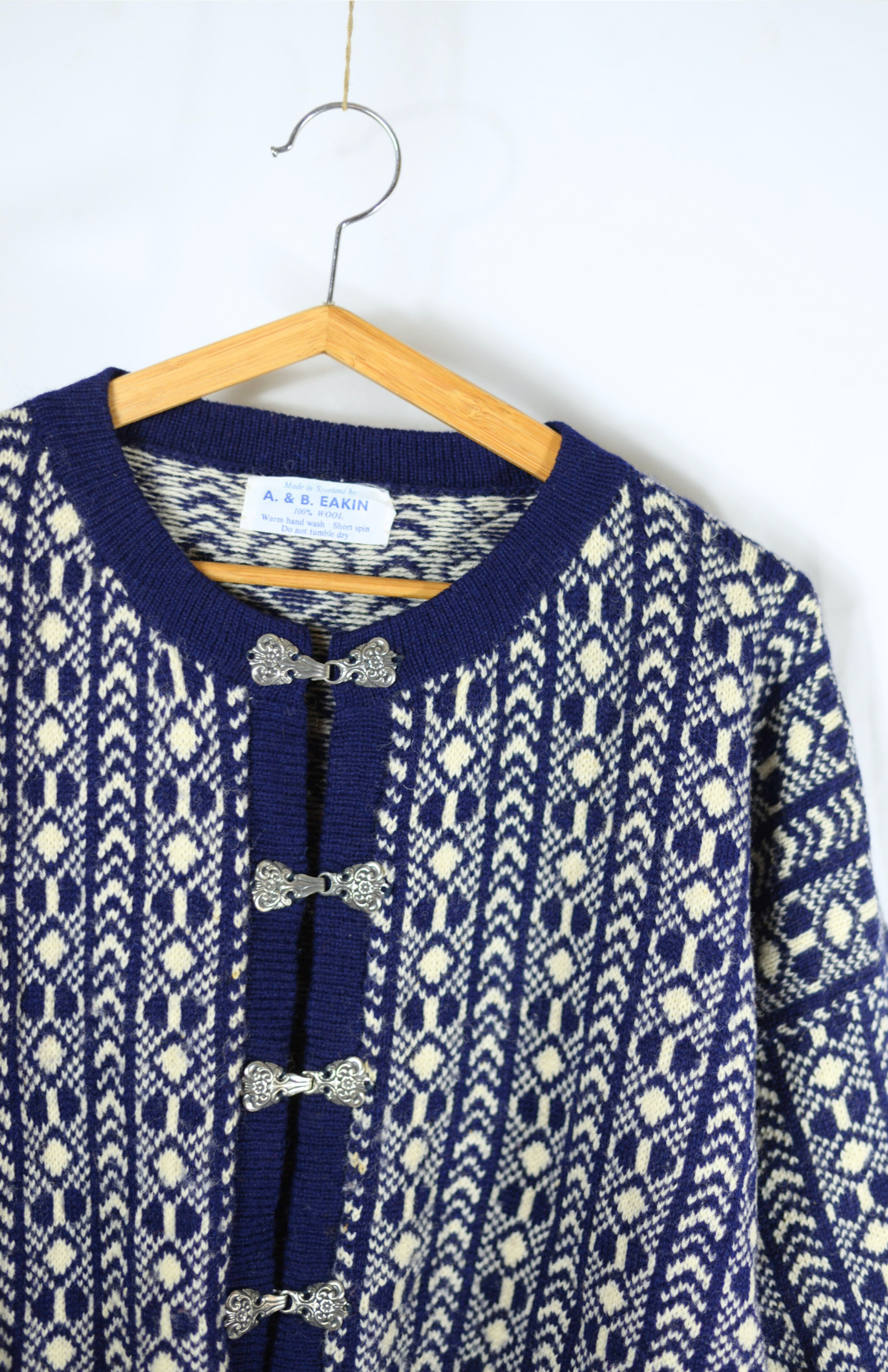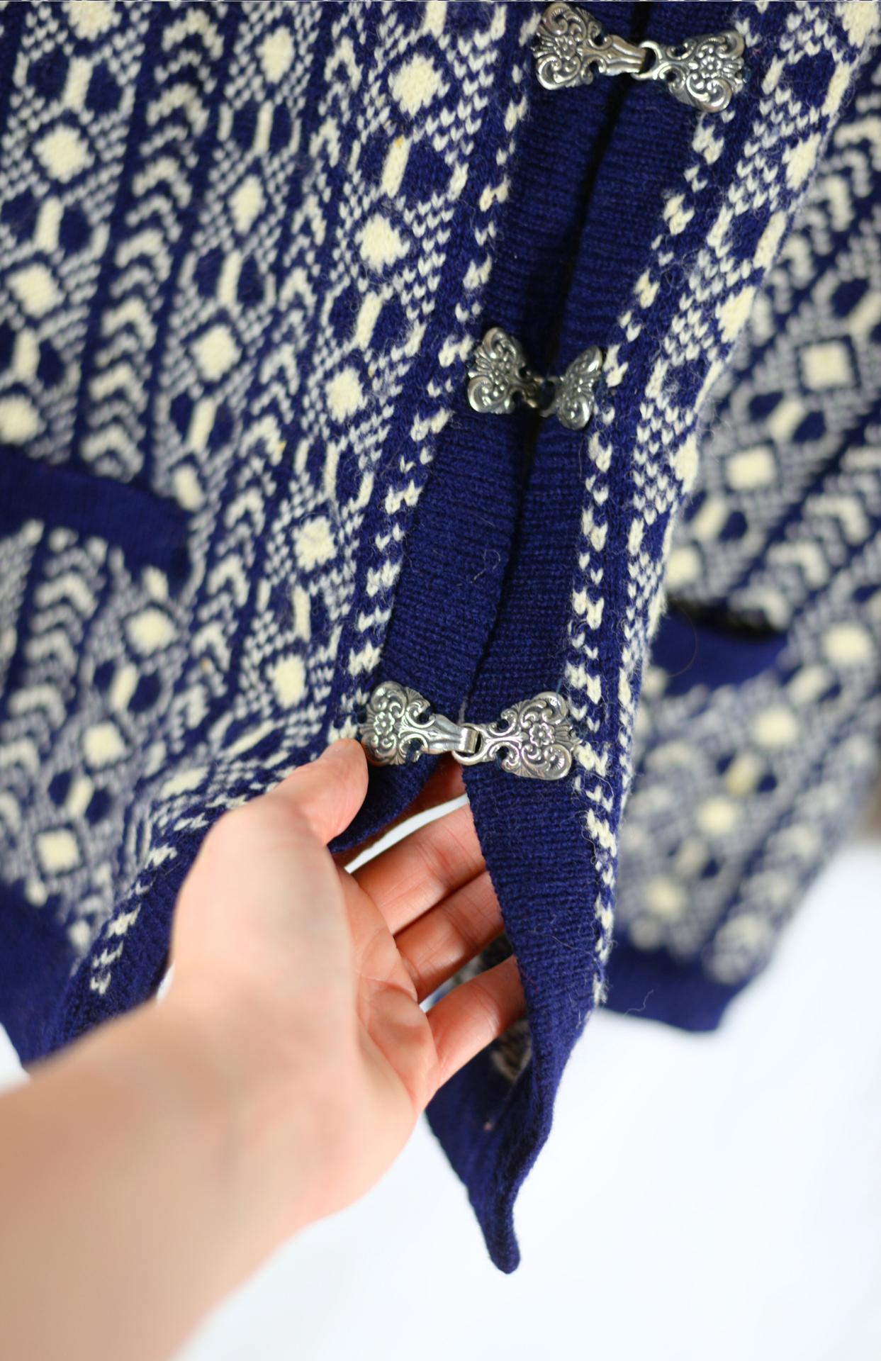 Silný teplý vintage svetr z čisté vlny. Má lehce nabíraný rukáv, drobné kapsy na bocích a krásné zdobené zapínání na kovové háčky. Tmavomodrý vzor. Velmi pěkně zpracovaný.