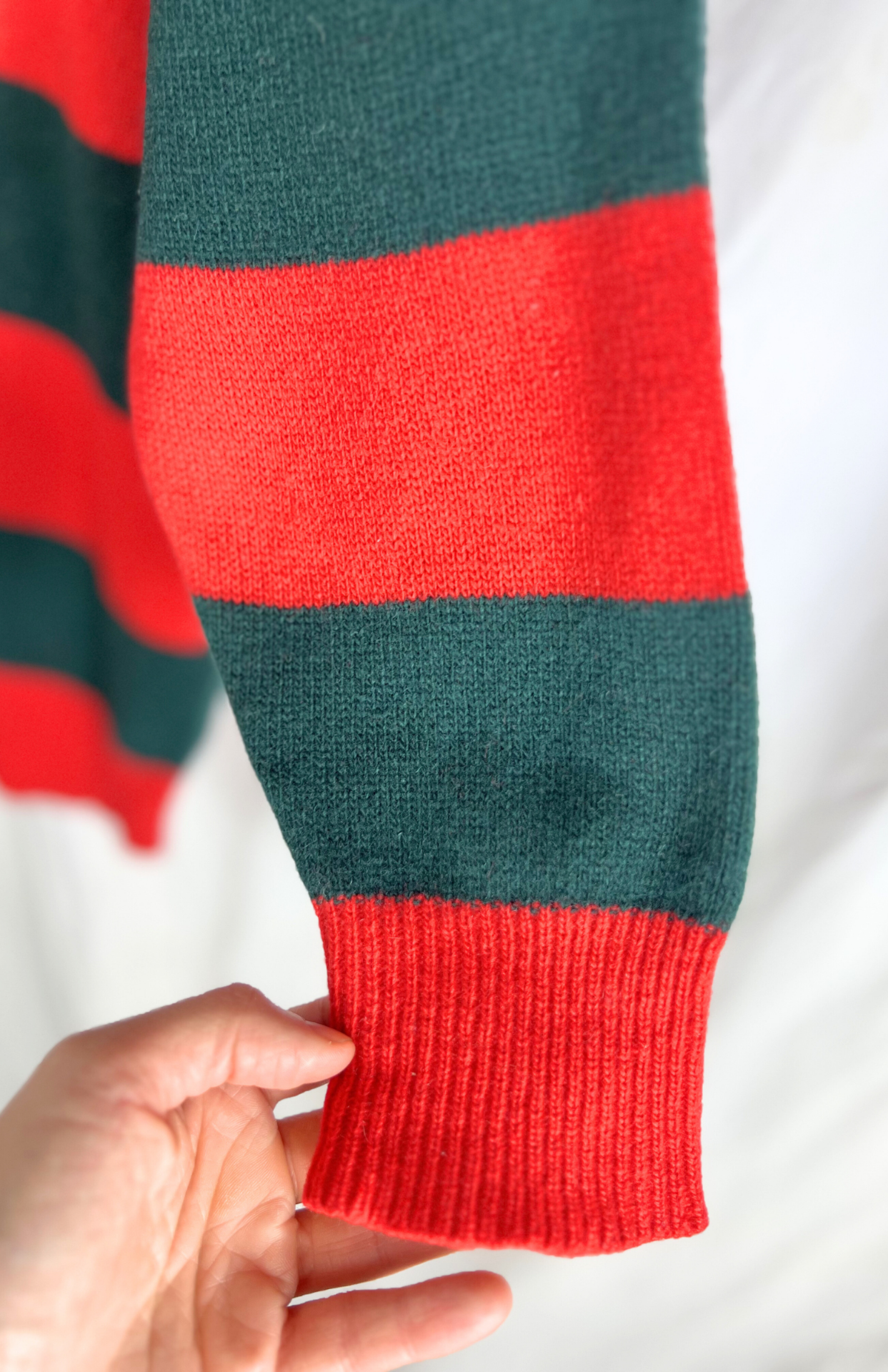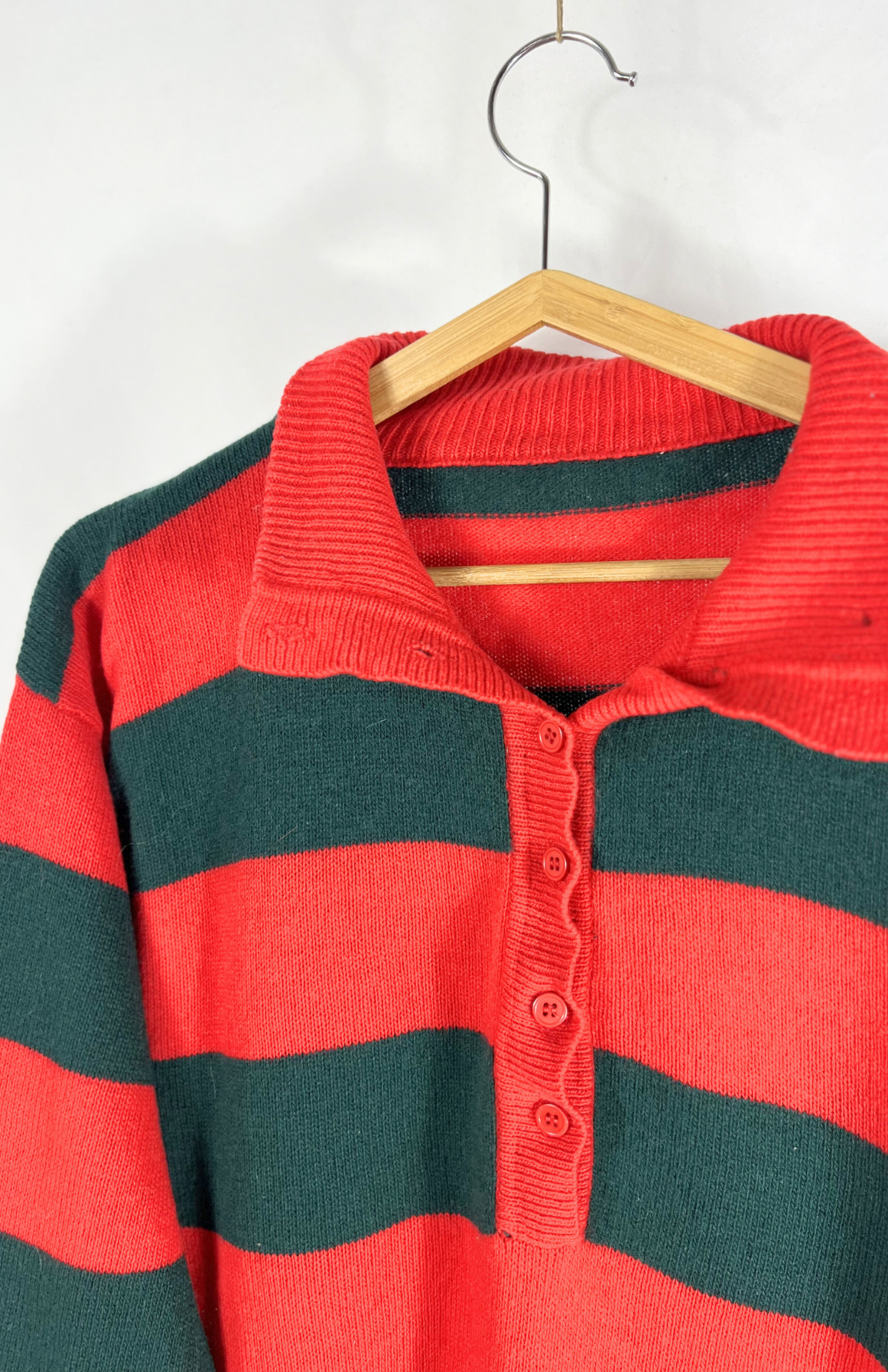 Čistě vlněný proužkovaný svetr. Zelená & červená. Má lehce nabírané rukávy a rozhalenku s límečkem a knoflíky. Stav: Vintage kousek v pěkném stavu. Pouze drobné opravené dírky.