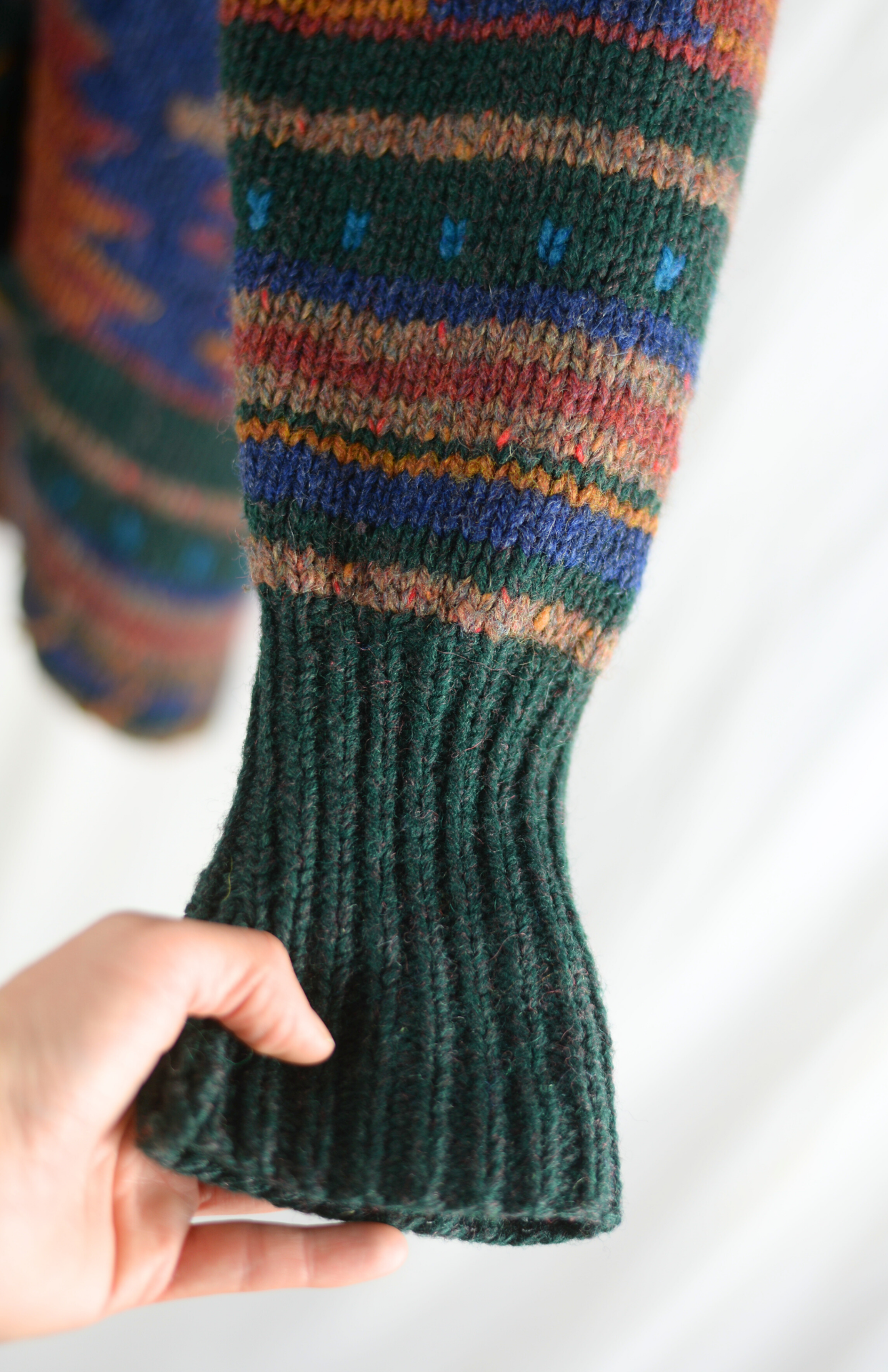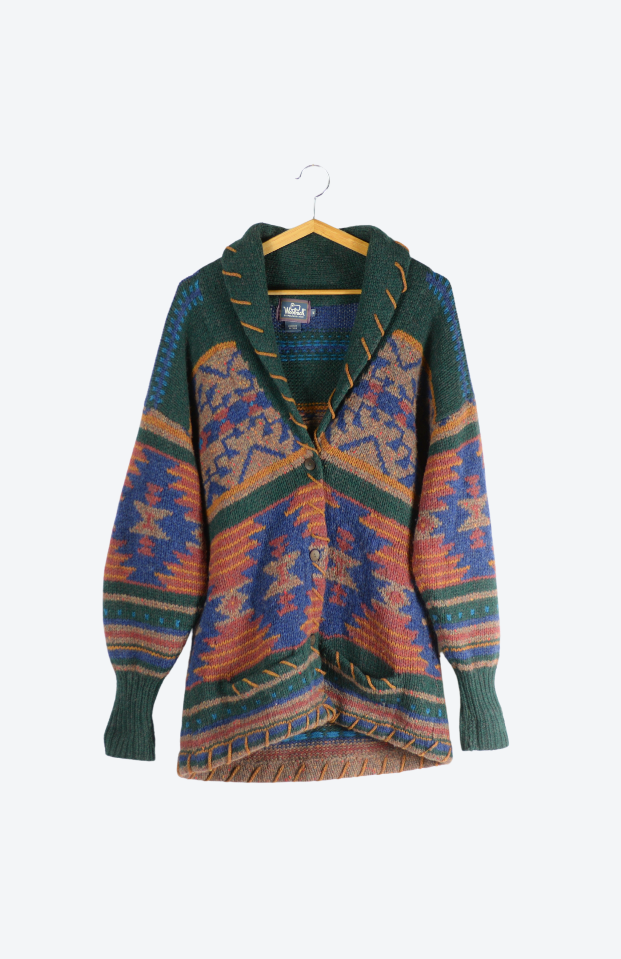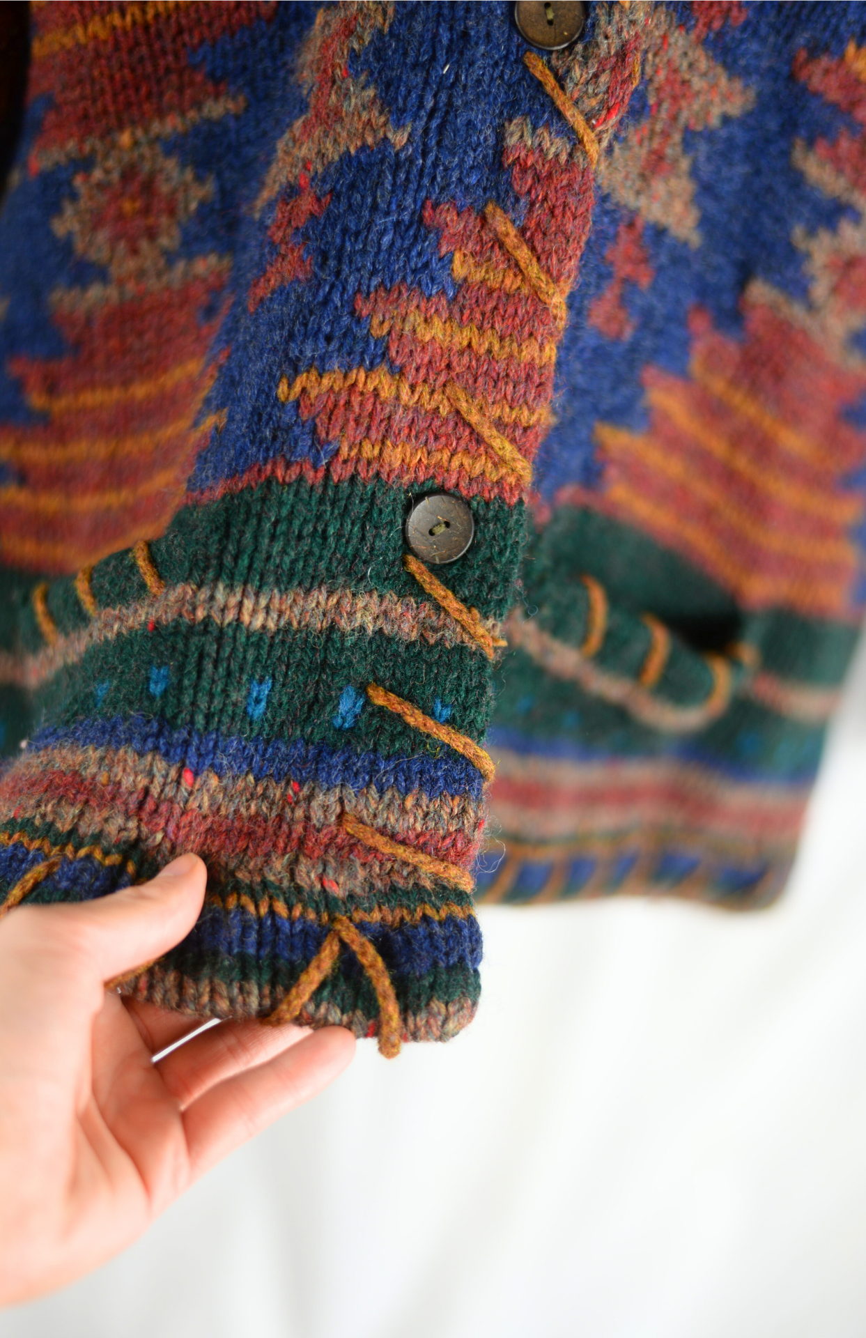 Extra silný, čistě vlněný svetr. Má výrazný, zemitě barevný vzor a zapínání na kokosové knoflíky. Originální funky kousek, na spodu s menšími kapsami.