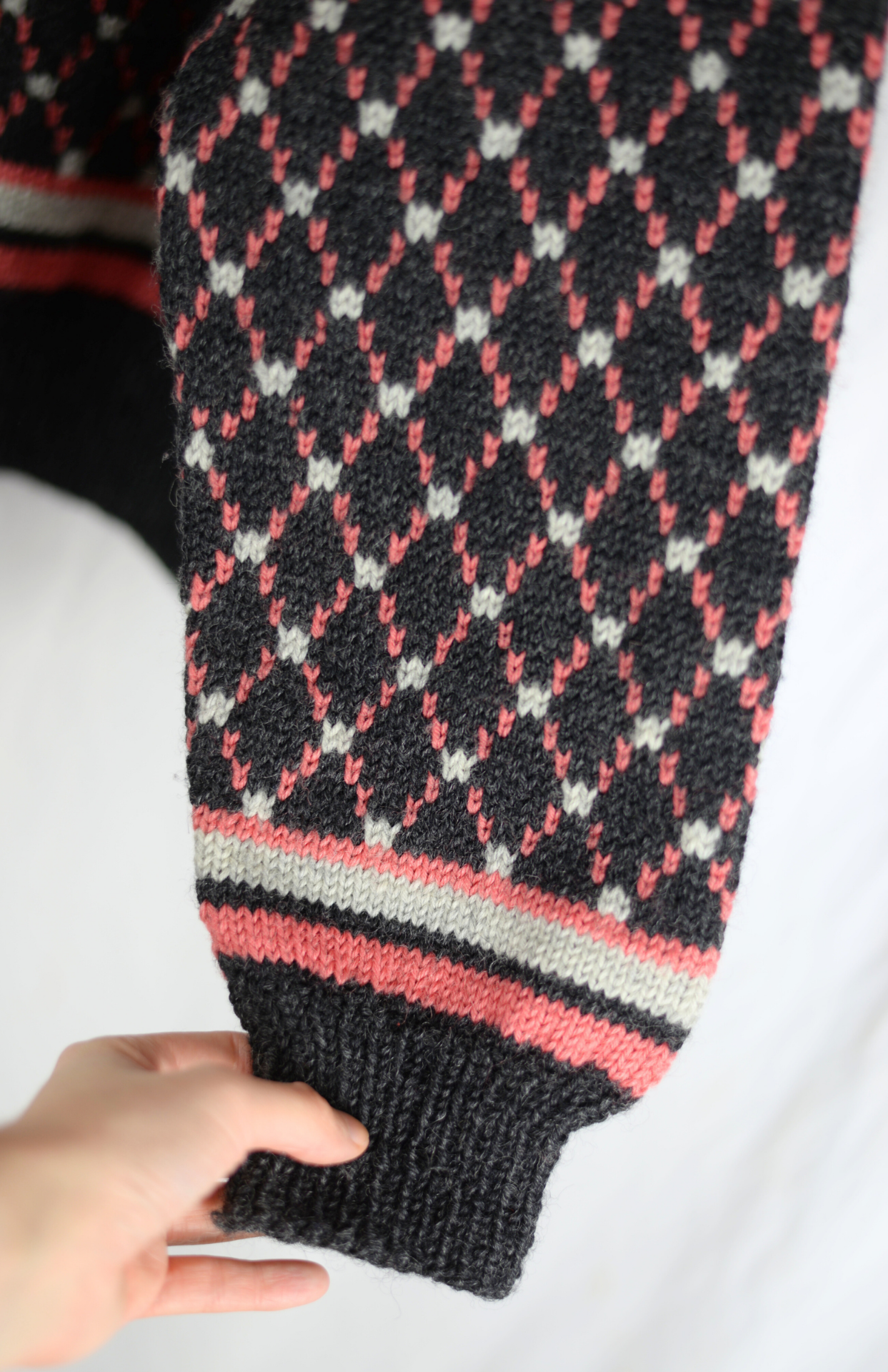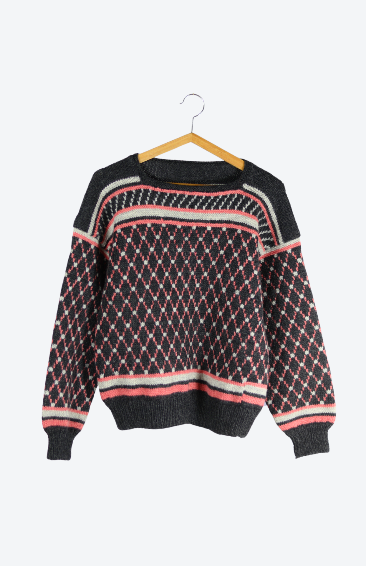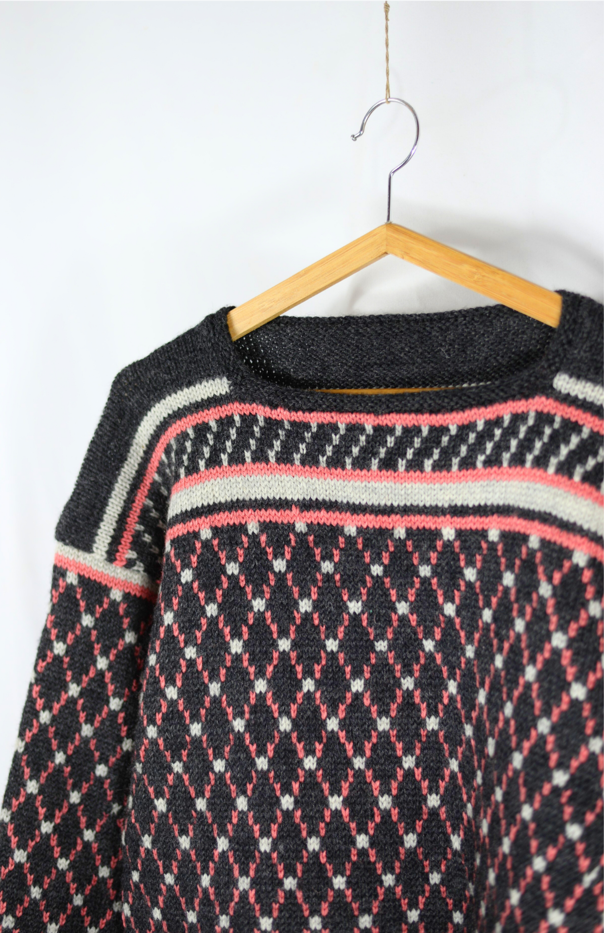 Vlněný retro svetr. Má funky vzor s proužky a kárami. Lehce nabíraný rukáv, lodičkový výstřih a silný teplý úplet. Ručně pletený, originální kousek.