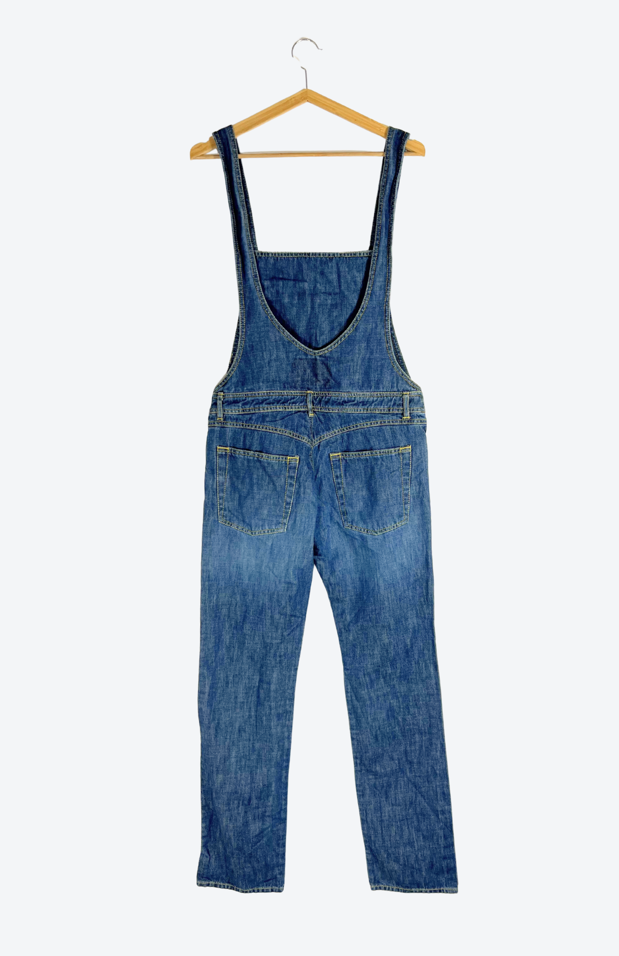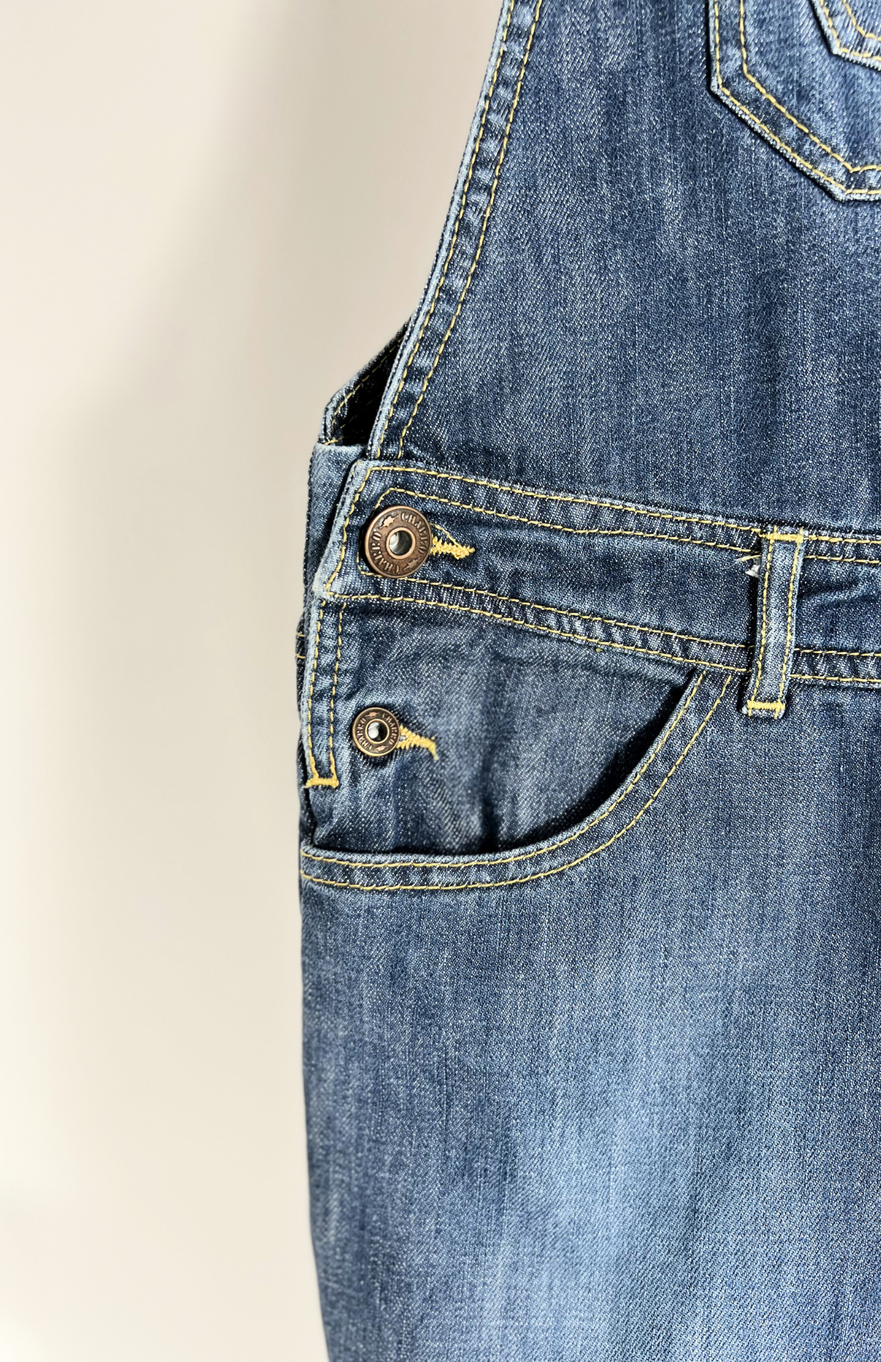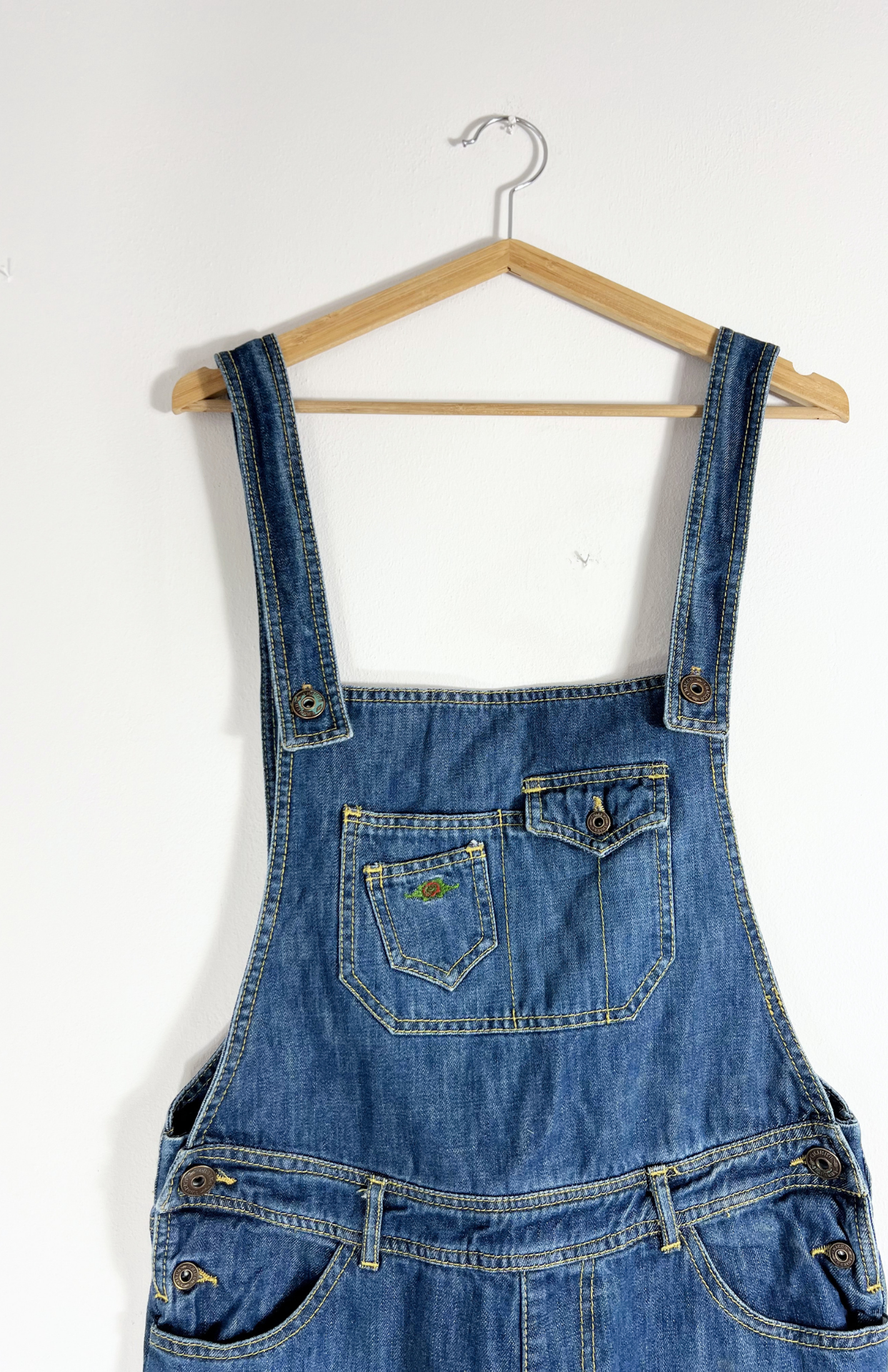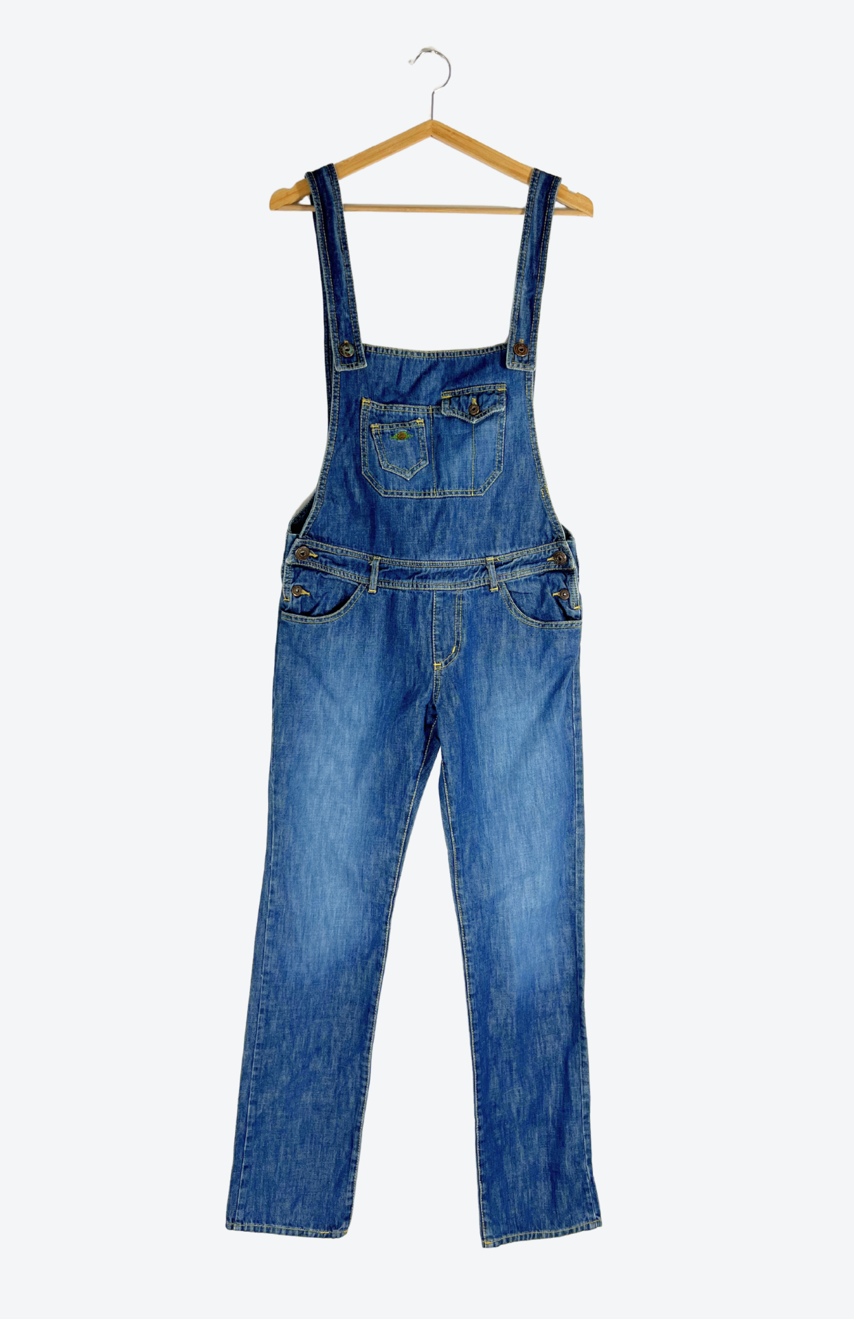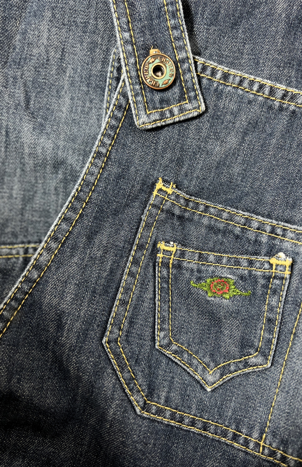Denim retro dlouhý overal. Má lehké žíhání na nohavicích a drobnou výšivku s kytičkou na kapse. Kapsy má i na bocích.