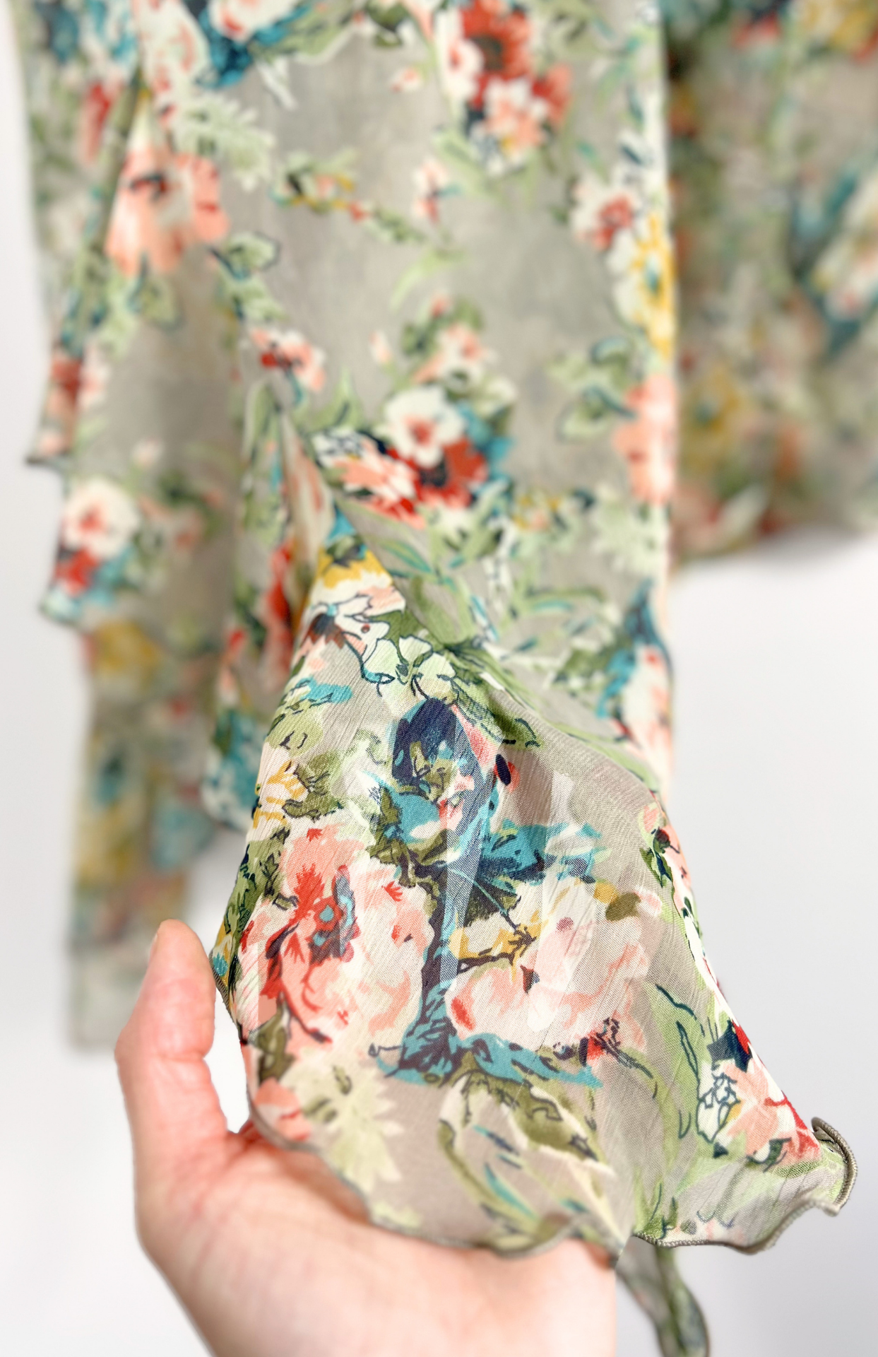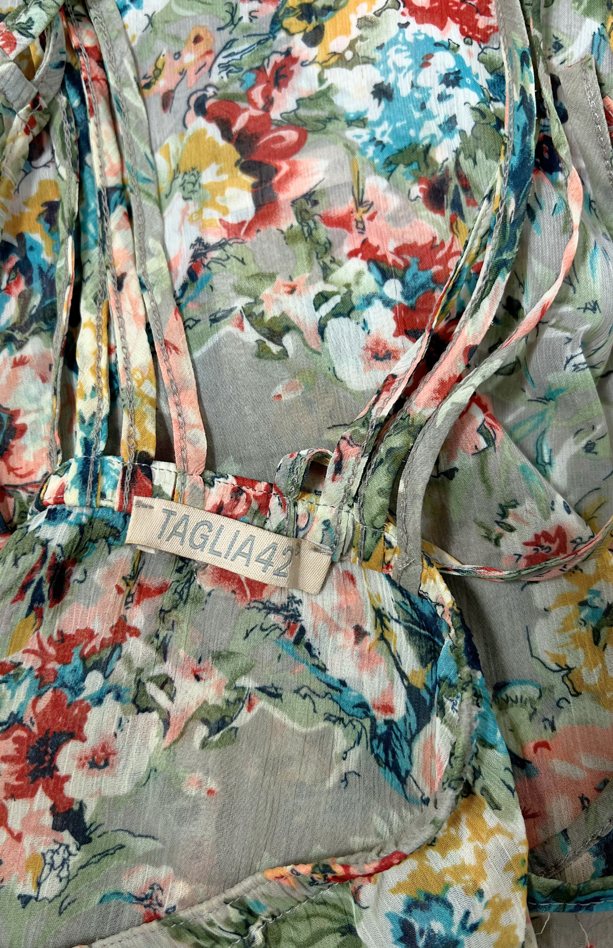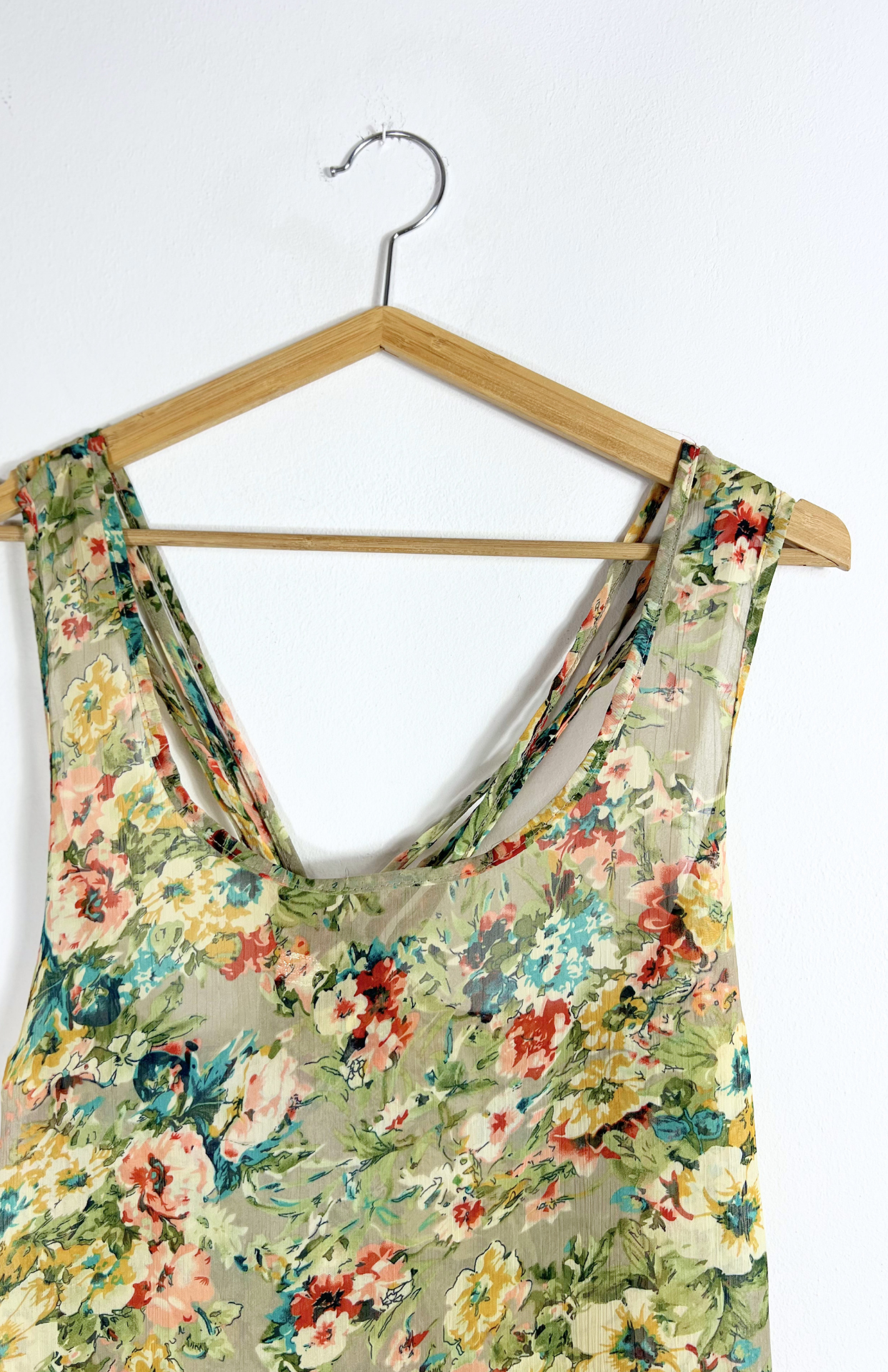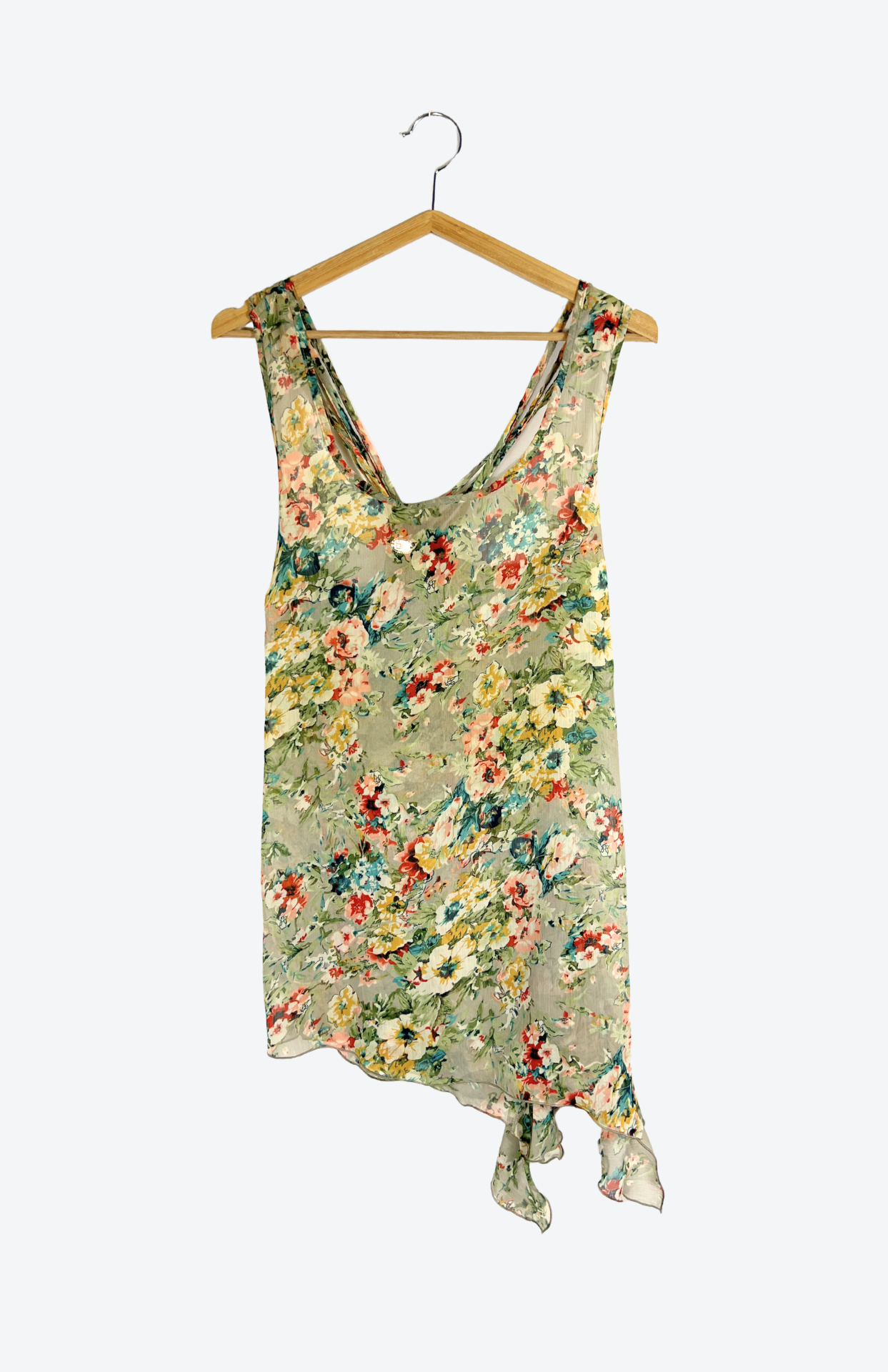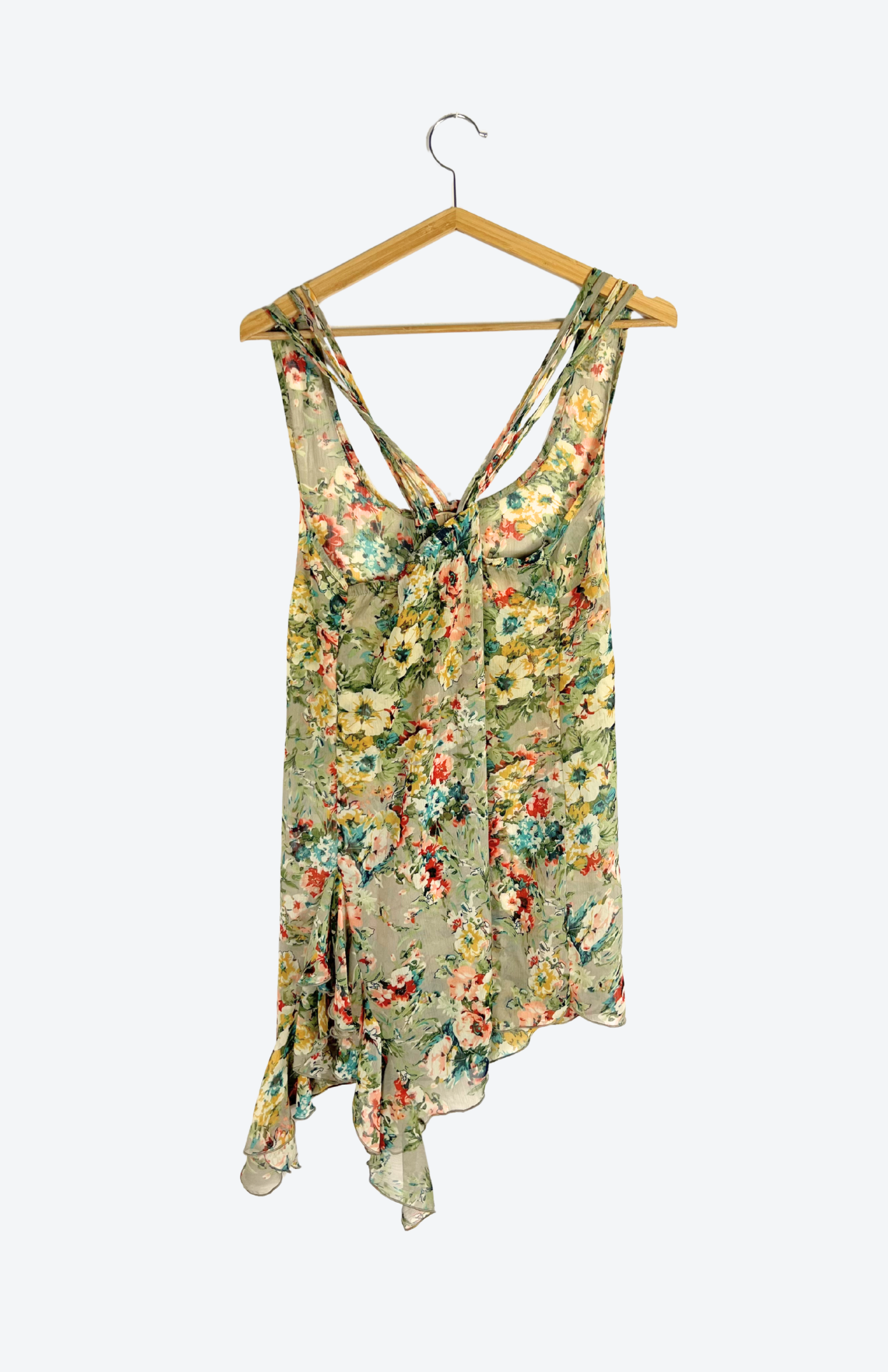 Fairy květinové polotransparentní retro šaty. Asymetrické a s volánkem na jedné straně. Záda s tenkými ramínky. Super kousek k vrstvení.