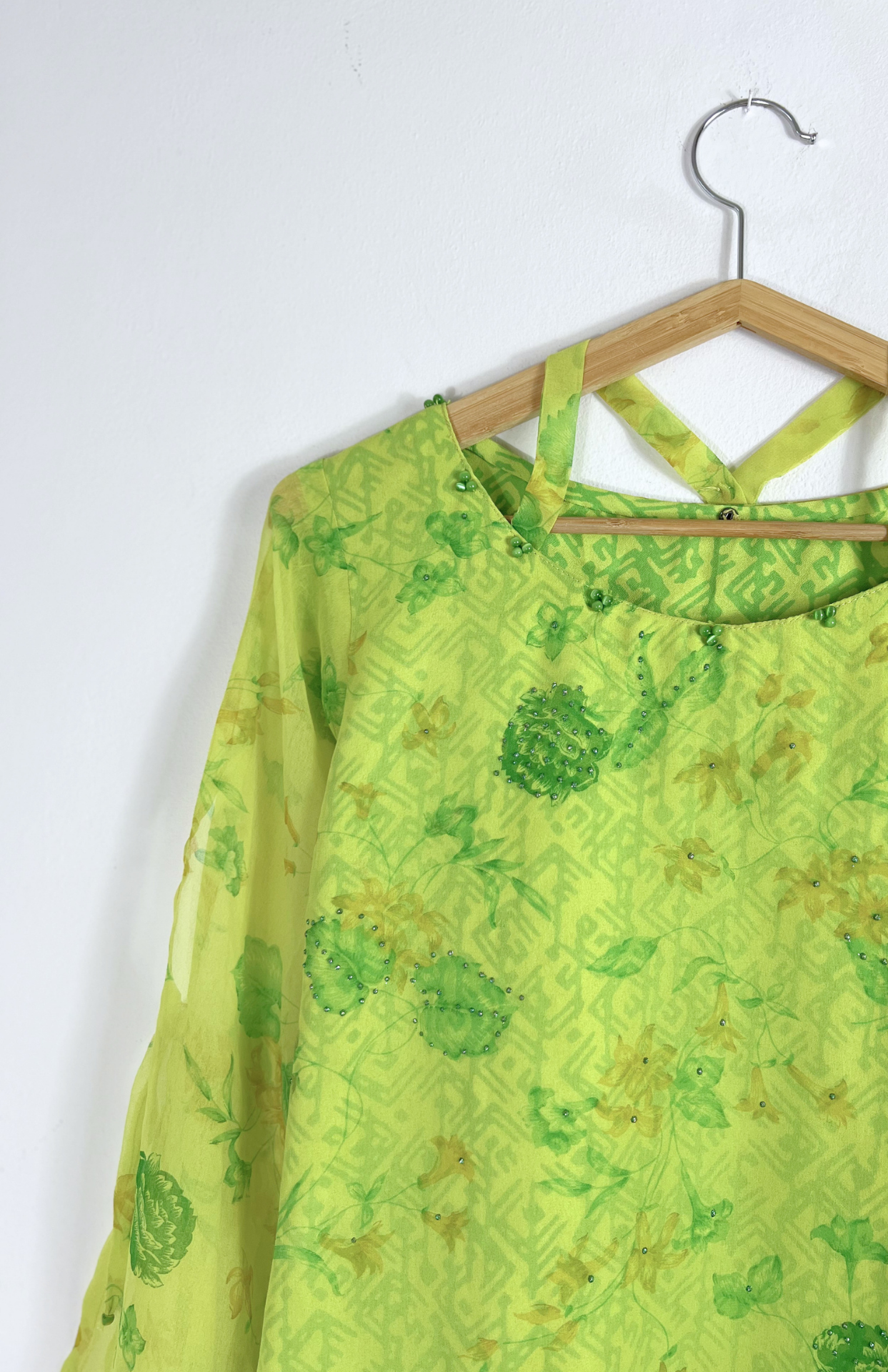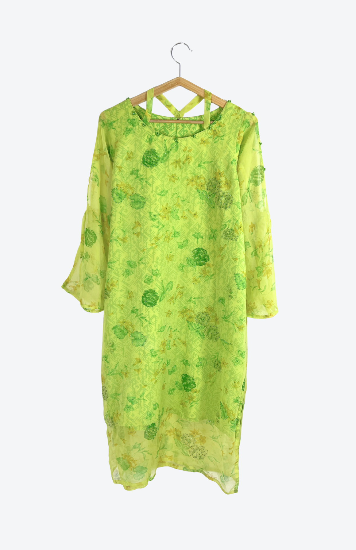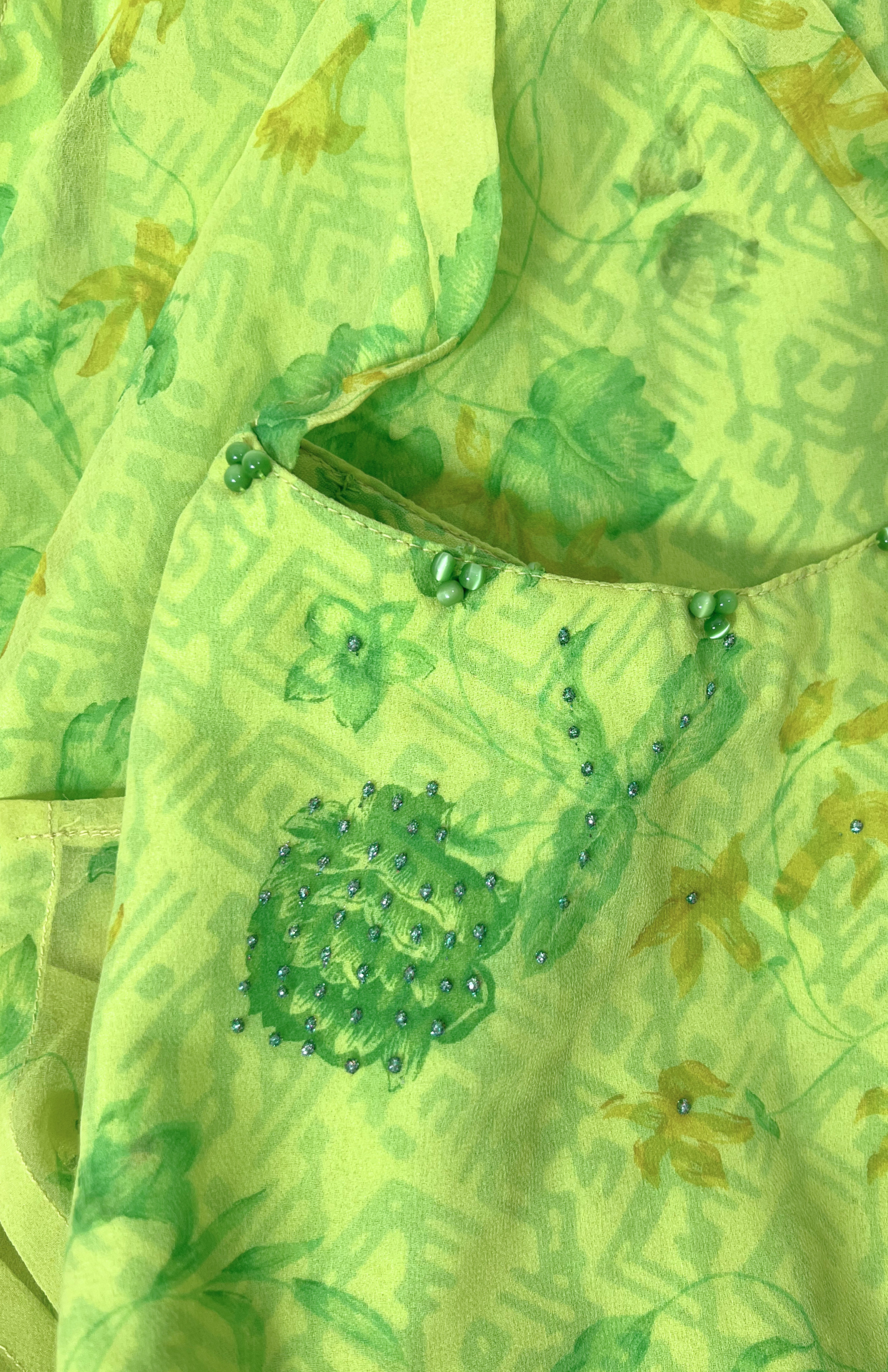 Fairy květinové šaty s korálkovou výšivkou a třpytivými detaily. Lehká šifonová vrstva a silnější podšívka vespod. Pěkný detail okolo krku.