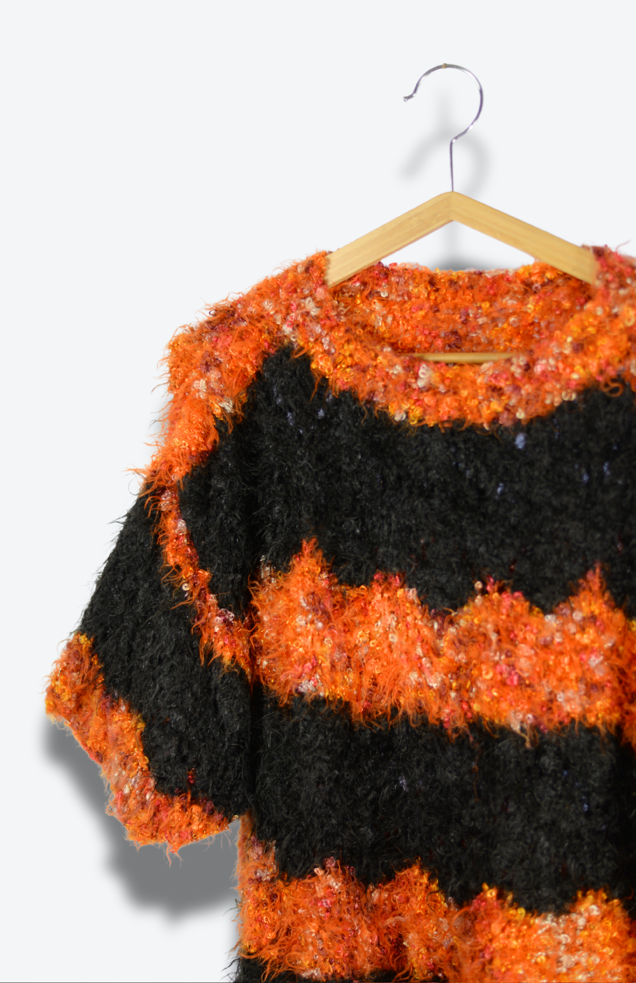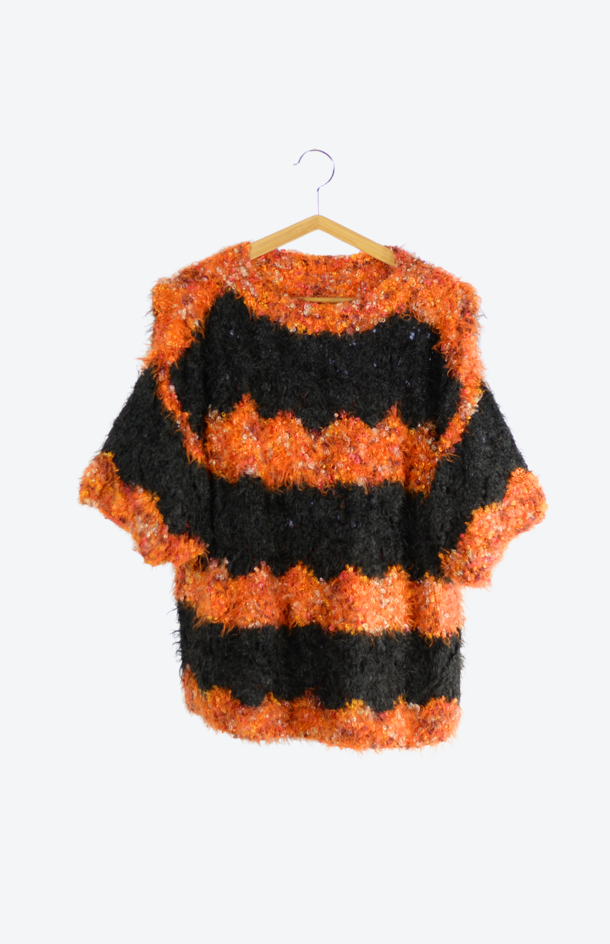 Fluffy střapatý svetr s krátkým rukávem. Lehce žíhaný, žinylkový úplet. Originální retro kousek.Stav: Ve skvělém stavu, bez vad.Materiál: bez cedulky