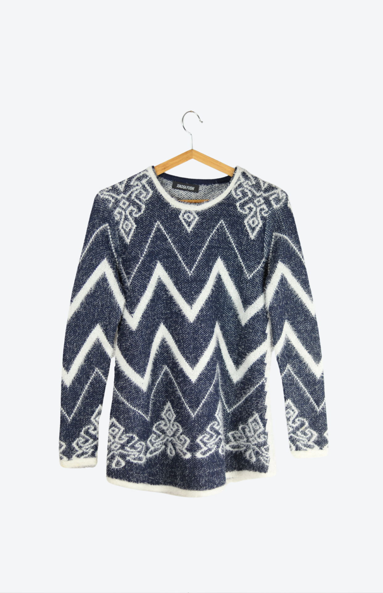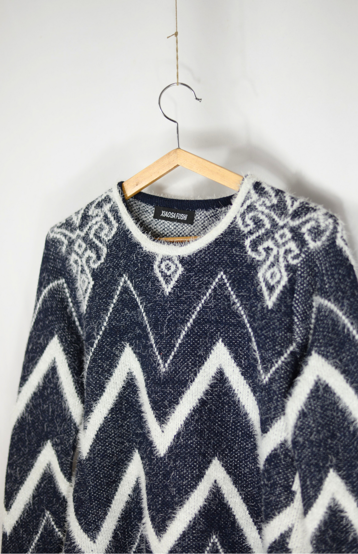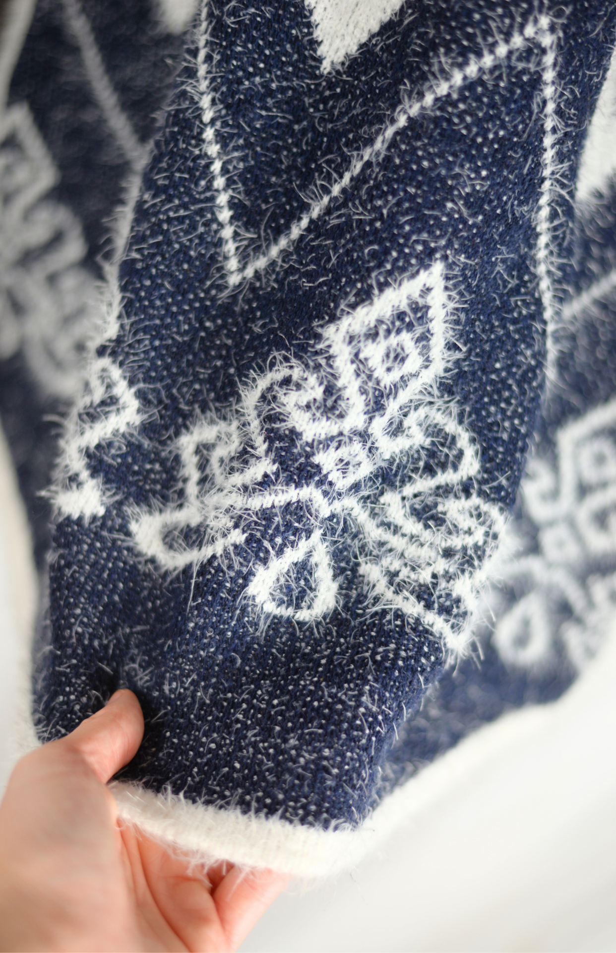 Vintage fluffy svetr se bílým vzorem. Vzorovaný po celé své ploše, hebký na omak. Středně silný úplet a rovný střih.