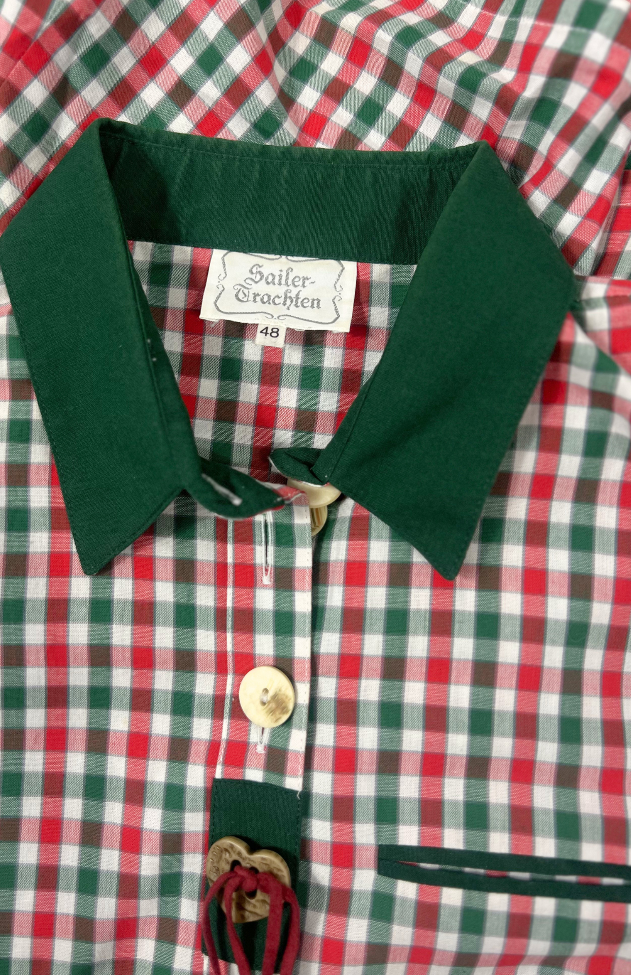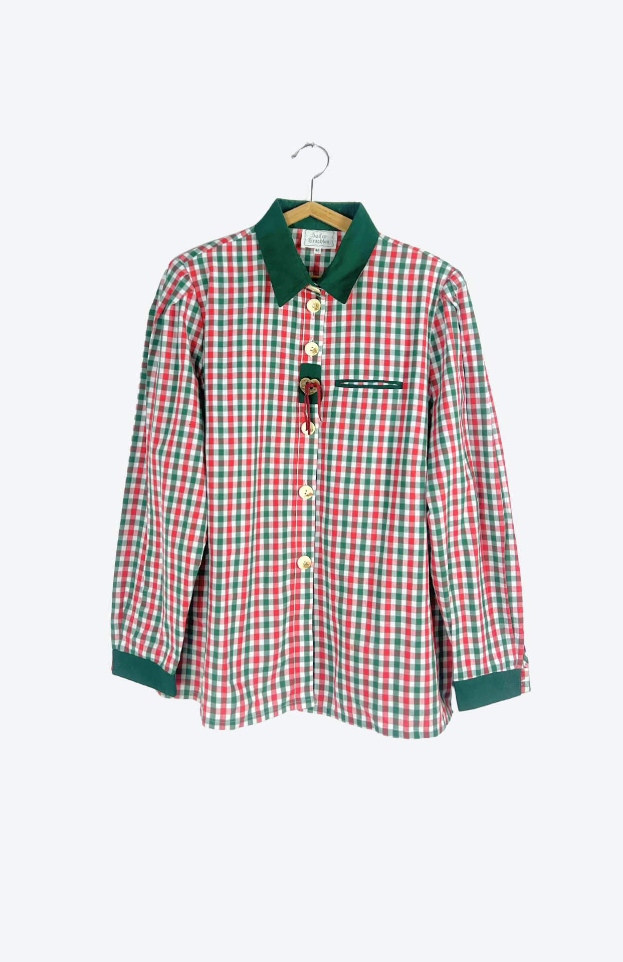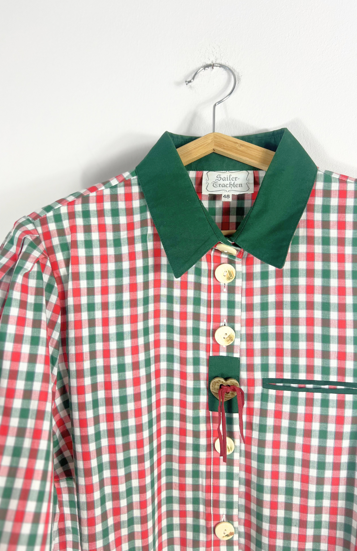 Folklorní kostkovaná košile s výšivkou. Má výrazné rustikální knoflíky a dřevěný srdcový s koženou šňůrkou. Tmavě zelené detaily a lemování.