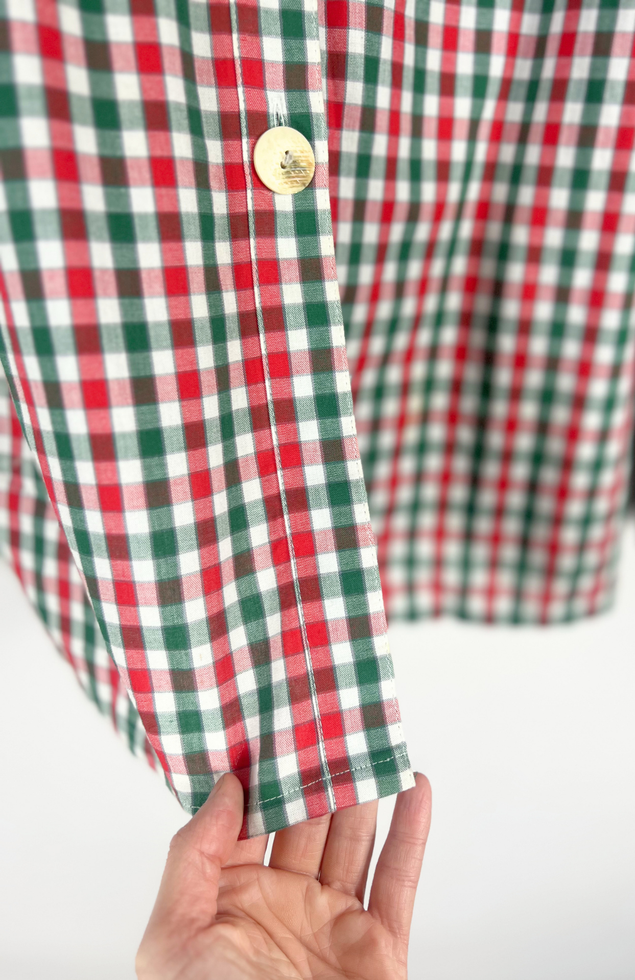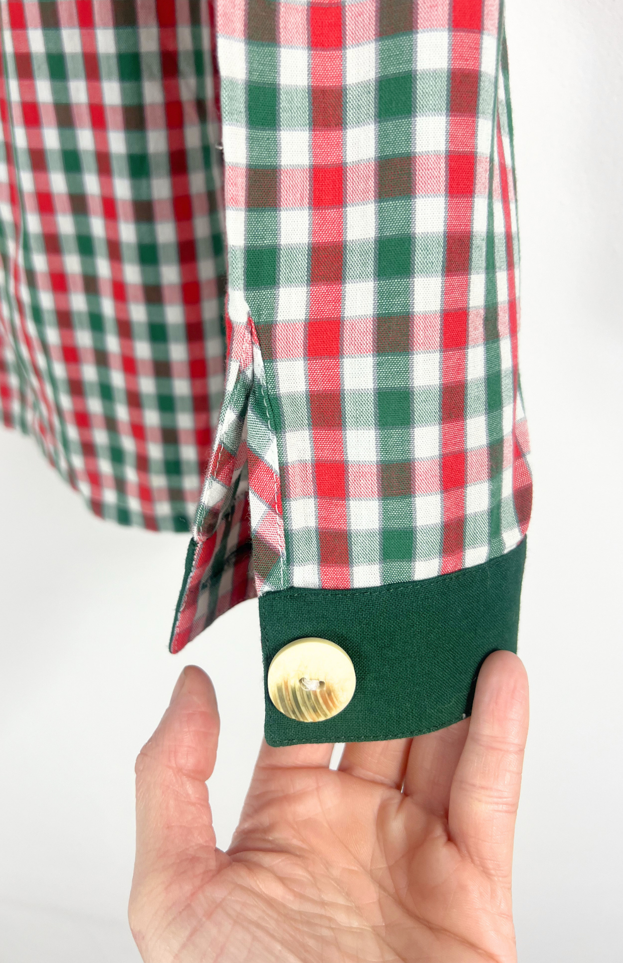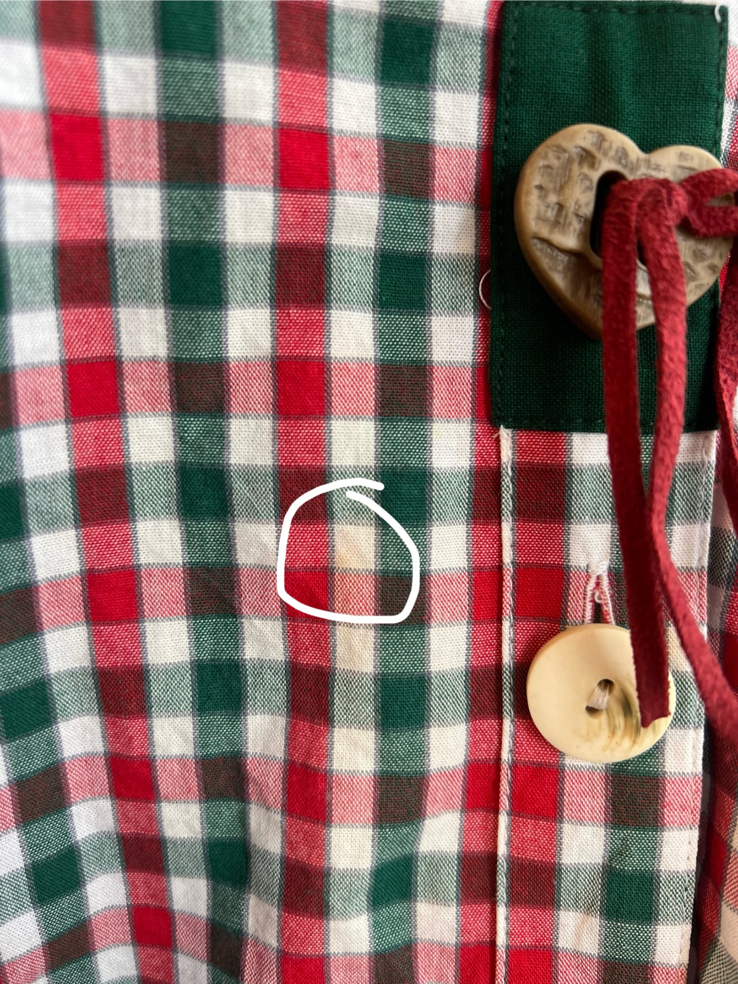 Folklorní kostkovaná košile s výšivkou. Má výrazné rustikální knoflíky a dřevěný srdcový s koženou šňůrkou. Tmavě zelené detaily a lemování.