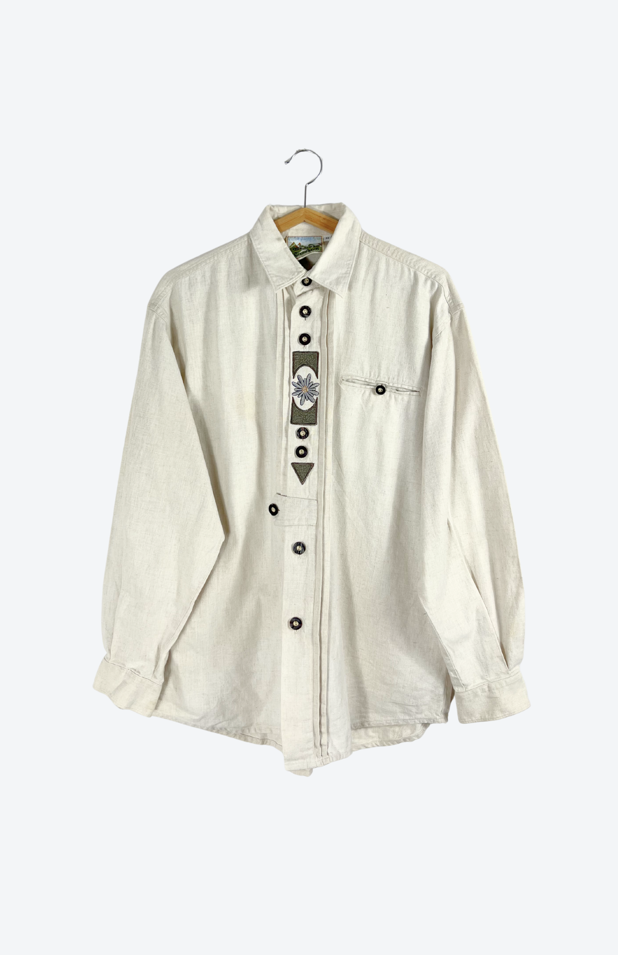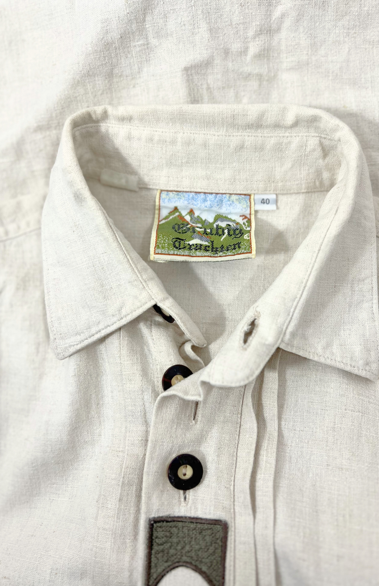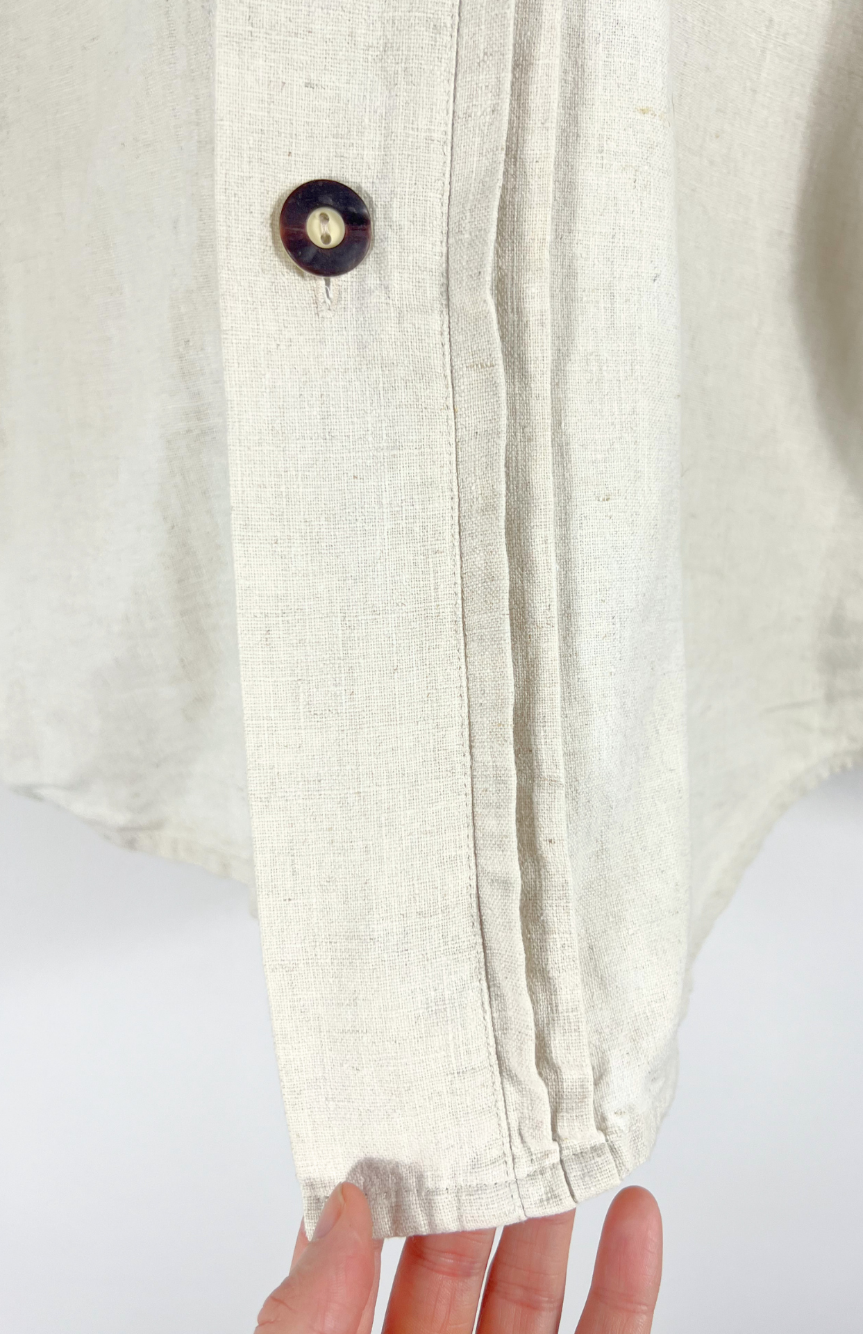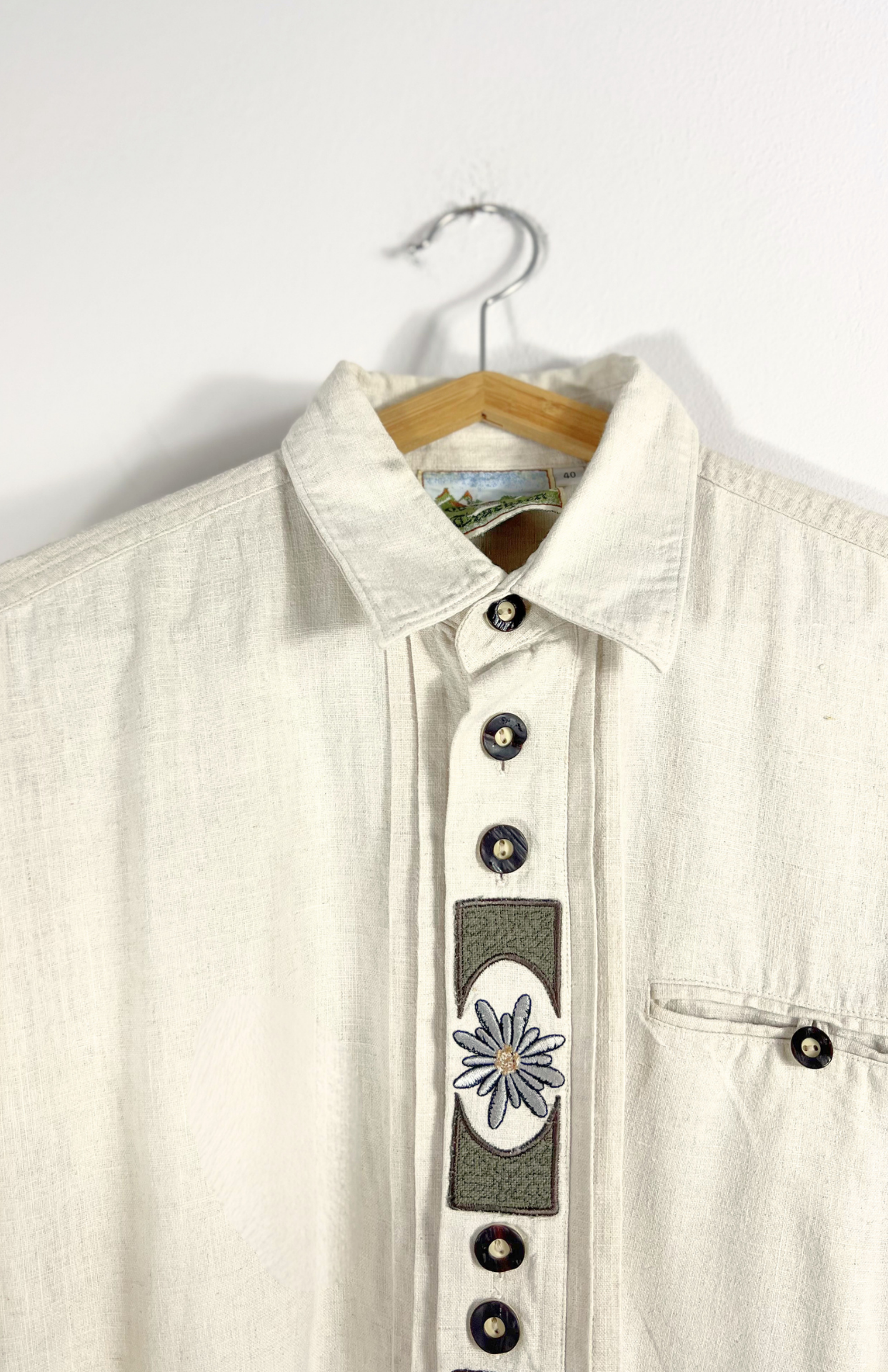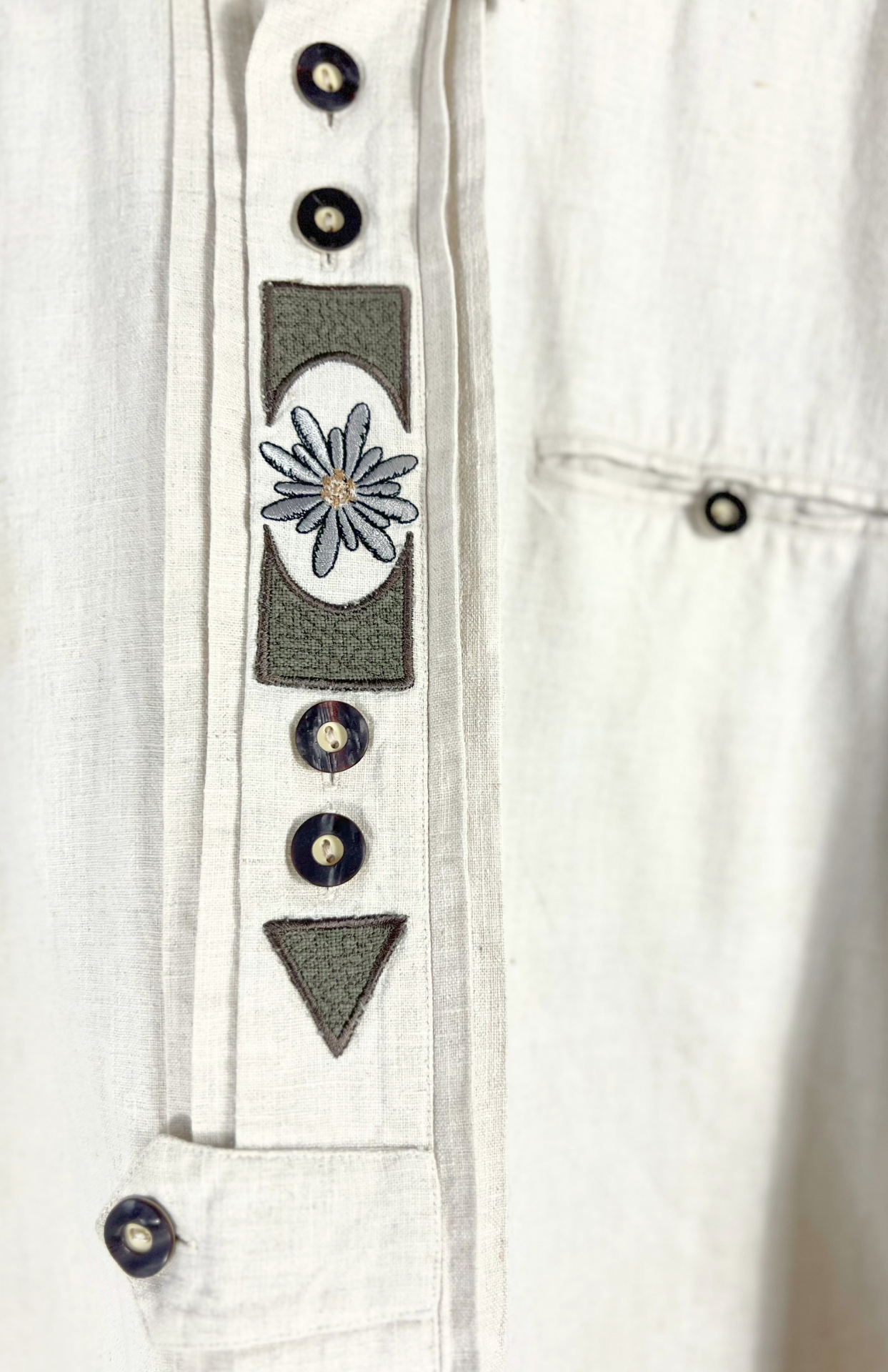 Folklorní lněná vintage košile s výšivkou. Příjemné silnější plátno ze lnu. Na středu květinová výšivka a výrazné rustikální knoflíky.