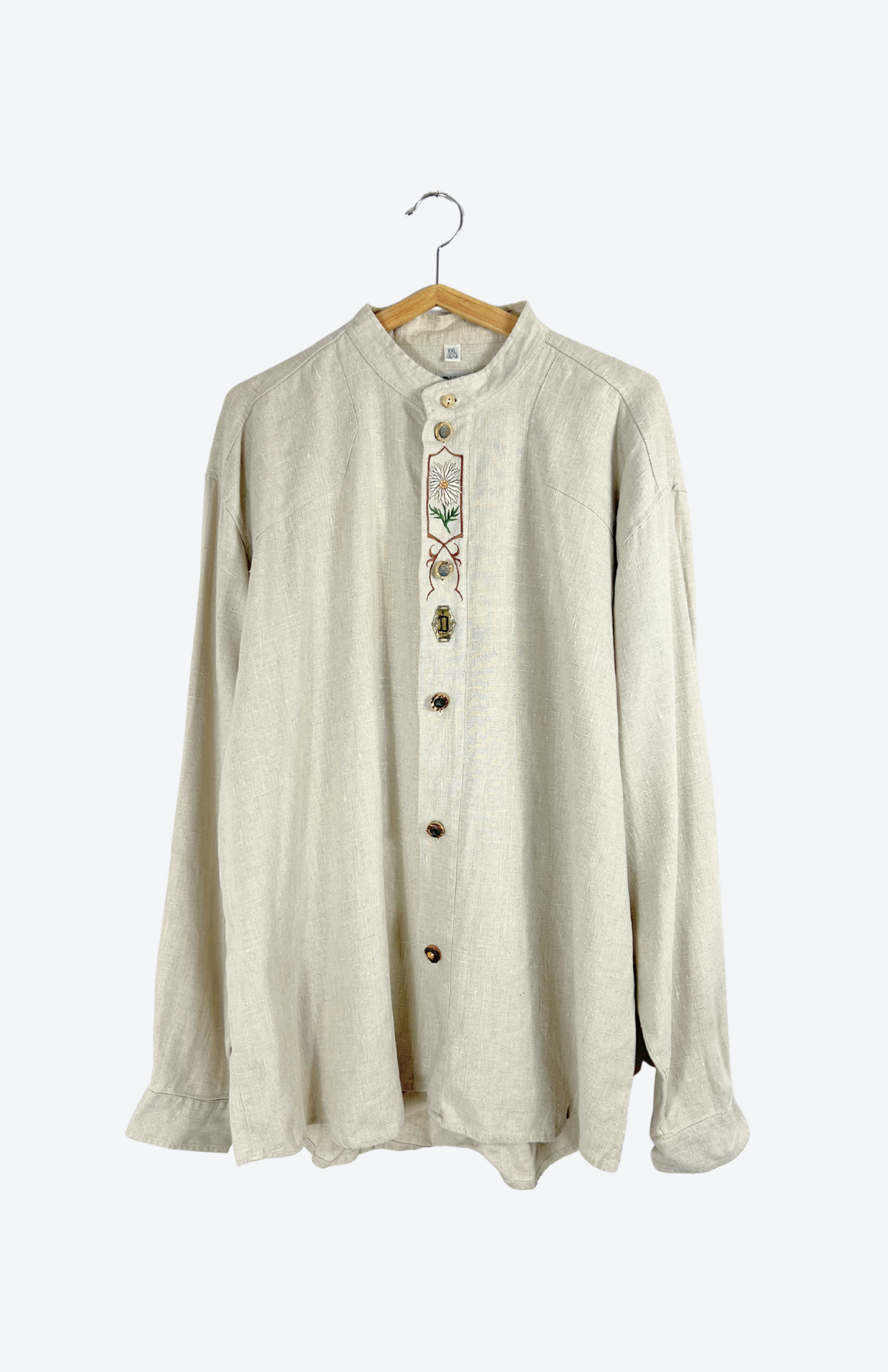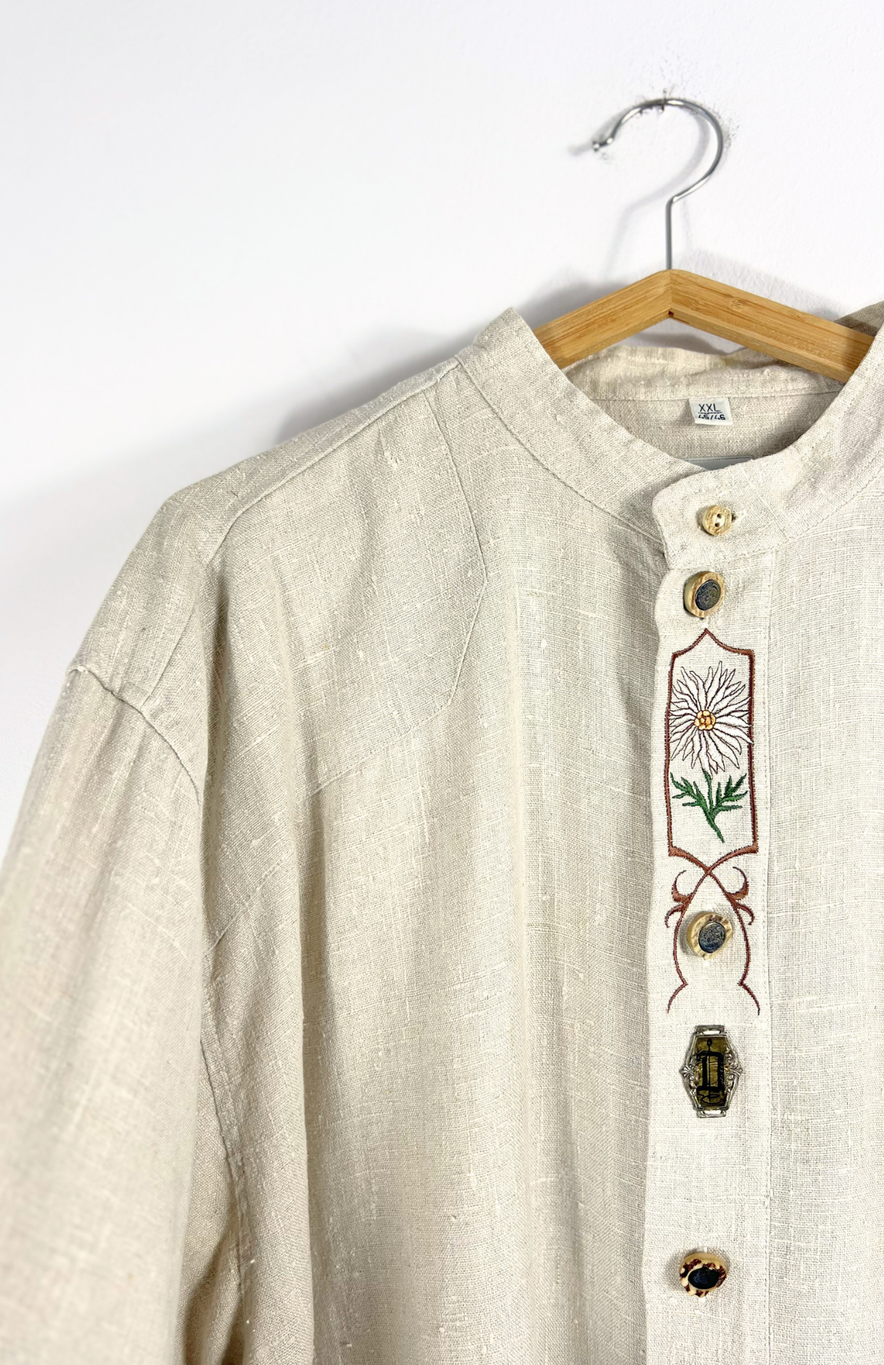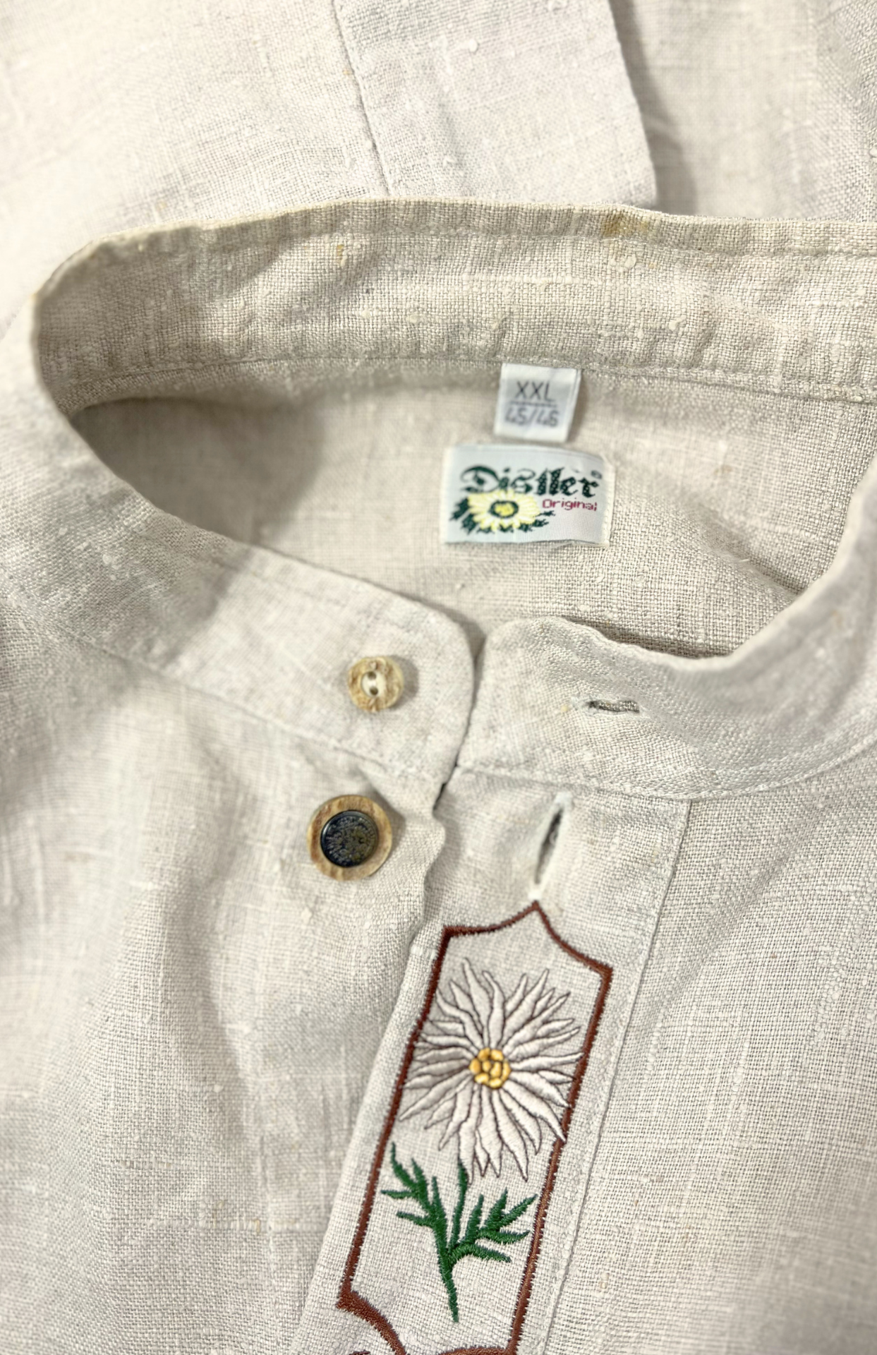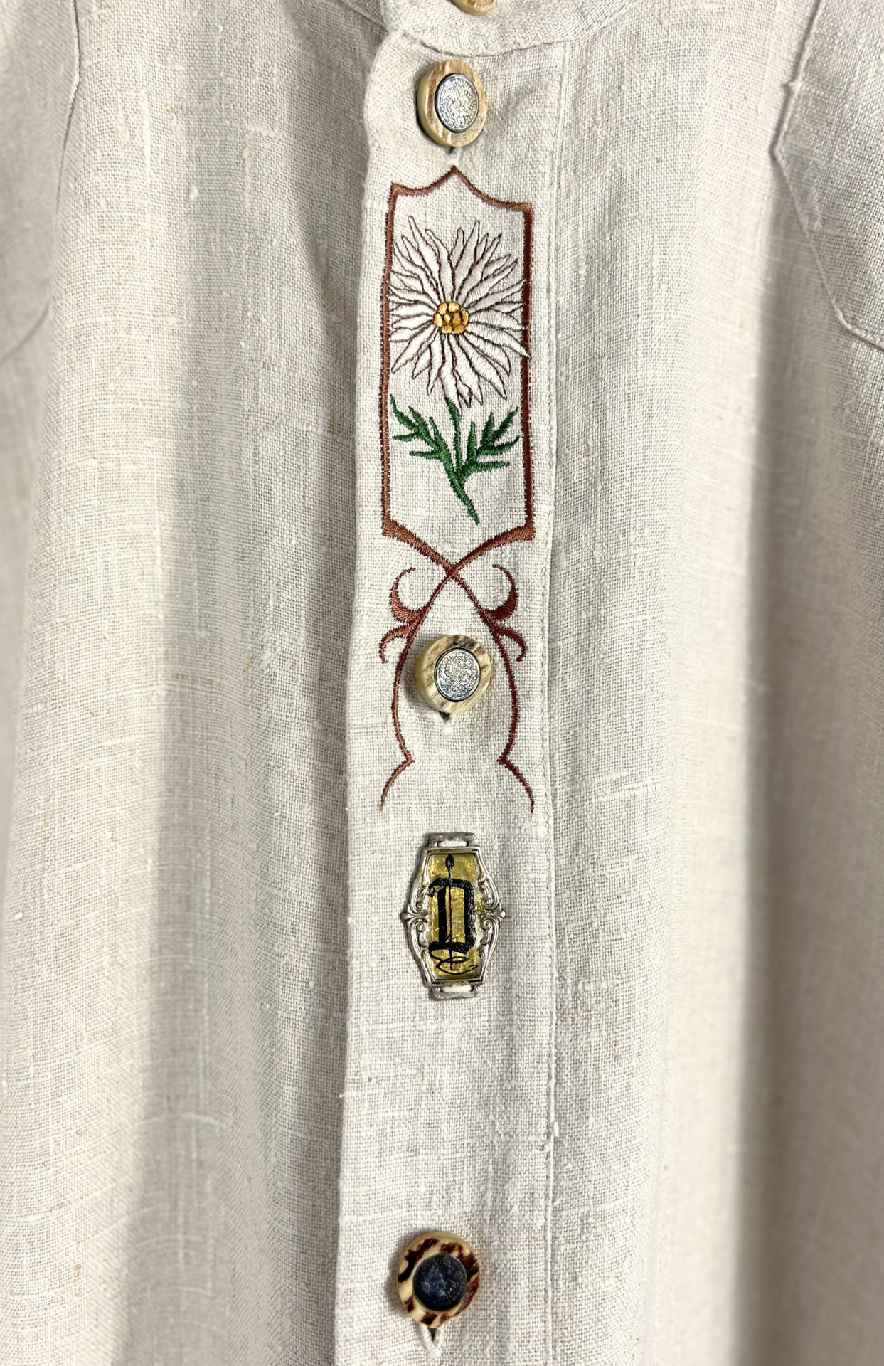 Folklorní lněná vintage košile s výšivkou. Příjemné silnější plátno ze lnu. Na středu květinová výšivka, iniciál "D" a výrazné rustikální knoflíky. Pánská / oversize unisex.